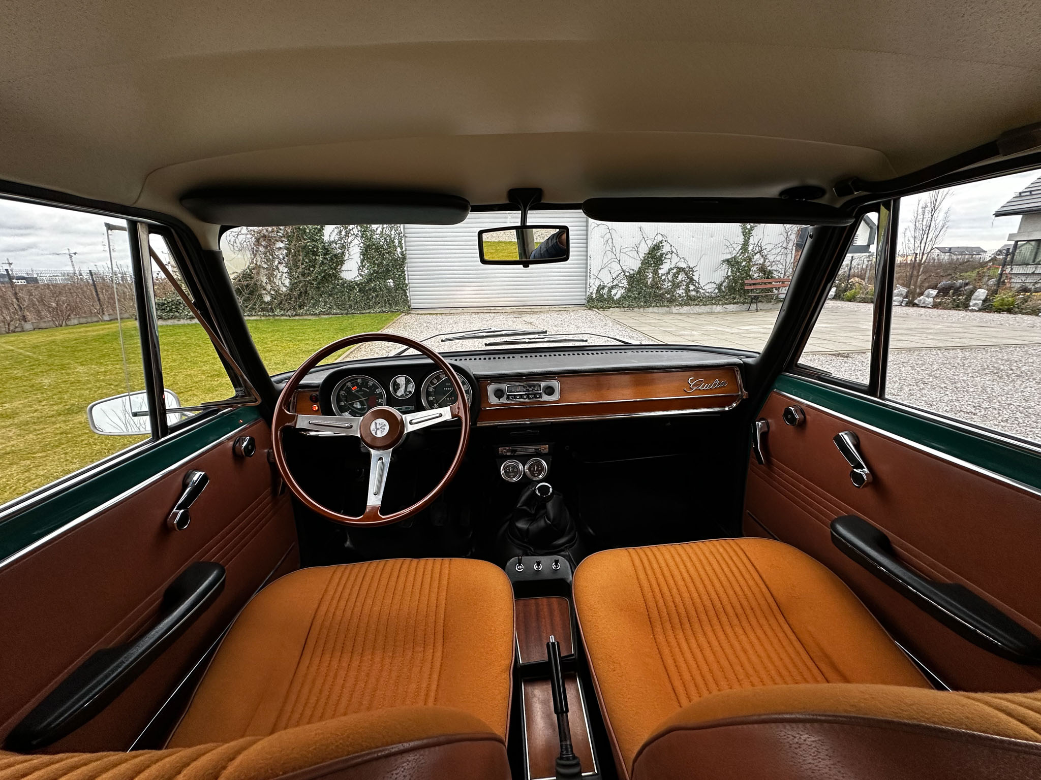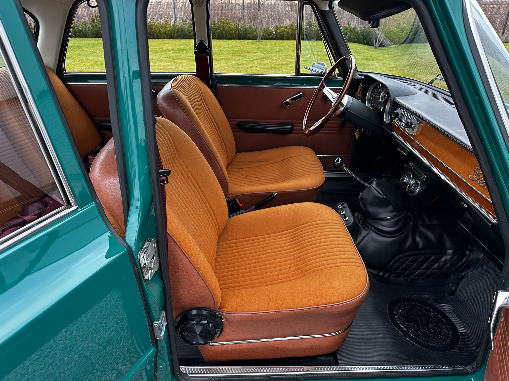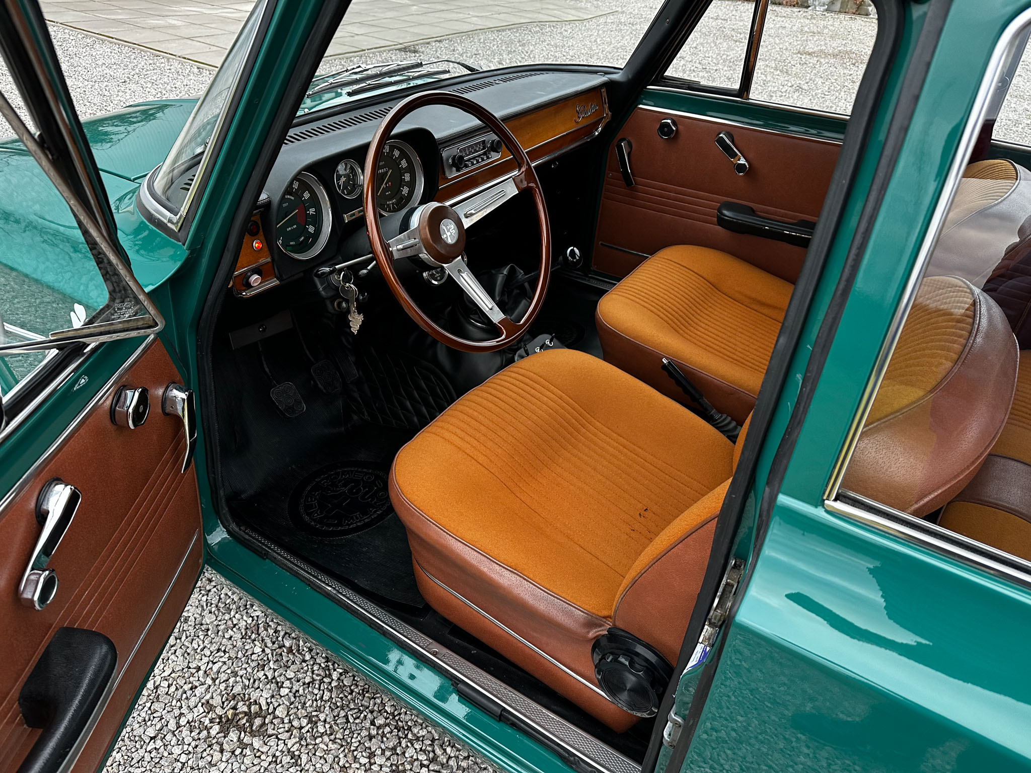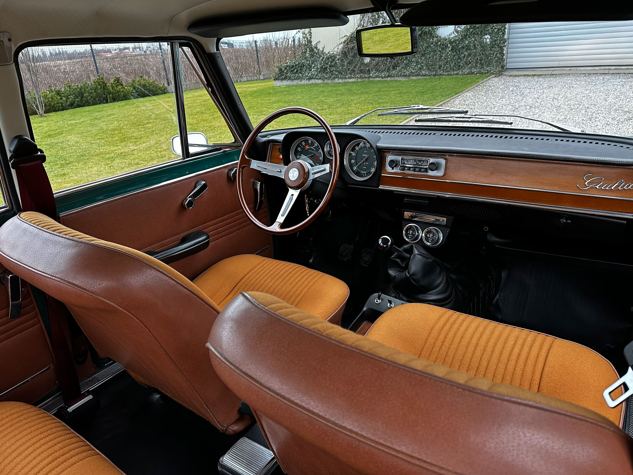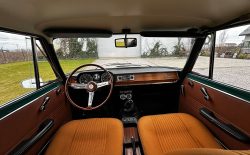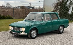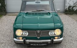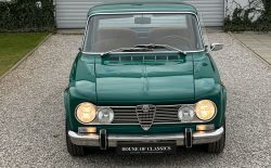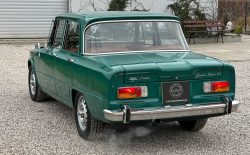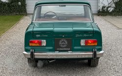 Alfa Romeo Giulia Super 1300 z 1973 roku. Auto posiada (najprawdopodobniej) minimalny przebieg 98.000 km i przeszło pełną odbudowę mechaniczną o wartości 15.000 CHF w Szwajcarii. Choć upłynęło od tamtej pory 11 lat to silnik nadal pracuje bardzo świeżo, skrzynia o 5 biegach zaskakuje swoją cichą pracą, a zawieszenie wyposażone w amortyzatory Bilstein B6 i sprężyny Eibacha pozwala na fantastyczne prowadzenie Julii. Auto przeszło także potwórne lakierowanie (nie wiem czy w Szwajcarii czy w Luksemburgu) na jej oczywiście oryginalny i bardzo poszukiwany kolor Verde Pino. Zostało to zrobione na bardzo wysokim poziomie. Wnętrze auta jest w 100% oryginalne i w fantastycznym stanie. To zdecydowanie najlepsza Giulia, w najlepszym możliwym stanie jaką widziałem. Przeszła detailing oraz pełen serwis. Jeździ cudownie.