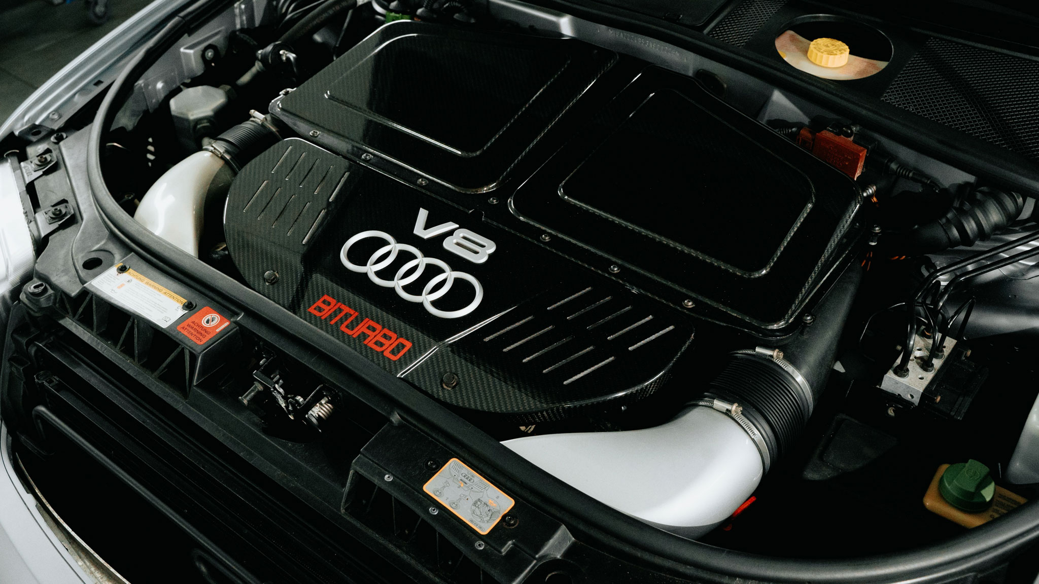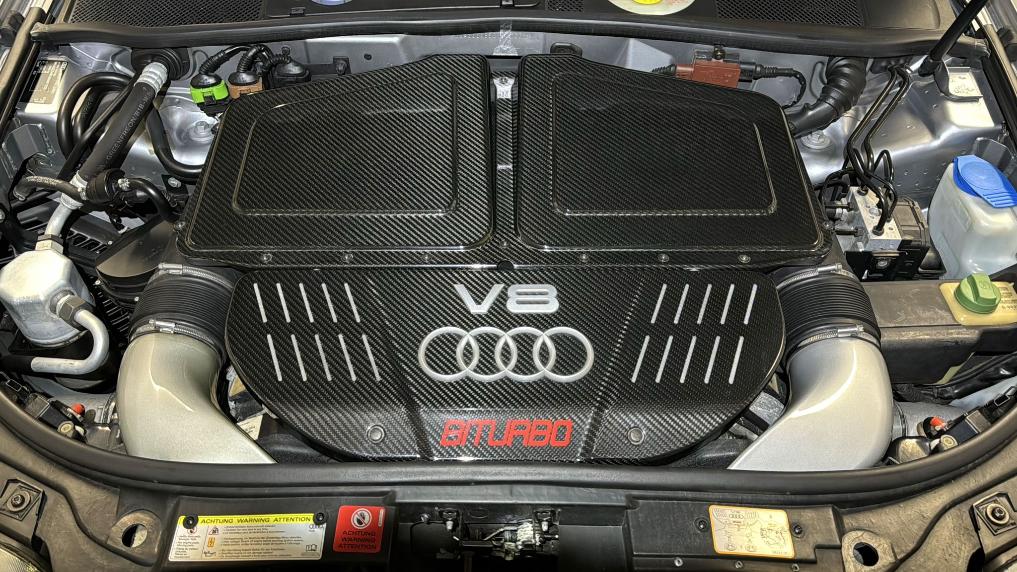 Silnik: 4.2 V8 biturbo (450 KM), oryginalny, bez ingerencji tuningowej. Skrzynia: 5-biegowa automatyczna Tiptronic. Napęd: quattro. Sportowy, fabryczny układ wydechowy ze stali nierdzewnej. Kompleksowa renowacja zawieszenia (rozebranie, weryfikacja, oksydowanie śrub). Odnowiony układ hamulcowy z zastosowaniem oryginalnych okładzin Audi. Geometria ustawiona w stacji kontroli pojazdów (2024-01-27). Diagnostyka komputerowa z dnia 2024-02 – brak błędów.