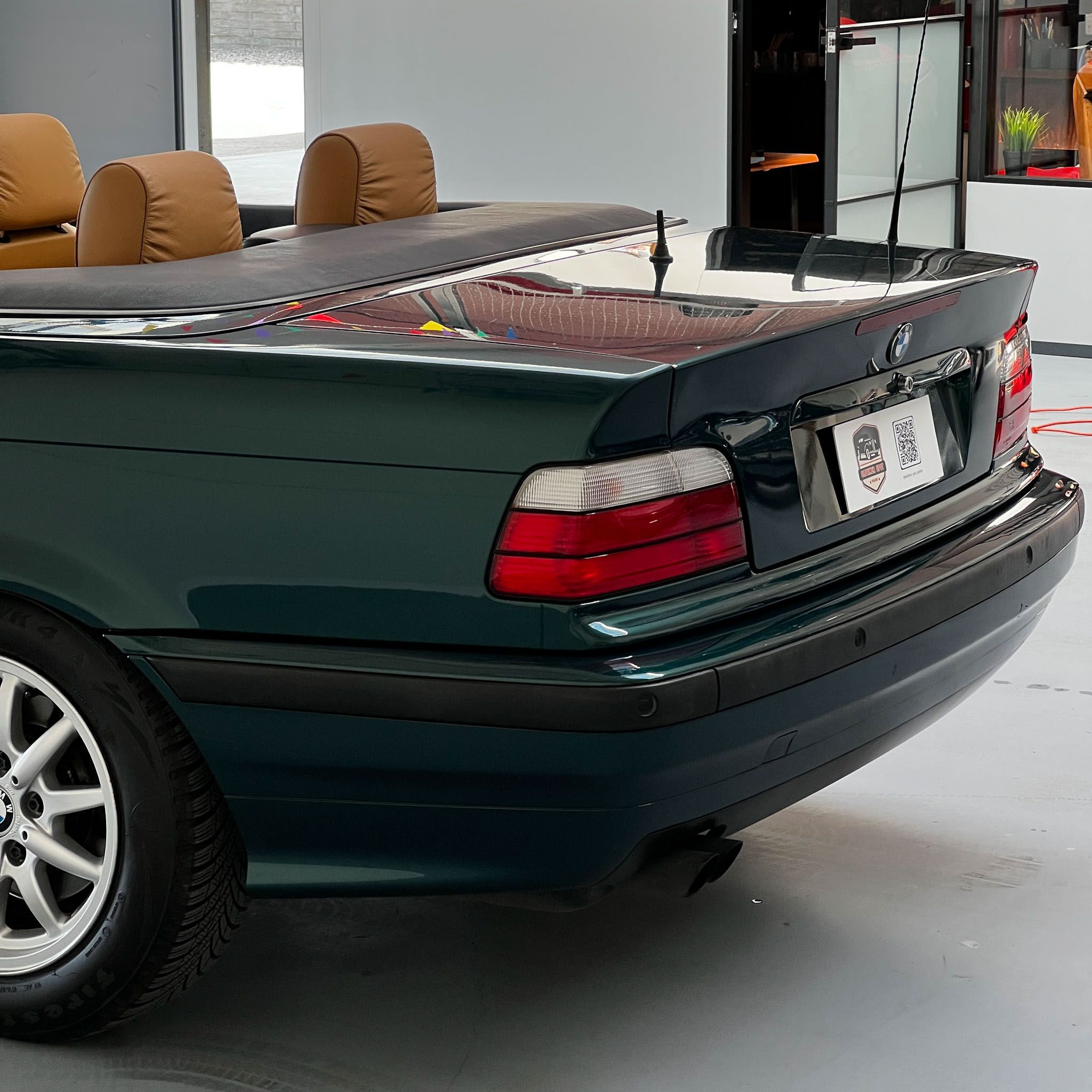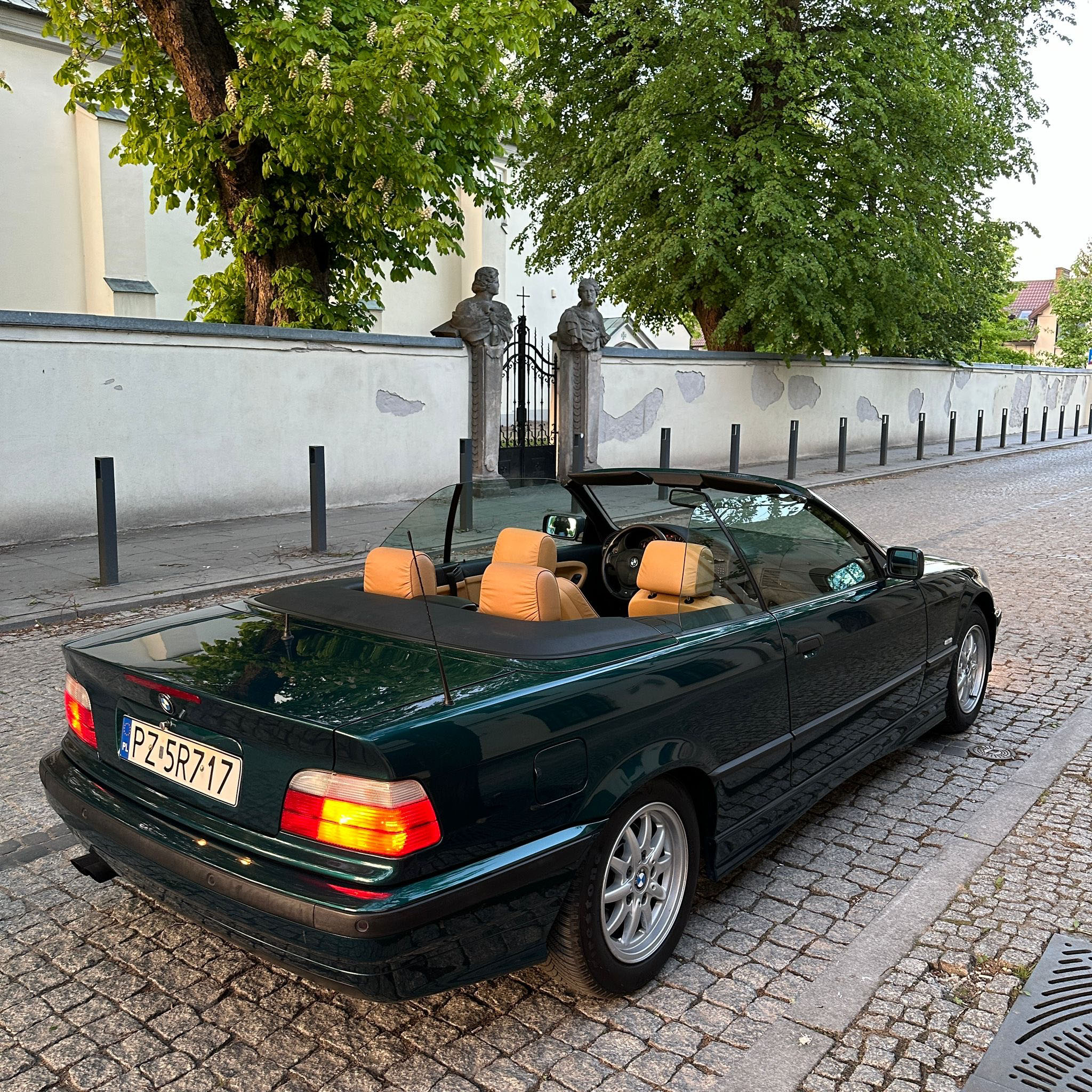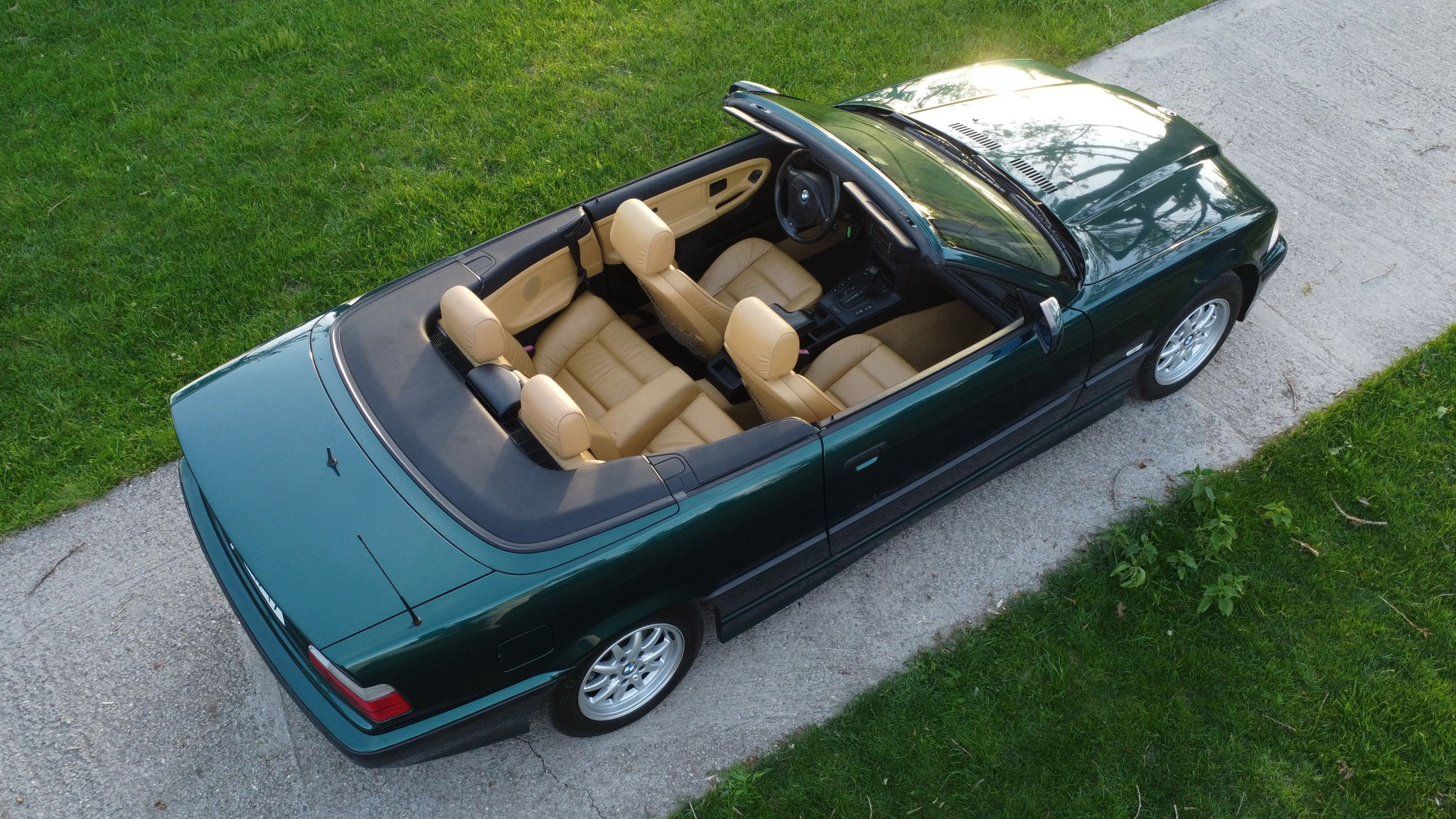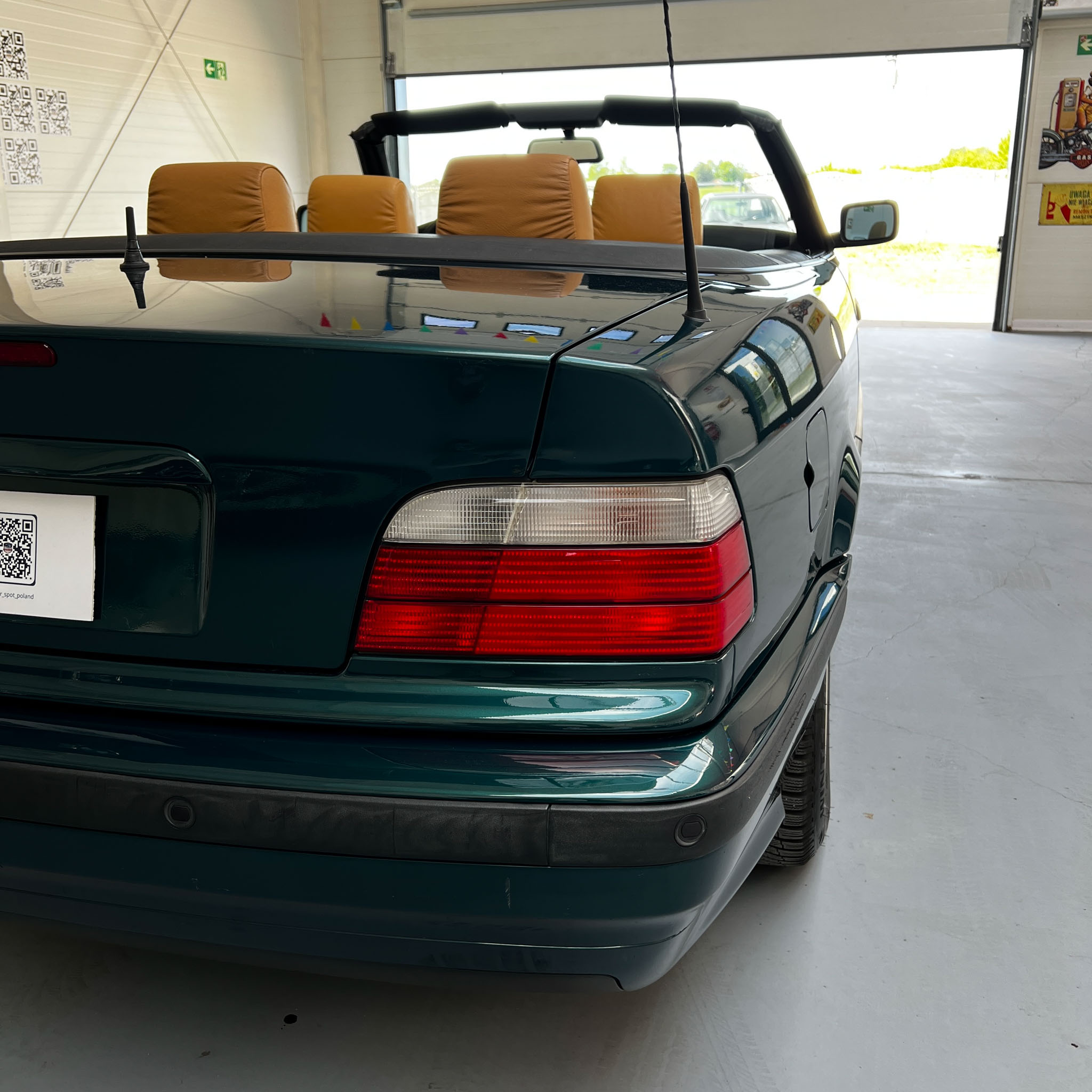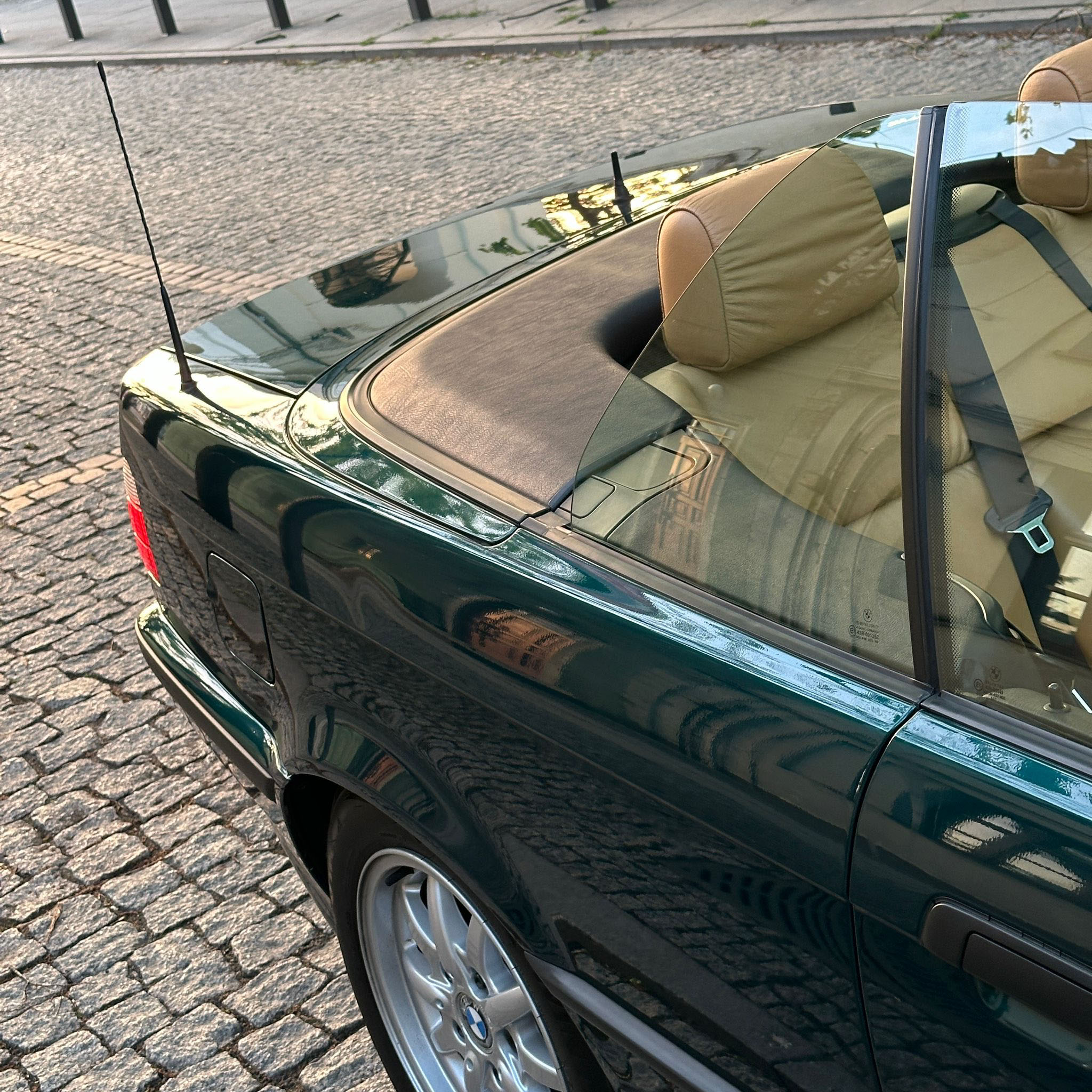 Znaleźliśmy. Świetne E36 i do tego cabrio! Cała (poza maską) w oryginalnym lakierze z minimalnymi śladami upływu czasu, kilka drobnych rysek i micro niedoskonałości – nic więcej niż można byłoby się spodziewać po kilkuletnim już aucie. Stan karoserii określamy na dużo powyżej przeciętnej dla 27-letniego kabrioleta. Prosta i śliczna – bostongreen jej pasuje!