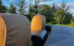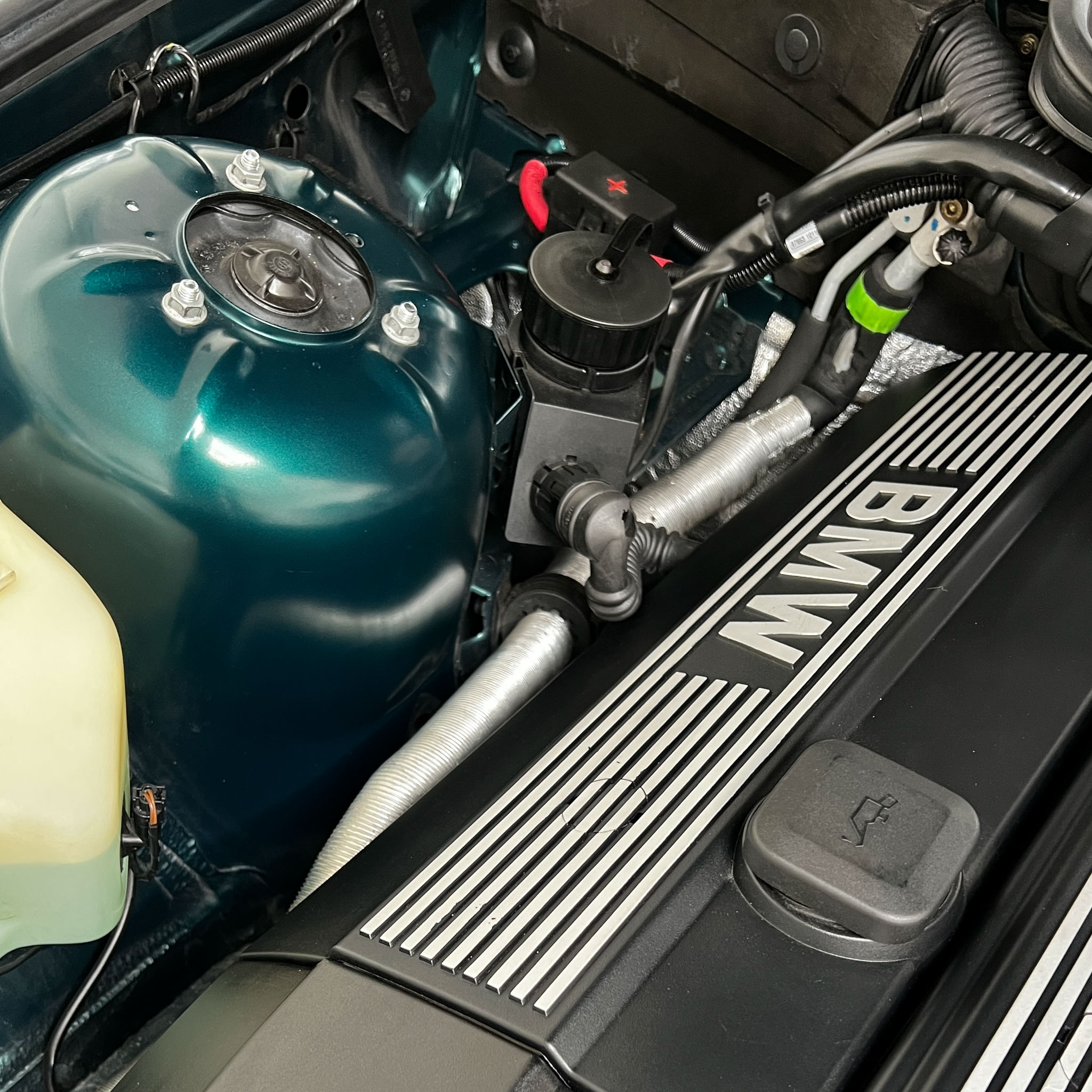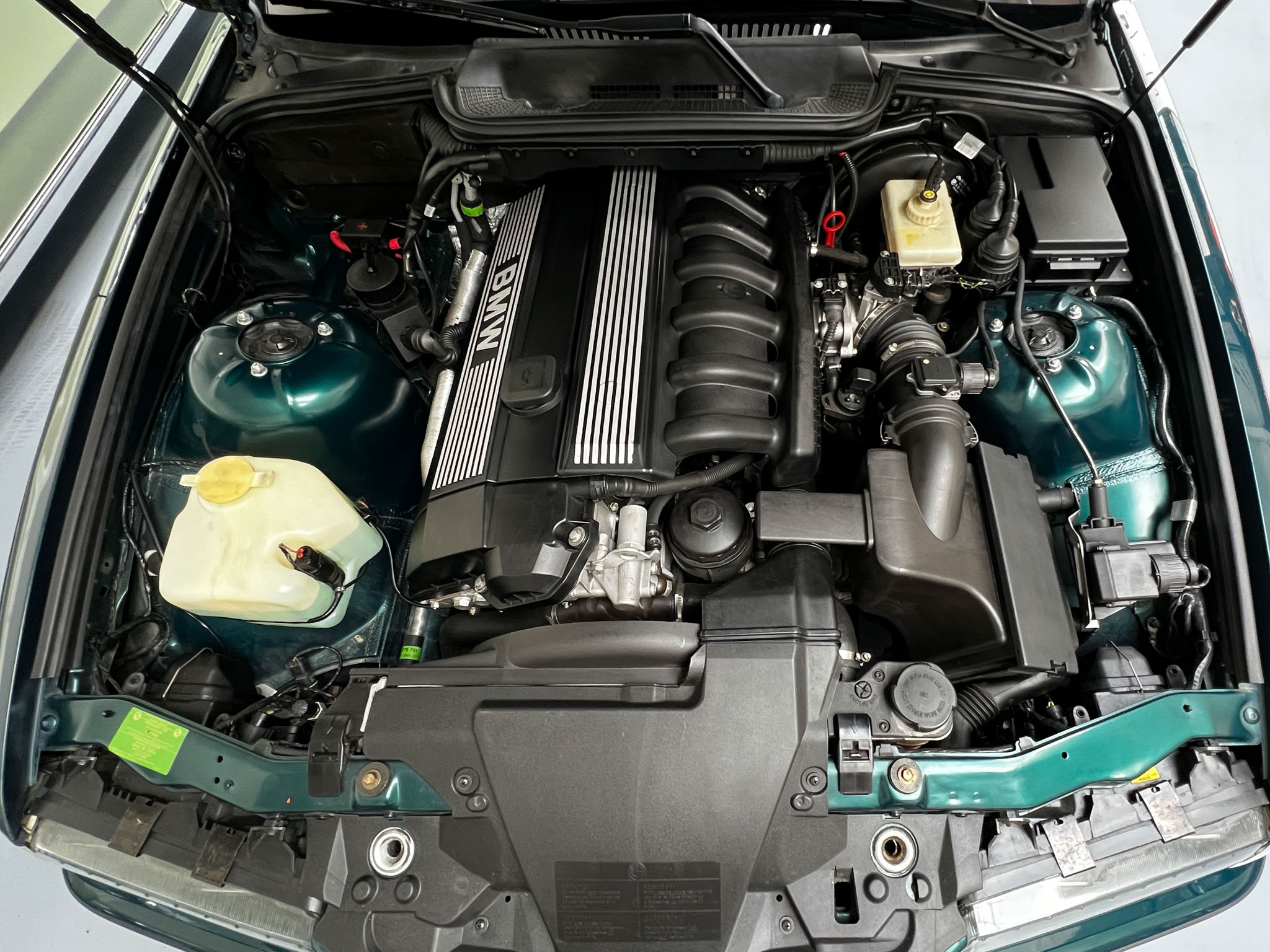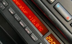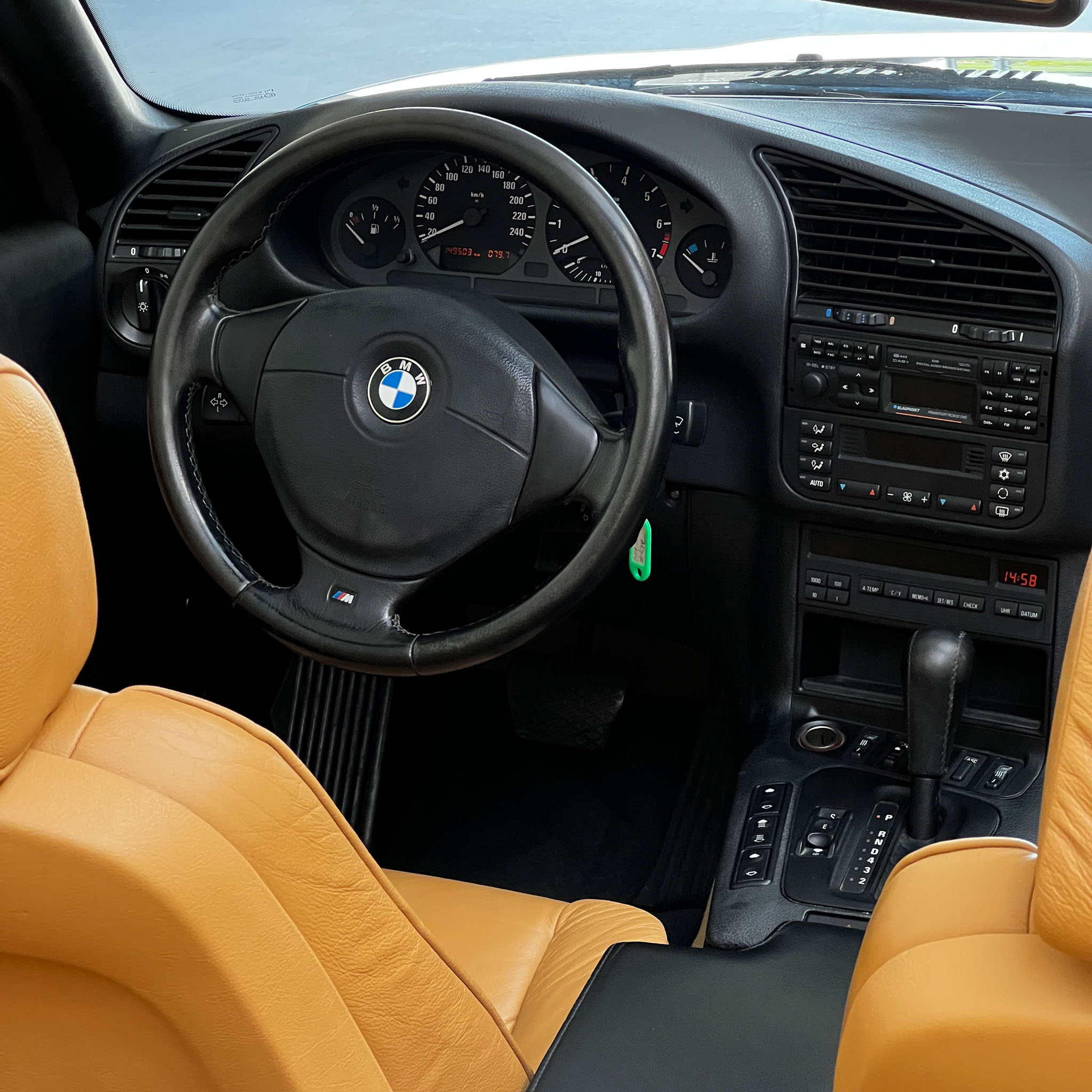 Nasz egzemplarz to wspaniale utrzymany samochód ze Szwajcarii do tego w boskiej konfiguracji. Warto podkreślić, że w stosunku do seryjnie słabiej wyposażonych popularnych E36 z mniejszymi silnikami, nasza wyposażony jest w automatyczną klimatyzację, radio z bluetooth i telefonem (działa perfekcyjnie), podgrzewane fotele, dwa komplety welurowych dywaników (jasne i czarne), czujniki parkowania tył, komputer pokładowy – wszystko sprawne. Skóra na fotelach jest miękka i sprężysta, plastiki wciąż mają swoją strukturę i ten charakterystyczny dla nowych BMW zapach. Na wyświetlaczach każdy piksel jest sprawny, żadnych przebarwień lub cieni.