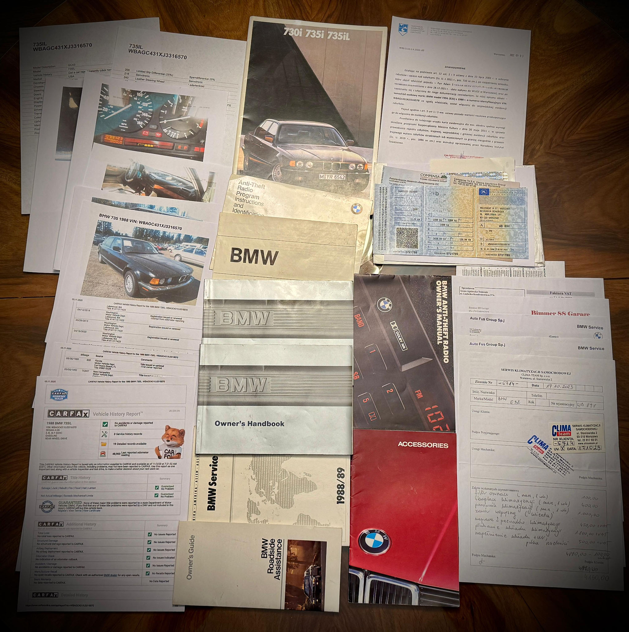 Oferowany egzemplarz wyprodukowano na rynek amerykański, sprzedany na Florydzie, następnie większość życia spędził u jednego właściciela w przyjaznym klimacie stanu Waszyngton. Zaimportowany do Polski przez miłośnika klasycznych BMW dopiero w roku 2021. Zarejestrowany jako pojazd zabytkowy i używany okazjonalnie od sezonu 2022 r. prywatnie przez Prezesa Fundacji związanej z klasyczną motoryzacją w Polsce. Żółte tablice otrzymał na podstawie wpisu do ewidencji wojewódzkiego mazowieckiego konserwatora zabytków (nie muzeum, nie kolekcja). Oczywiście posiada „czysty” raport Carfax oraz dokumentację zdjęciową z importu.