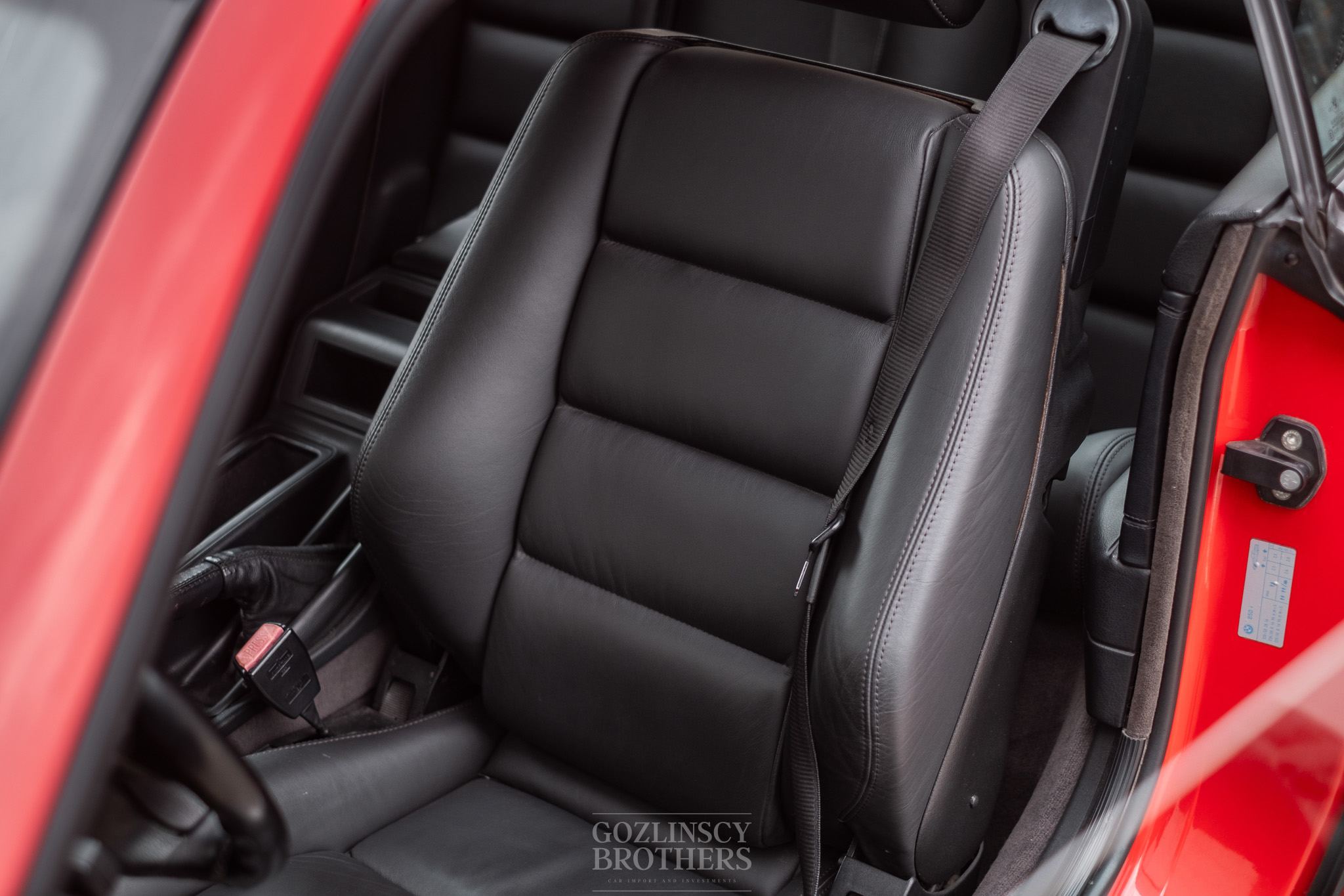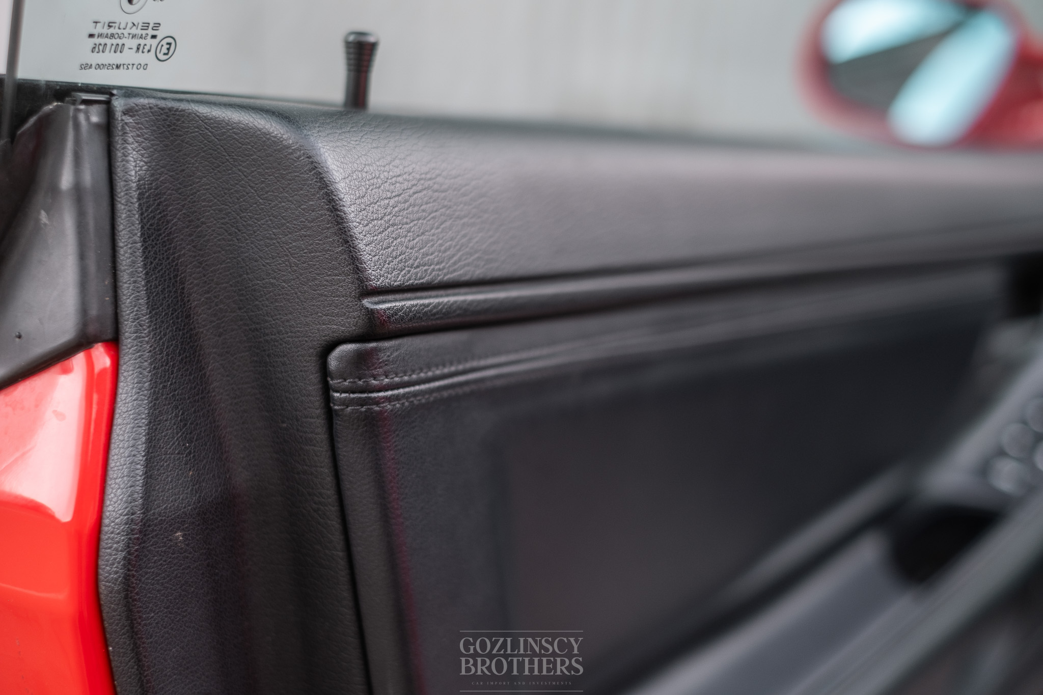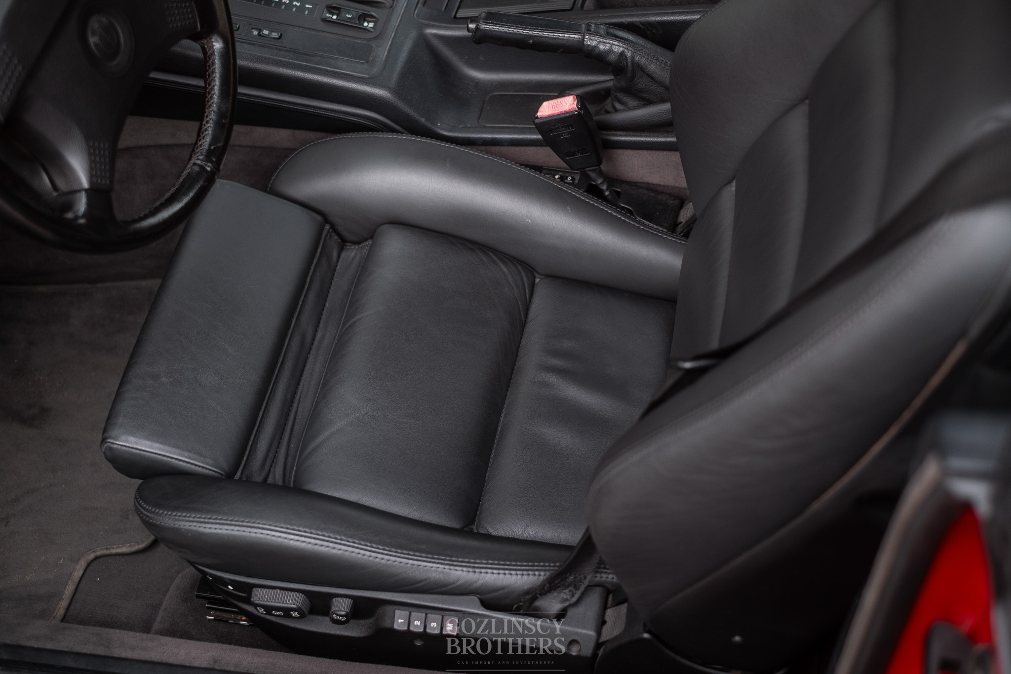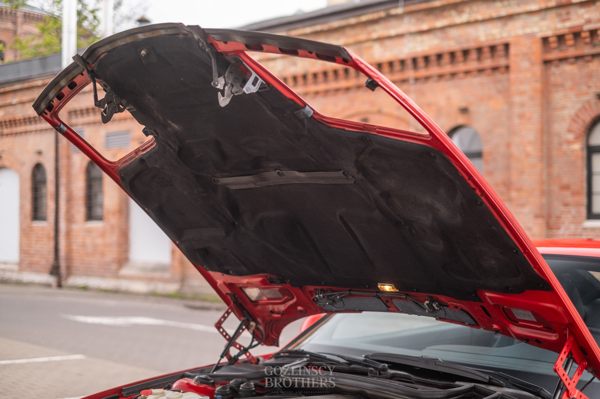 Wnętrze zachowane w świetnym stanie. Piękna i najbardziej pożądana kompozycja kolorystyczna: Brilliantrot z czarną skórzaną tapicerką i podsufitką z Alcantary.