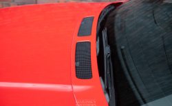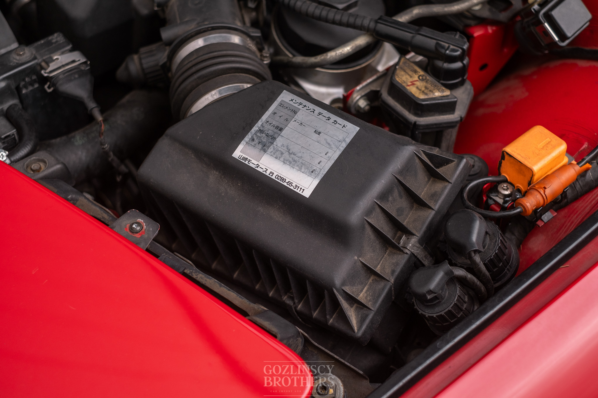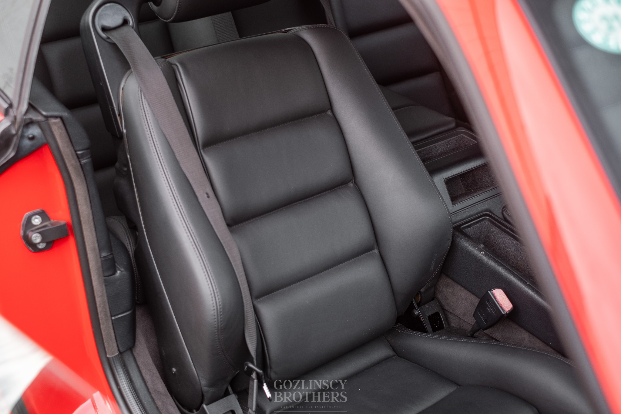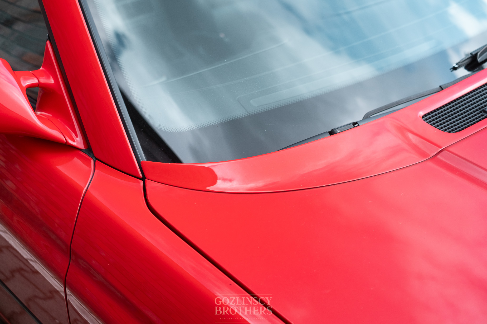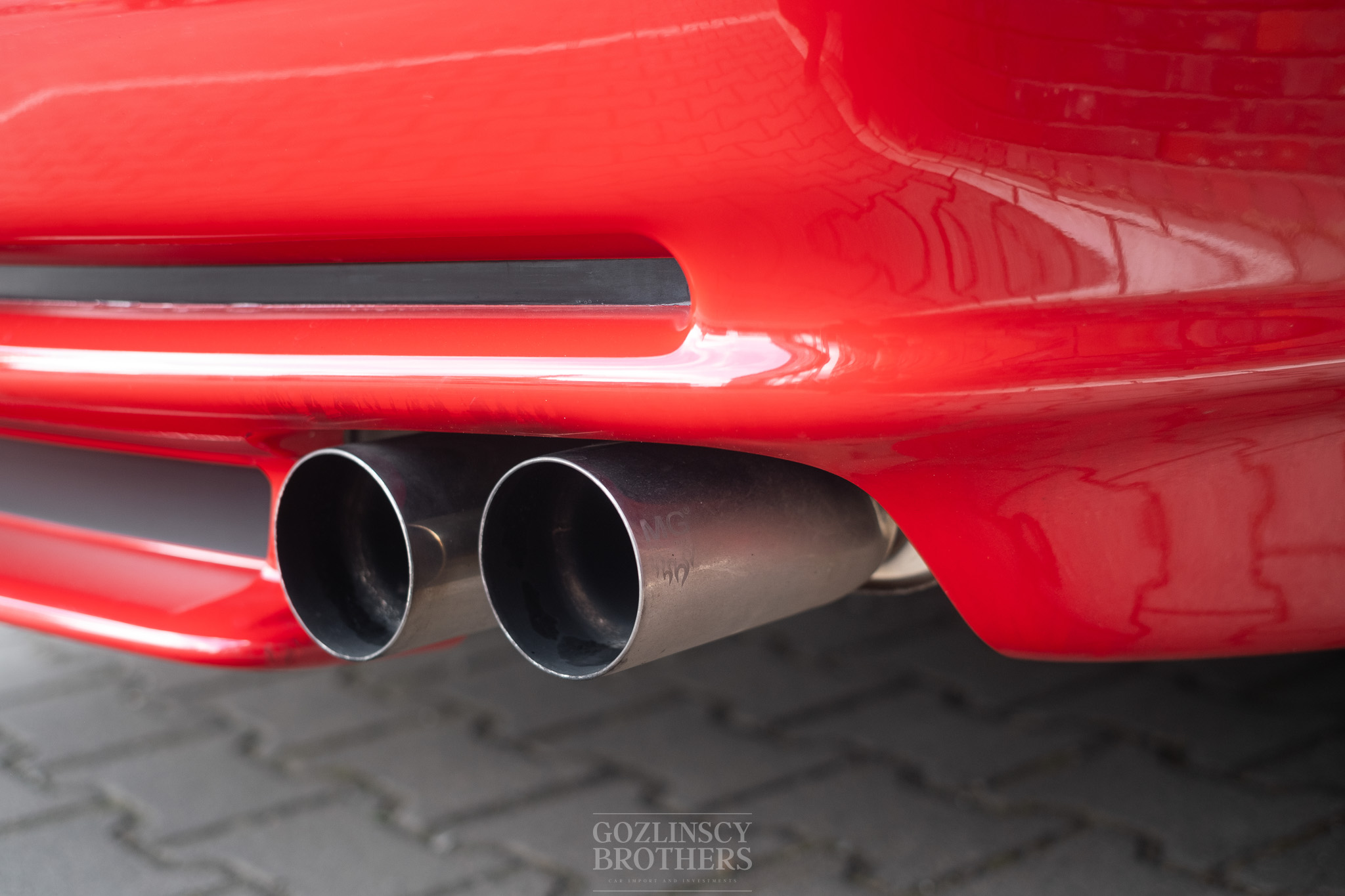 Wnętrze zachowane w świetnym stanie. Piękna i najbardziej pożądana kompozycja kolorystyczna: Brilliantrot z czarną skórzaną tapicerką i podsufitką z Alcantary.
