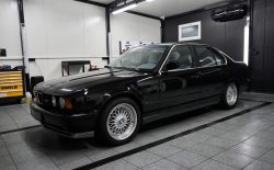 BMW M5 E34 było czymś więcej, niż szybka limuzyną. Debiutowało w 1988 roku jako druga generacja modelu M5. Jego mocny sześciocylindrowy silnik (S38B36 wywodzący się z jednostki napędzającej legendarne BMW M1) przekazuje moc 315 KM na tylną oś i gotowy jest rozpędzić auto do setki w nieco ponad 6 sekund, a precyzyjny układ kierowniczy i sportowe zawieszenie pozwalają połączyć szybką i precyzyjną jazdę z komfortem. Jak można było przeczytać w 1990 roku w magazynie Autocar & Motor, BMW M5 „ma najwyższą prędkość maksymalną, najlepsze przyspieszenie na różnych biegach, najlepszy kompromis między prowadzeniem a komfortem jazdy i najlepszy stosunek osiągów do zużycia paliwa wśród samochodów mogących przewozić cztery dorosłe osoby wraz z bagażami”. Całkowita produkcja zmieściła się w 12254 egzemplarzach, przy czym prezentowany egzemplarz przedliftowy z silnikiem 3,6 l to jedna z 8344 wyprodukowanych sztuk.
