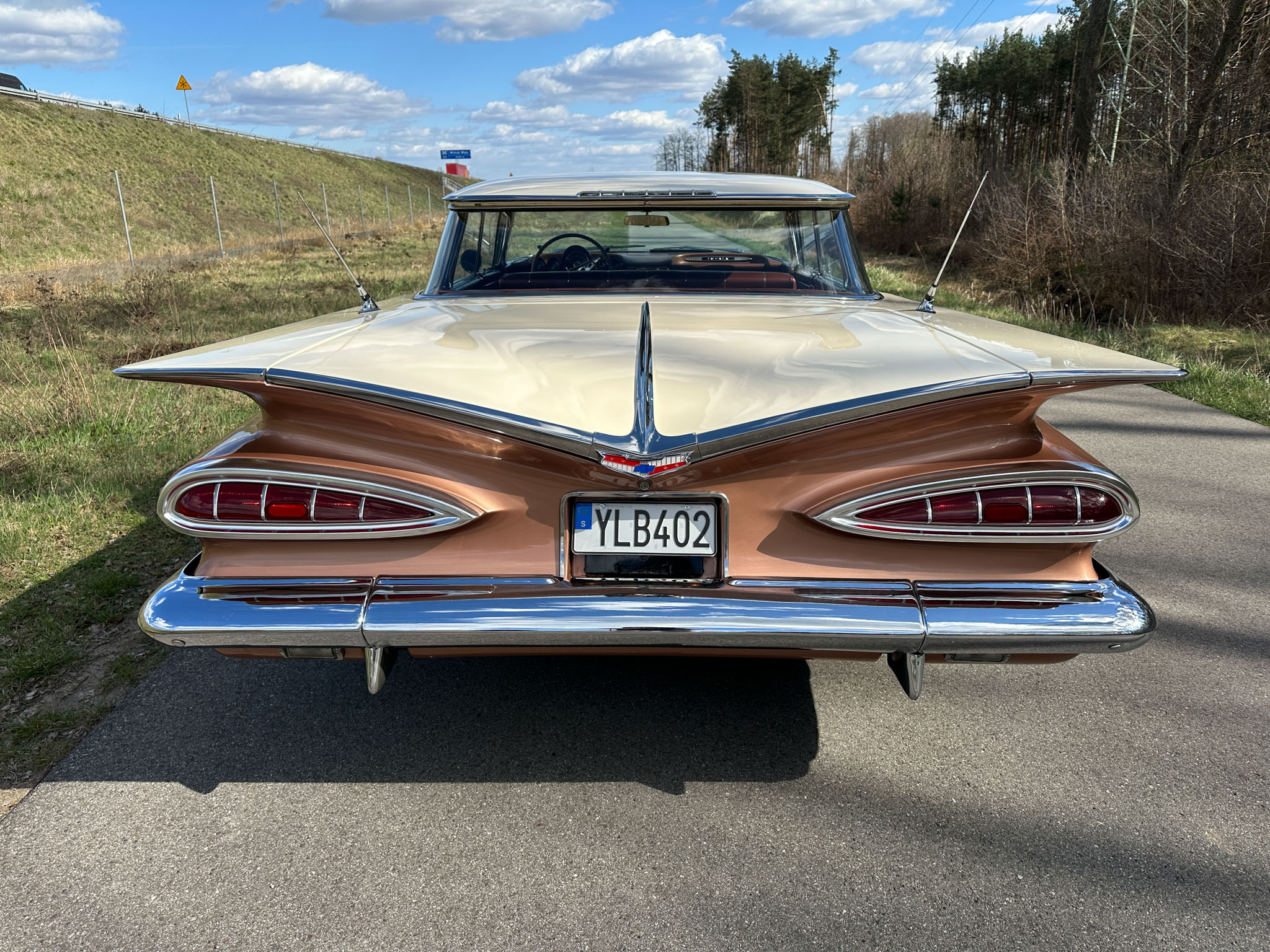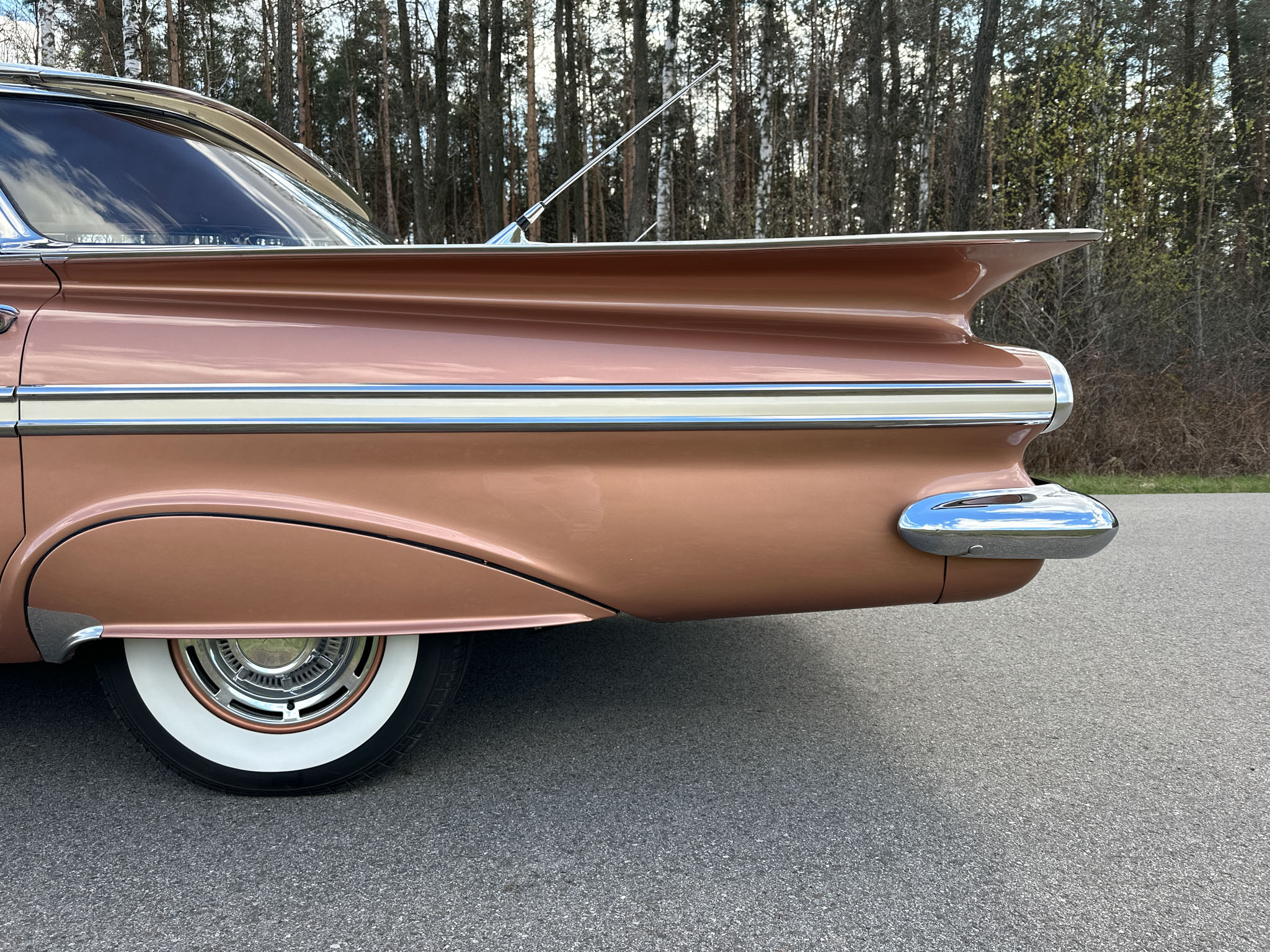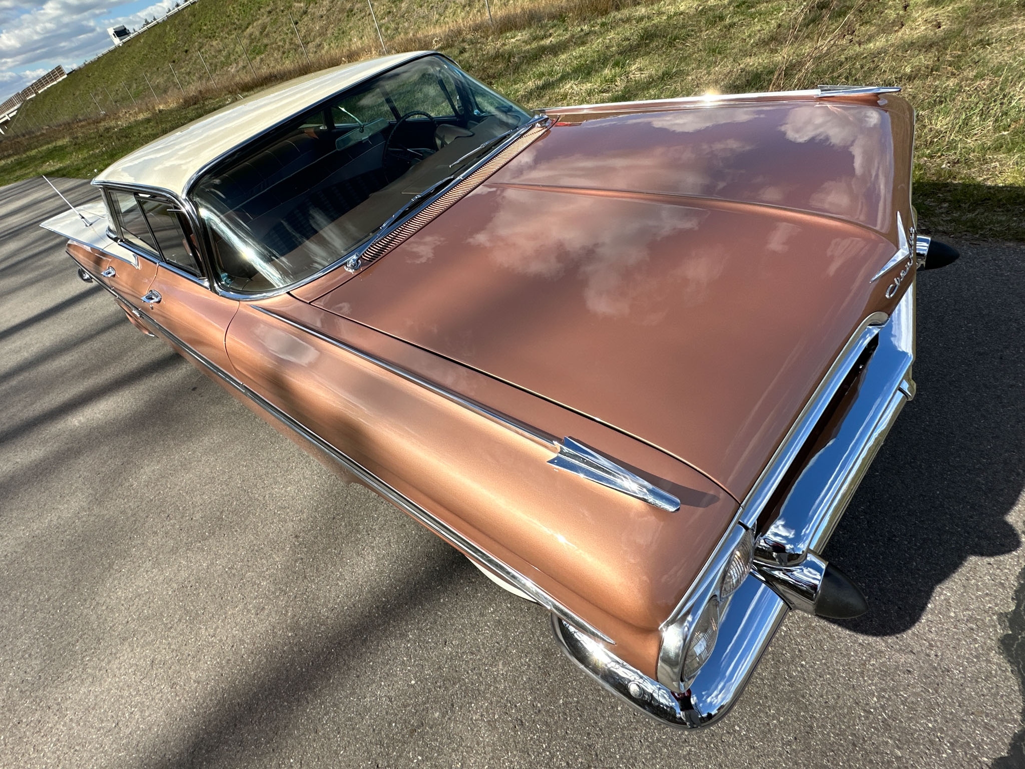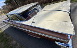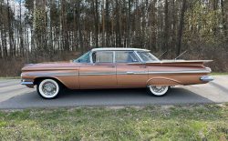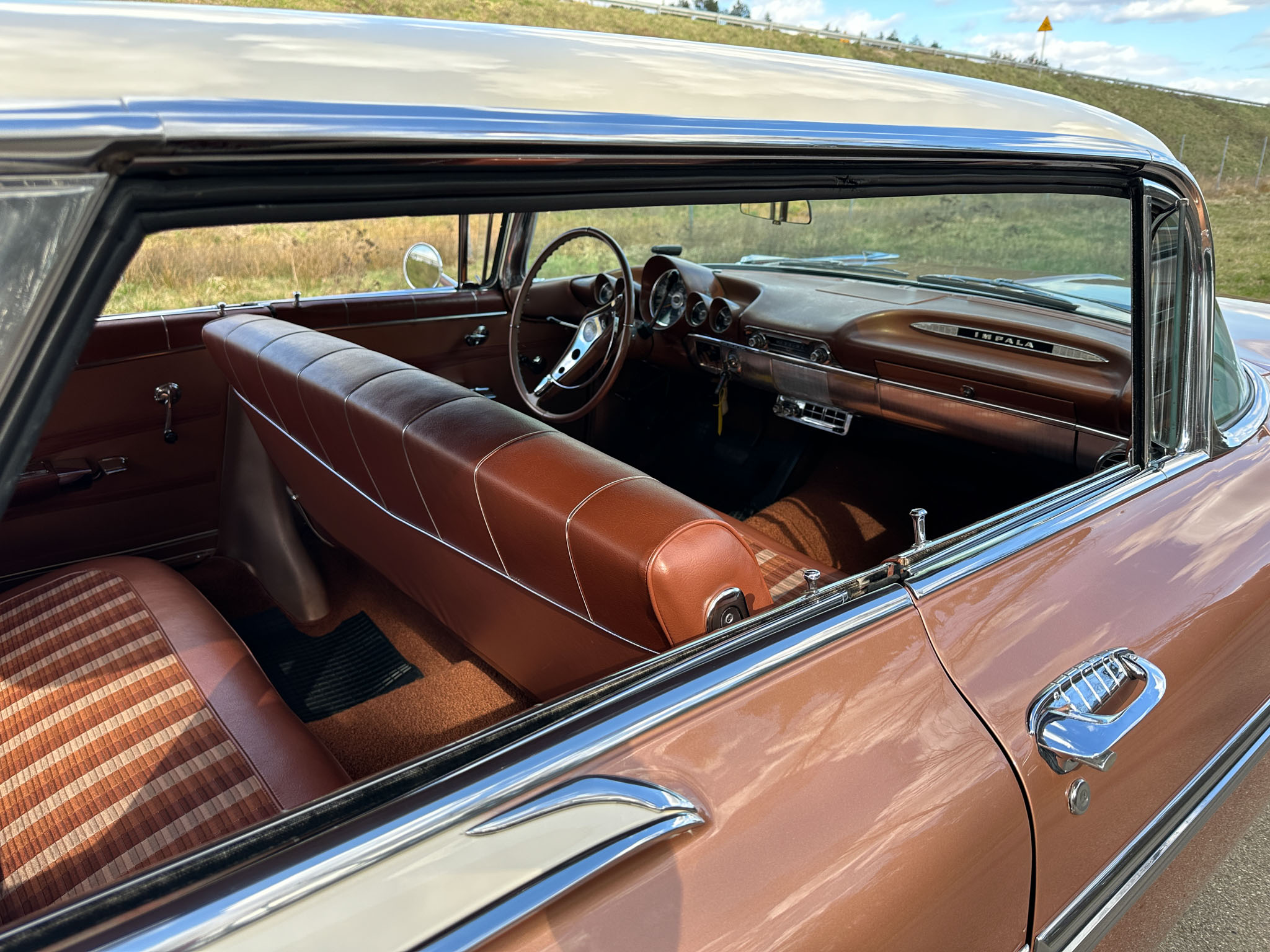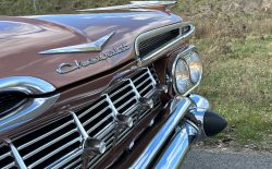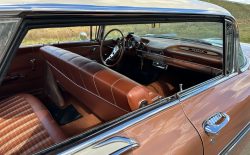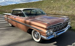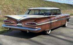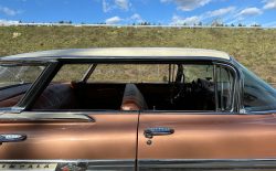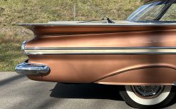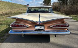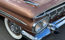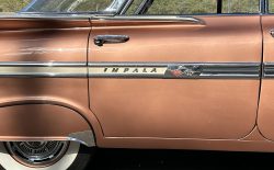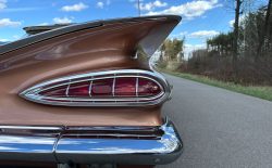 Oto blisko 5,5-metrowy flattop z płaskim dachem i bezramkowymi drzwiami, które po opuszczeniu szyb tworzy klimat wielkiego coupe. Szeroki na prawie 2 metry! Impala w kombinacji kolorystycznej Sierra Gold Poly + Honey Beige jest wyjątkowo rzadka. Kolory z 1958 roku były soczyste i gruboziarniste, co powoduje, że w zależności od kąta padania światła cały samochód mieni się niesamowita barwą. Coś pięknego… i te ozdobniki. Ten model ma jedne z najszerszych i najbardziej znanych „skrzydeł” w historii Ameryki. Dzięki kształtowi tego nadwozia Impala często używana była do wspaniałych projektów przez tunerów i warsztaty custom – stanowi kwintesencję ameryki z końcówki lat 50. Legenda na wymarciu, szczególnie w tak w oryginalnym stanie.