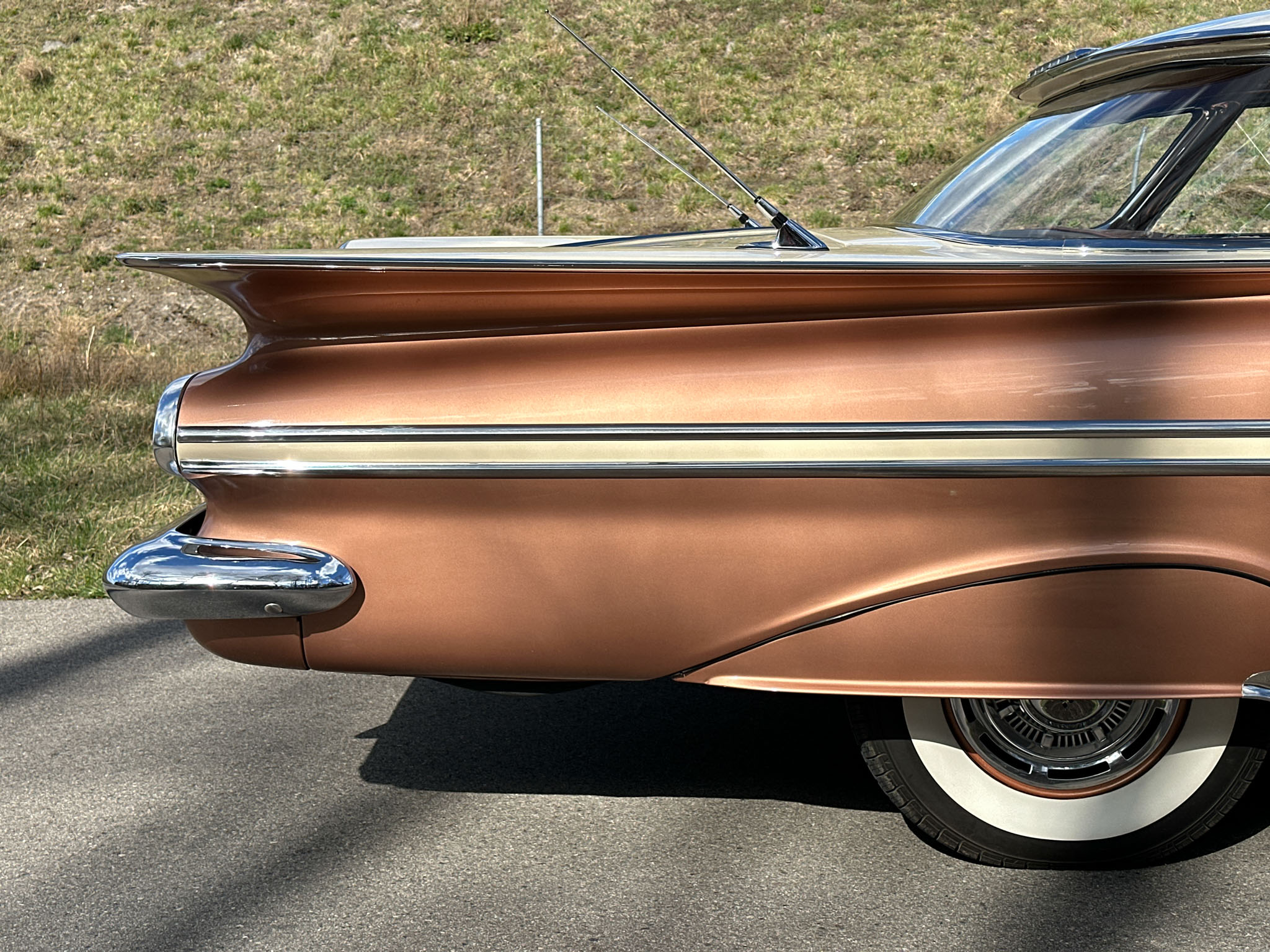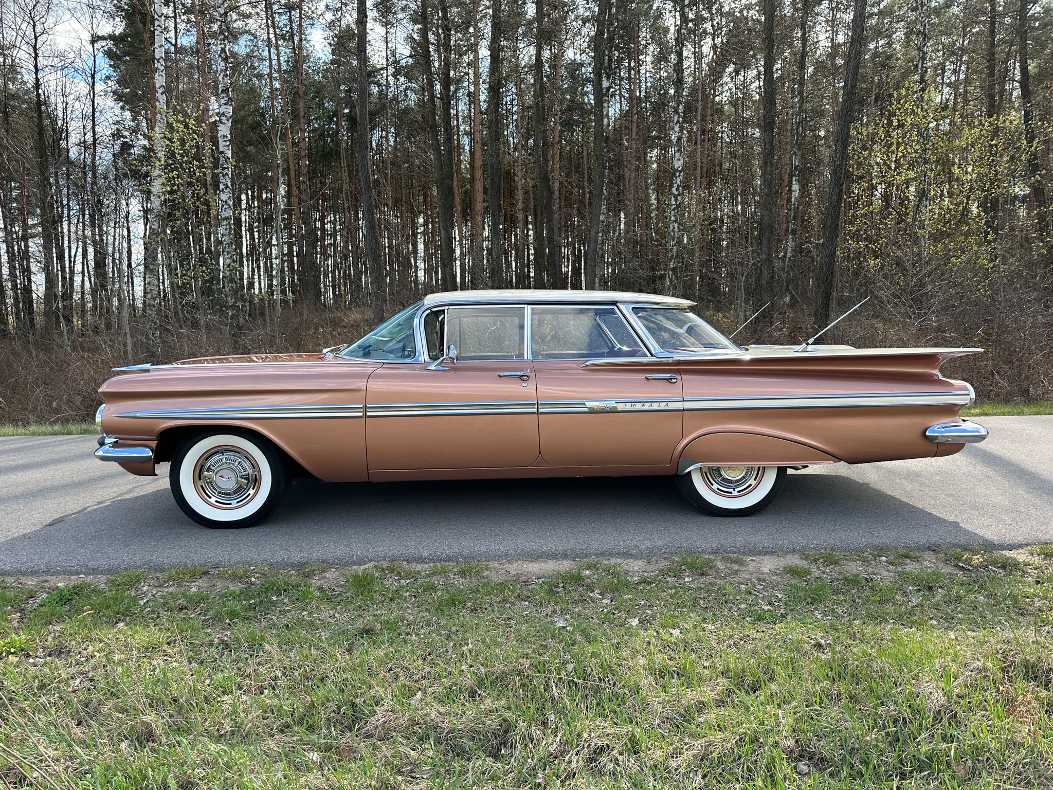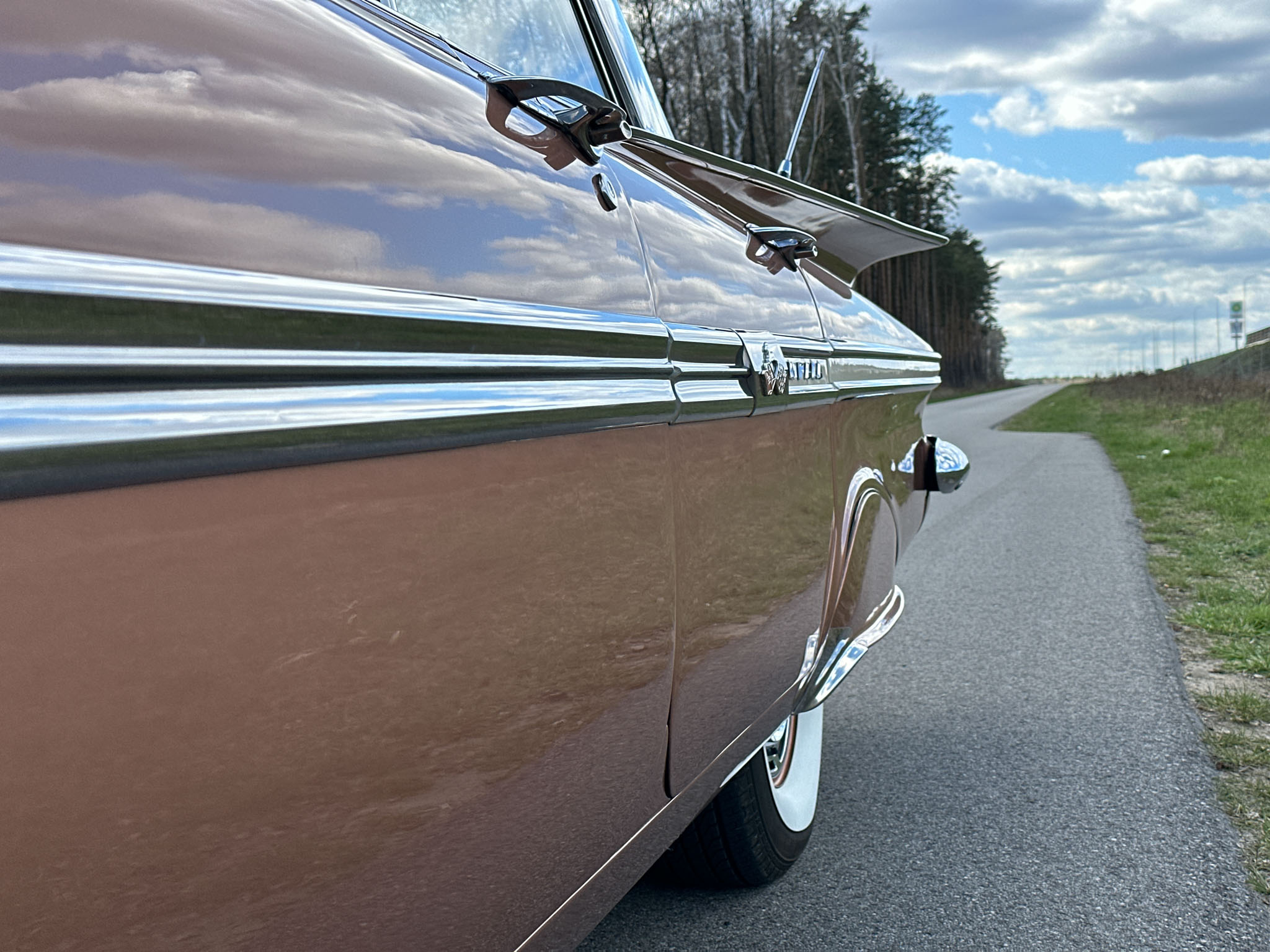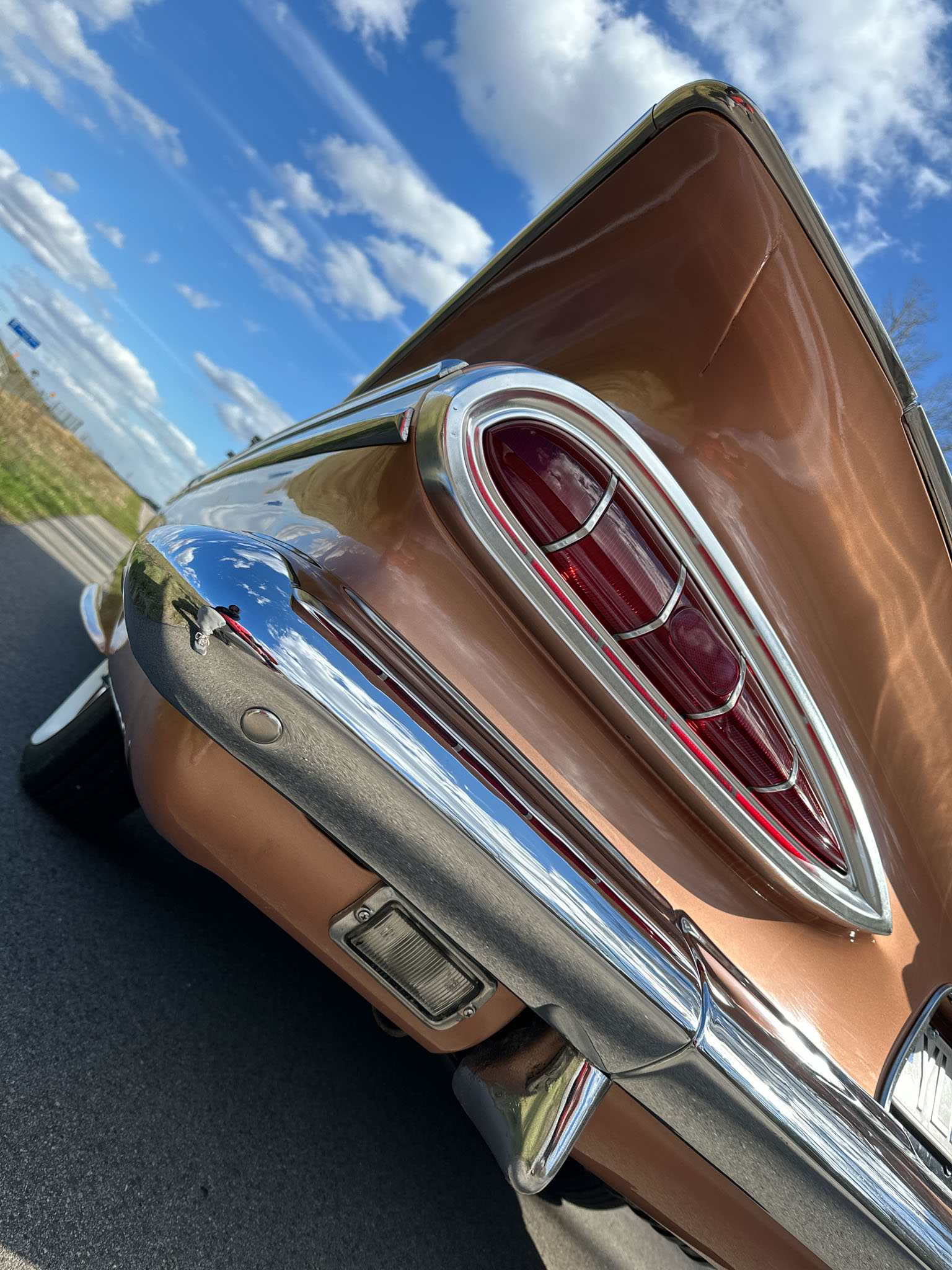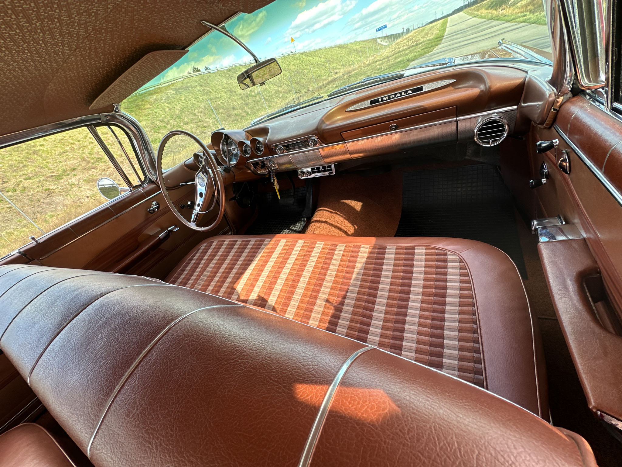 Oto blisko 5,5-metrowy flattop z płaskim dachem i bezramkowymi drzwiami, które po opuszczeniu szyb tworzy klimat wielkiego coupe. Szeroki na prawie 2 metry! Impala w kombinacji kolorystycznej Sierra Gold Poly + Honey Beige jest wyjątkowo rzadka. Kolory z 1958 roku były soczyste i gruboziarniste, co powoduje, że w zależności od kąta padania światła cały samochód mieni się niesamowita barwą. Coś pięknego… i te ozdobniki. Ten model ma jedne z najszerszych i najbardziej znanych „skrzydeł” w historii Ameryki. Dzięki kształtowi tego nadwozia Impala często używana była do wspaniałych projektów przez tunerów i warsztaty custom – stanowi kwintesencję ameryki z końcówki lat 50. Legenda na wymarciu, szczególnie w tak w oryginalnym stanie.