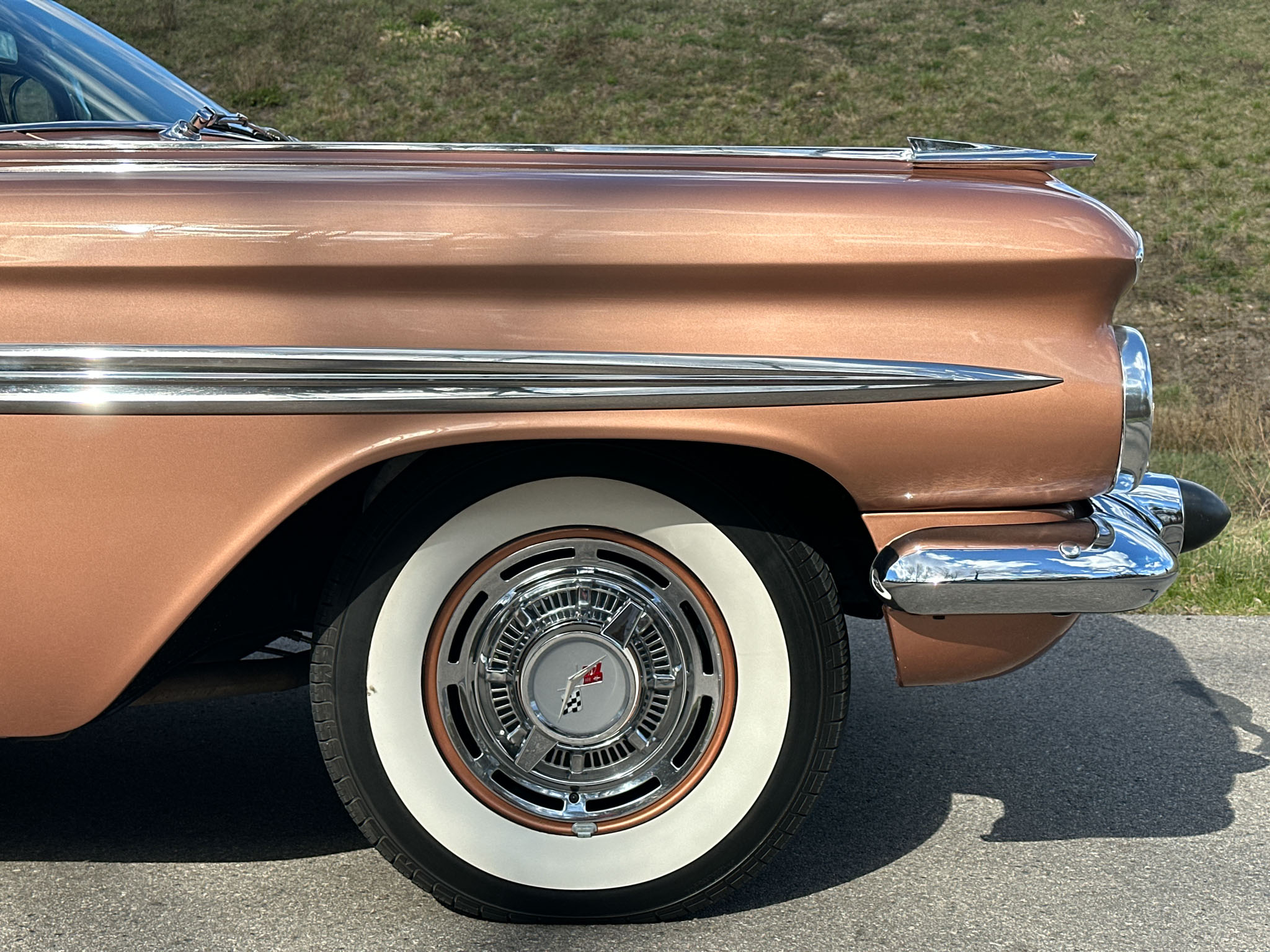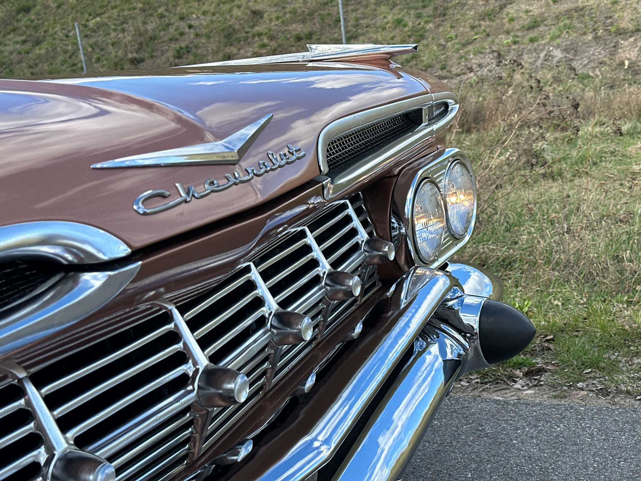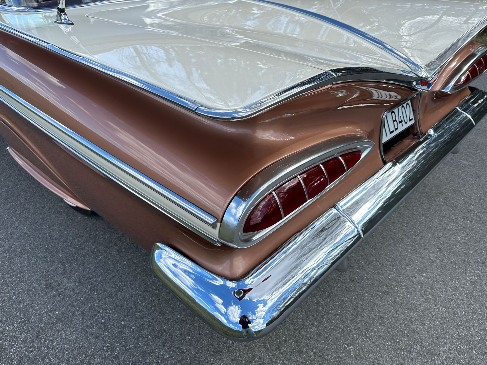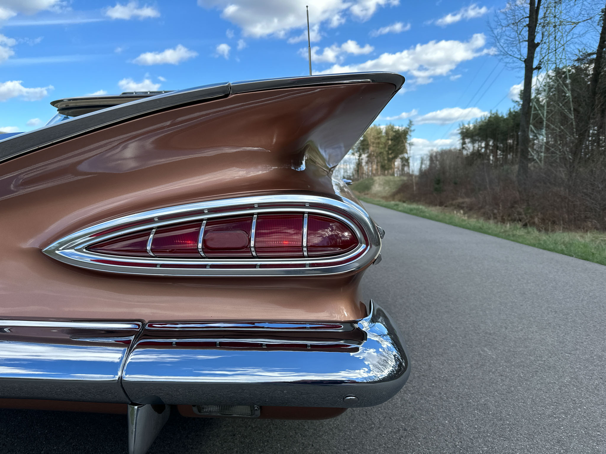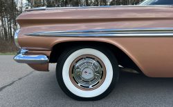Oto blisko 5,5-metrowy flattop z płaskim dachem i bezramkowymi drzwiami, które po opuszczeniu szyb tworzy klimat wielkiego coupe. Szeroki na prawie 2 metry! Impala w kombinacji kolorystycznej Sierra Gold Poly + Honey Beige jest wyjątkowo rzadka. Kolory z 1958 roku były soczyste i gruboziarniste, co powoduje, że w zależności od kąta padania światła cały samochód mieni się niesamowita barwą. Coś pięknego… i te ozdobniki. Ten model ma jedne z najszerszych i najbardziej znanych „skrzydeł” w historii Ameryki. Dzięki kształtowi tego nadwozia Impala często używana była do wspaniałych projektów przez tunerów i warsztaty custom – stanowi kwintesencję ameryki z końcówki lat 50. Legenda na wymarciu, szczególnie w tak w oryginalnym stanie.