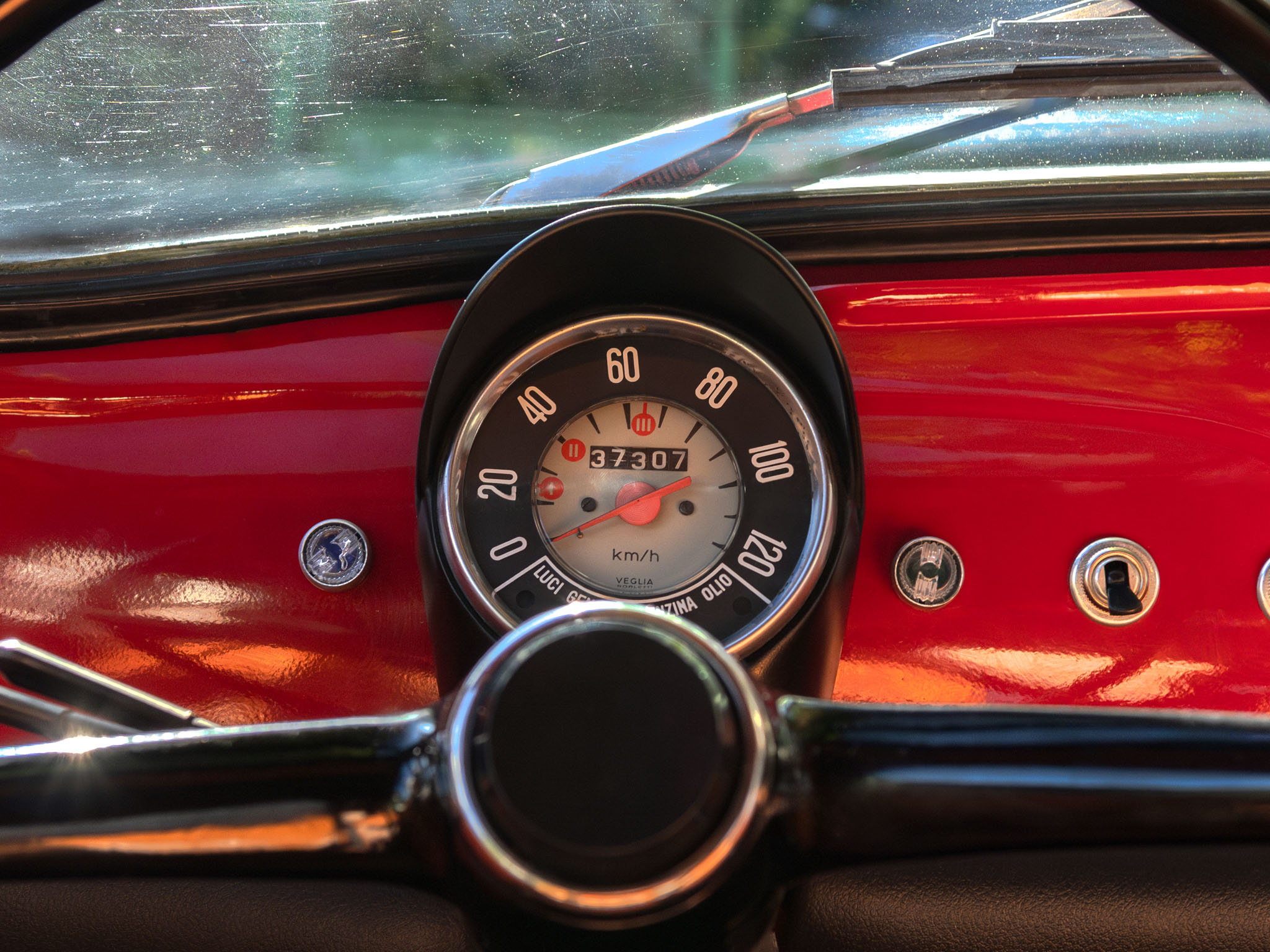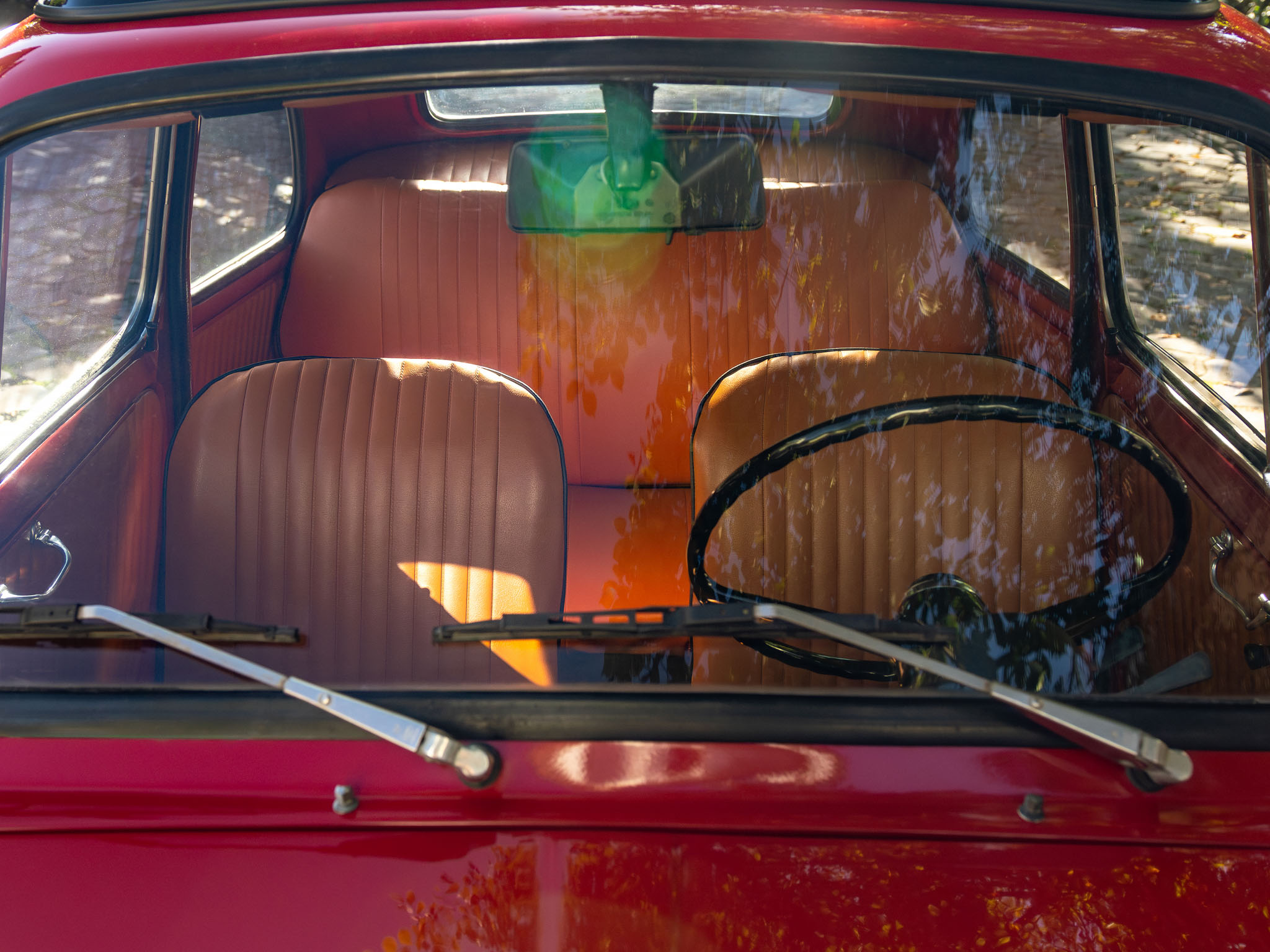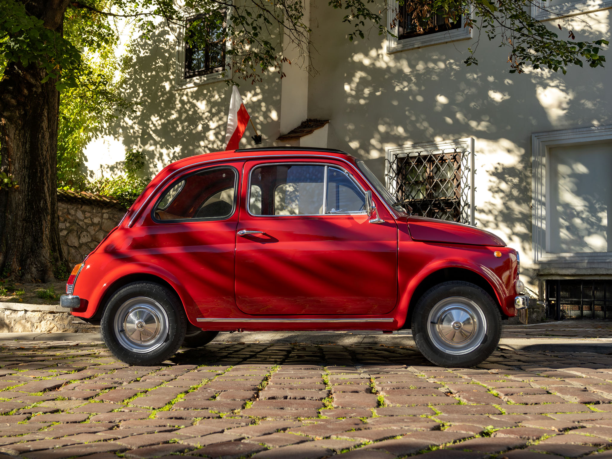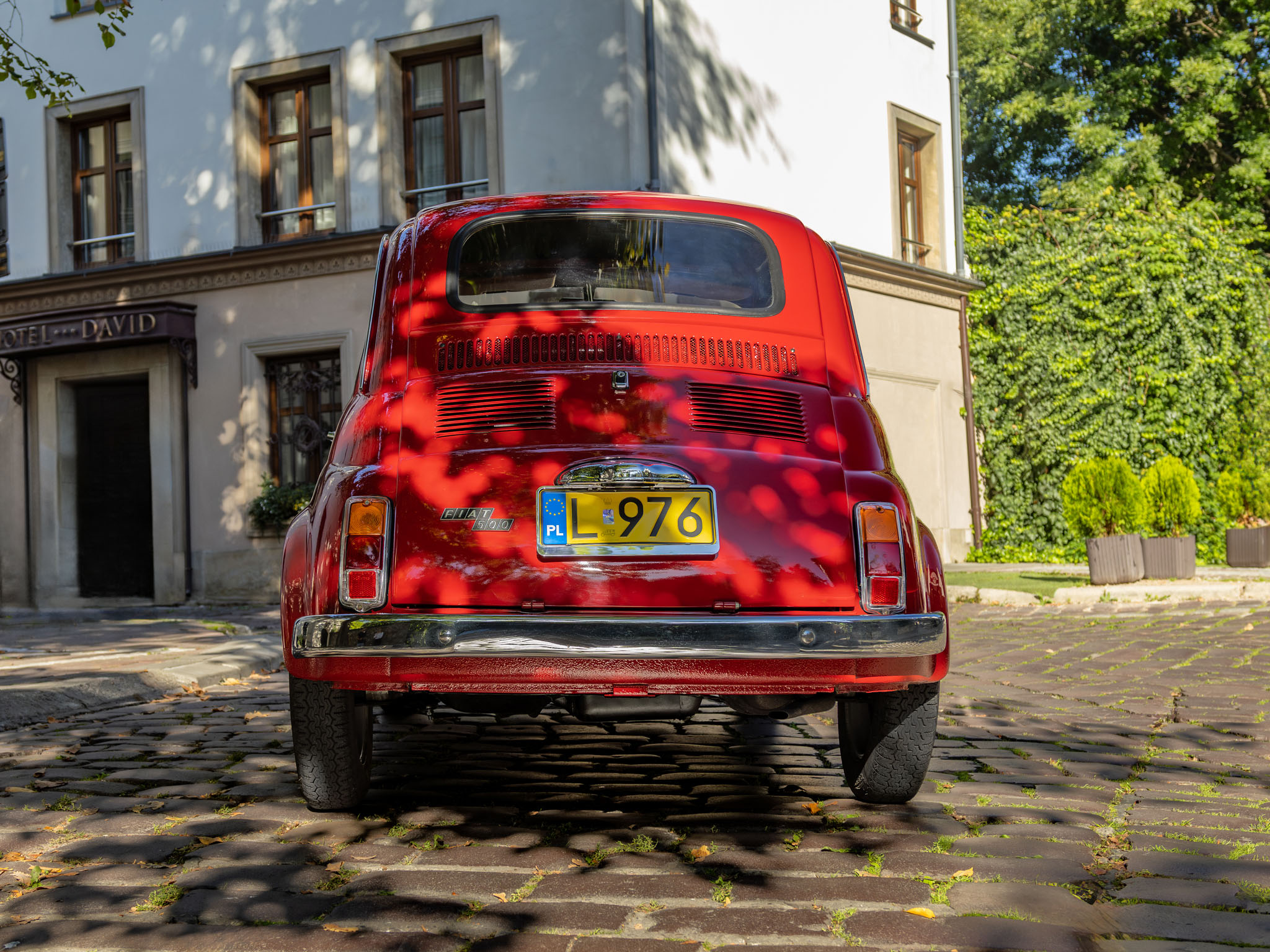 Kolor czerwony dla samochodów włoskich zawsze miał szczególne znaczenie. Był kolorem narodowym włoskich samochodów sportowych od początków motoryzacji, więc stąd tak popularne i niedrogie auto, jak kultowy Fiat 500, zazwyczaj wychodziło w bardziej skromnych odcieniach lakieru. Kolor tego egzemplarza to Rosso Medio, oferowany w latach 1960-1971 i z pewnością rzadko spotykany. Auto pięknie dopełnia brązowa tapicerka i boczki z wersji Lusso. W odrestaurowanym stanie taki samochodzik jest jak gadżet, który natychmiastowo przykuwa uwagę. A jak jeździ? Jeżeli pamiętasz wrażenia zza kierownicy 126p, Fiat 500 to pierwowzór naszego Malucha; podwozie mają niemal identyczne, stąd i wrażenia z jazdy, brzmienie silnika, rozmiary na zewnątrz i w środku, są niemal analogiczne. To, co zdecydowanie jest na plus we Fiacie 500 to otwierany dach i ilość uśmiechów, którymi jest obdarzany na ulicy.