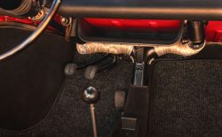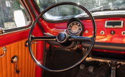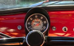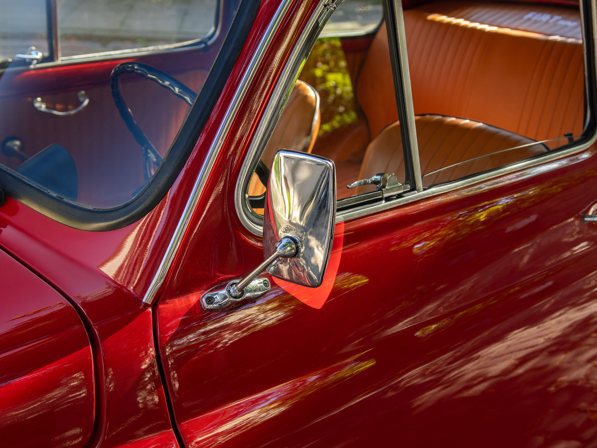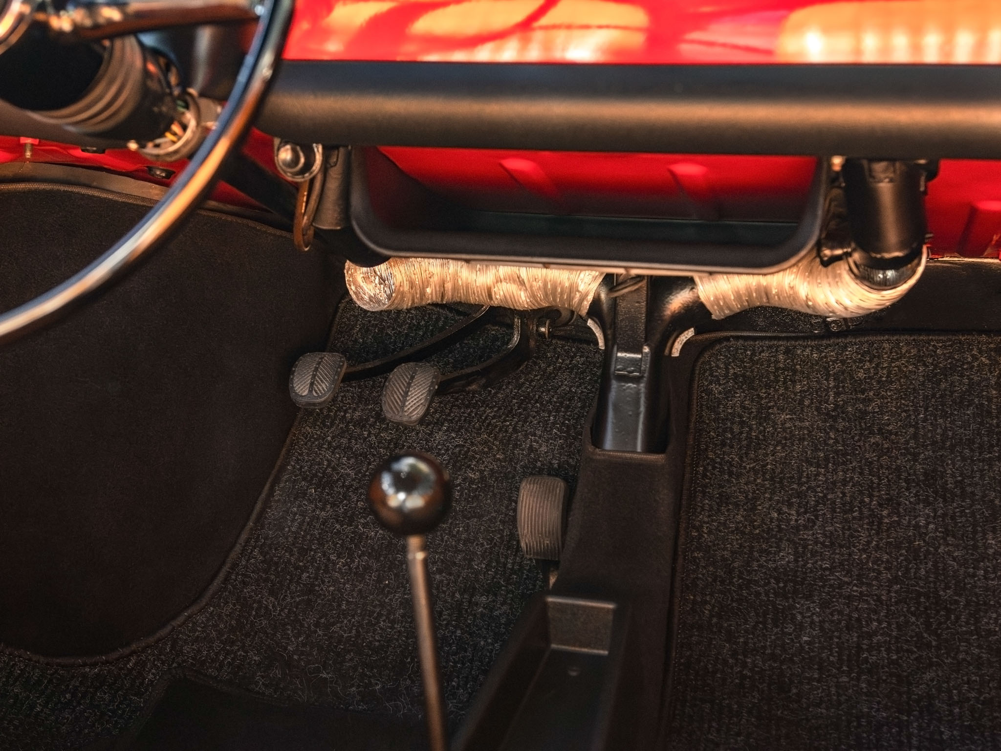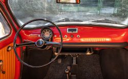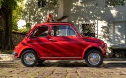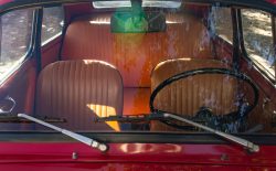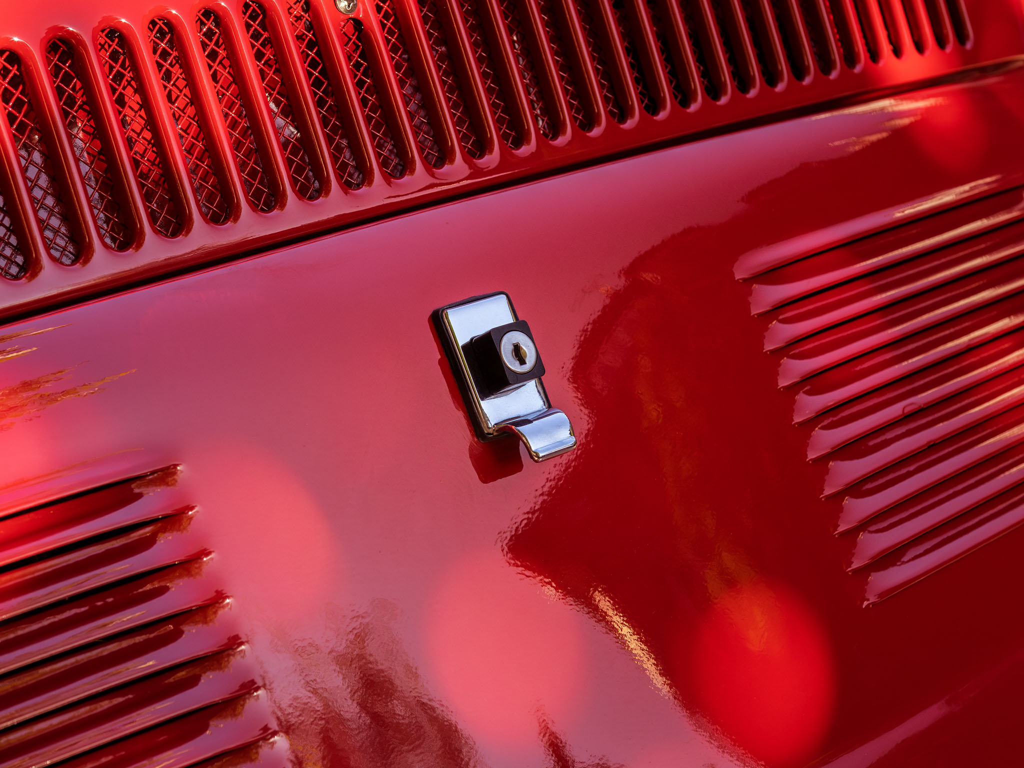 Kolor czerwony dla samochodów włoskich zawsze miał szczególne znaczenie. Był kolorem narodowym włoskich samochodów sportowych od początków motoryzacji, więc stąd tak popularne i niedrogie auto, jak kultowy Fiat 500, zazwyczaj wychodziło w bardziej skromnych odcieniach lakieru. Kolor tego egzemplarza to Rosso Medio, oferowany w latach 1960-1971 i z pewnością rzadko spotykany. Auto pięknie dopełnia brązowa tapicerka i boczki z wersji Lusso. W odrestaurowanym stanie taki samochodzik jest jak gadżet, który natychmiastowo przykuwa uwagę. A jak jeździ? Jeżeli pamiętasz wrażenia zza kierownicy 126p, Fiat 500 to pierwowzór naszego Malucha; podwozie mają niemal identyczne, stąd i wrażenia z jazdy, brzmienie silnika, rozmiary na zewnątrz i w środku, są niemal analogiczne. To, co zdecydowanie jest na plus we Fiacie 500 to otwierany dach i ilość uśmiechów, którymi jest obdarzany na ulicy.