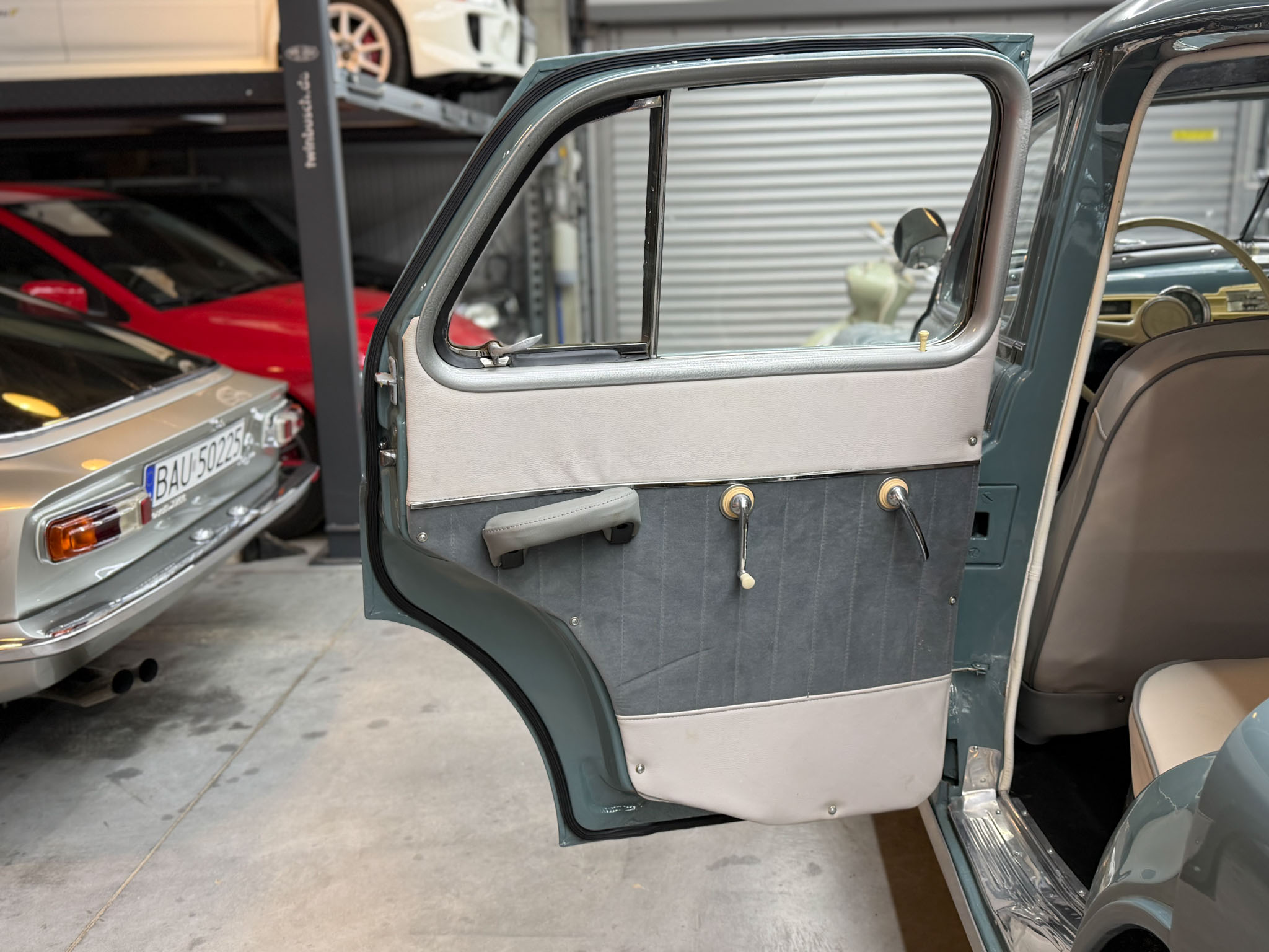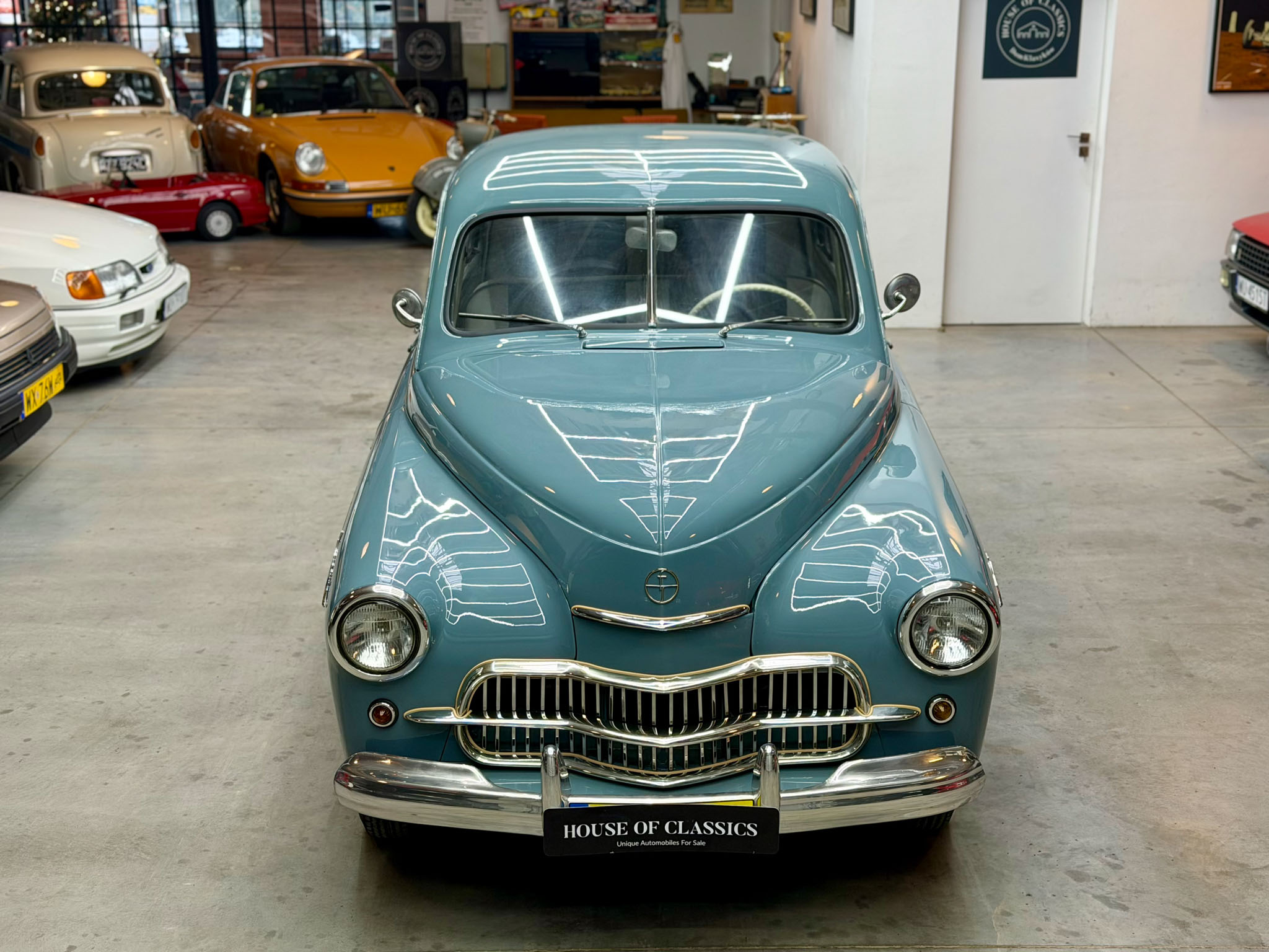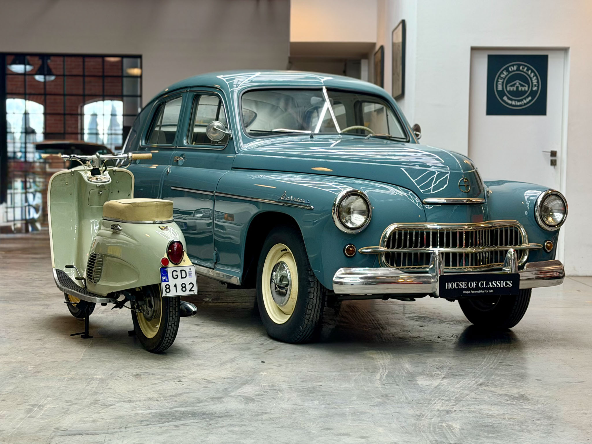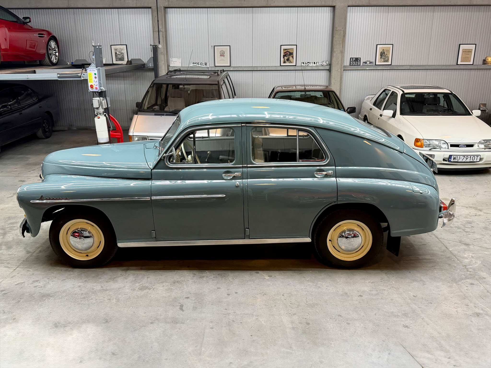 Warszawa, która pragnę Wam zaoferować to garbaty model 201 z 1960 roku w fantastycznym stalowo-niebieskim kolorze. 201 to ulepszona wersja Warszawy M20. Auto przeszło renowację kilka lat temu i przejechało przez ten czas 100 km. Jest to renowacja na poziomie dobrym, gdzie utrzymano fabryczne niedoskonałości. Rasowy handlarz napisałby stan idealny, ale ja takim nie jestem. Chromy pozostawiają trochę do życzenia, a wnętrze to bym uszył od nowa zgodnie z oryginałem. Silniczek mruczy tak jak trzeba, skrzynia pracuje bdb, ale przejechałem nią 1 km… i spadł śnieg.