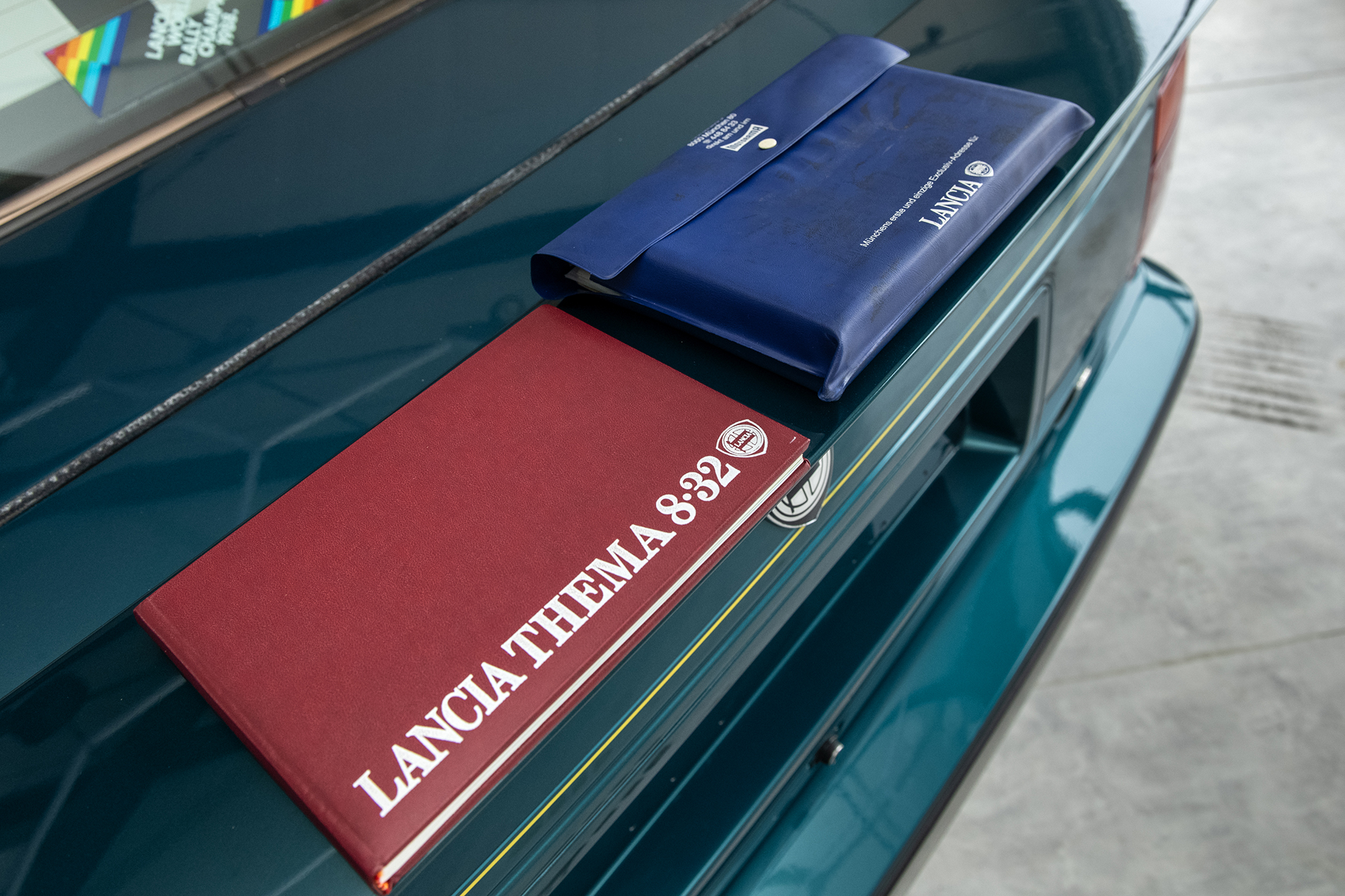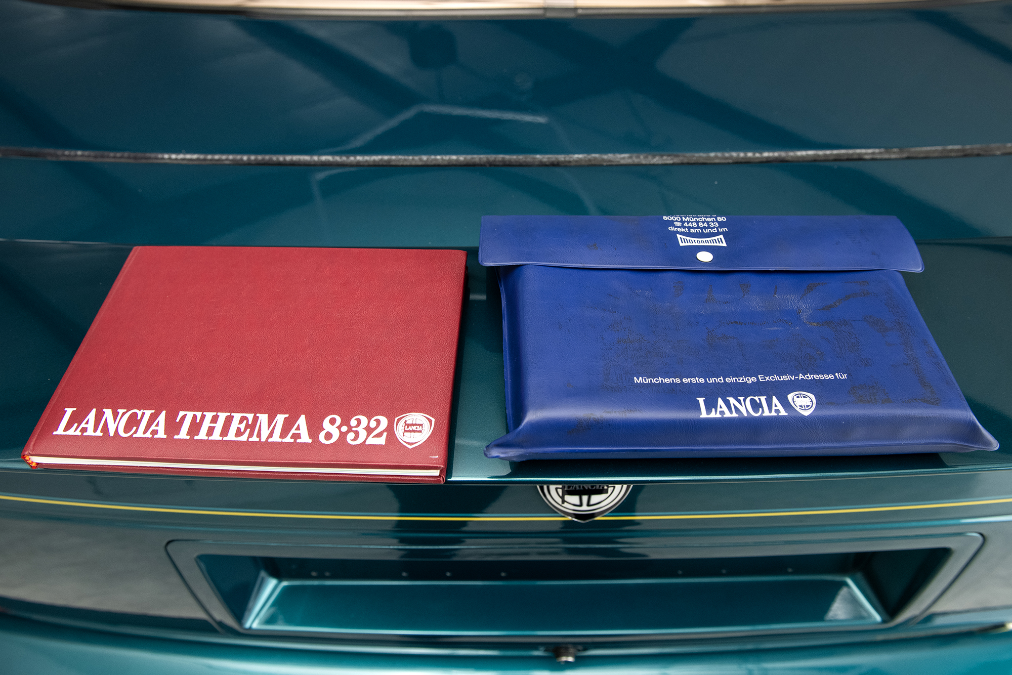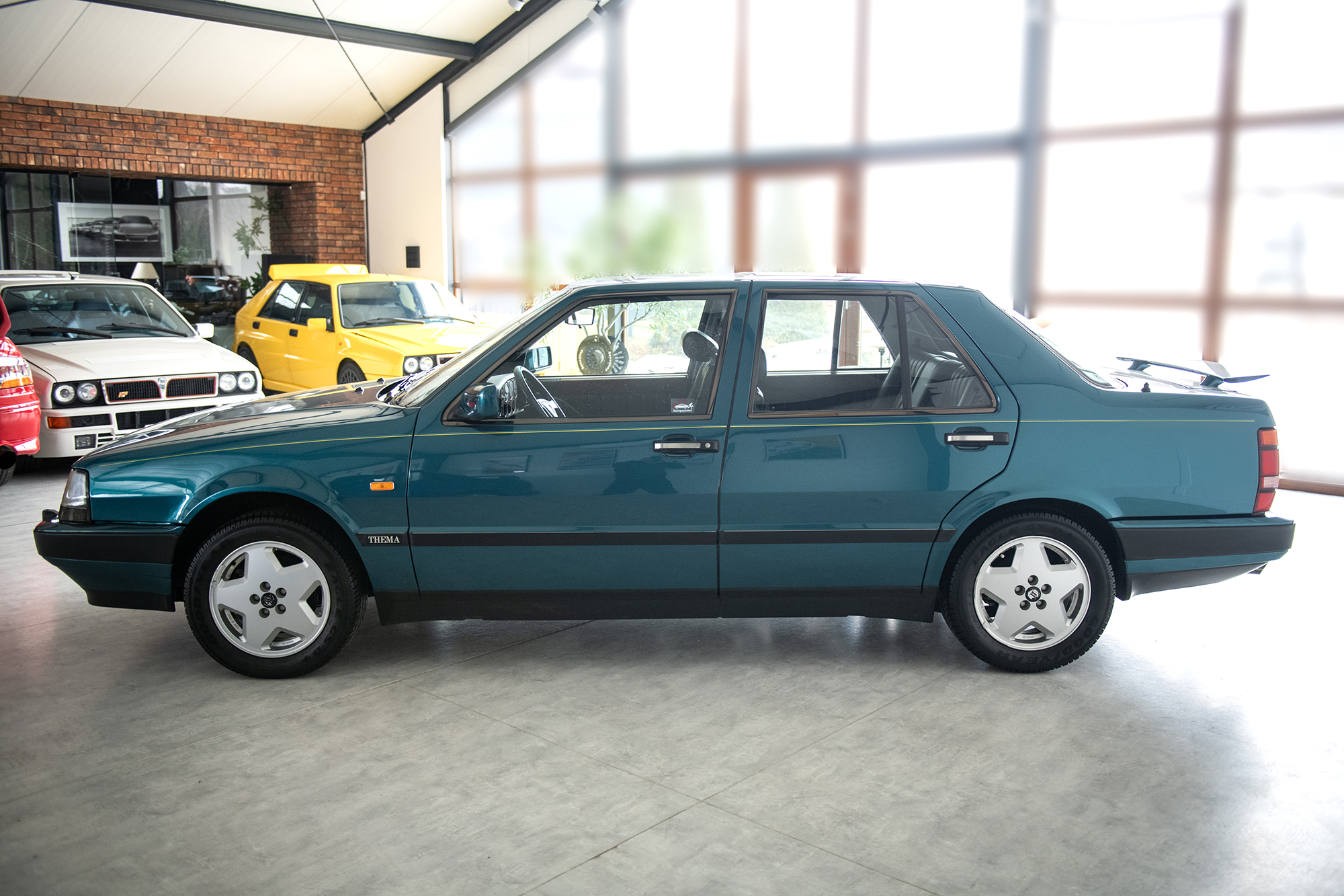 Zaprezentowana została po raz pierwszy na salonie samochodowym w Turynie w 1986 roku. Lancia Thema 8.32, gdzie „8” oznacza liczbę cylindrów, natomiast „32” liczbę zaworów, była montowana w fabryce Lancii S. Paolo w Turynie. Wszystkie wersje 8.32 zasilane były wtryskiem paliwa Bosch KE3 Jetronic. Zupełnie nowy, elektronicznie sterowany układ kierowniczy Servotronic dostarczany był przez firmę ZF i zmieniał siłę wspomagania w zależności od prędkości jazdy. Bodaj największą ciekawostką był automatycznie wysuwający się przy wyższych prędkościach tylny spojler. Tym samym Thema 8.32 została pierwszym seryjnie produkowanym autem drogowym, które oferowało elementy aktywnej aerodynamiki, wyprzedzając o kilka miesięcy Porsche 959. Samochód oferował ręcznie wykonane wnętrze z drewna i Alcantary albo skóry Poltrona Frau, którą odnajdziecie w prezentowanym egzemplarzu. Skóra pokrywa tu całą deskę rozdzielczą, kierownicę, dźwignię zmiany biegów oraz hamulca ręcznego, schowki, konsolę środkową, panele drzwi i osłony przeciwsłoneczne, podsufitkę zaś wykonano z Alcantary. Wskaźniki mają czarne tarcze z żółtymi wskazówkami. Nabywcy Themy 8.32 mogli wybierać spośród pięciu kolorów lakieru, wszystkich metalizowanych: Blizzard Blue, Winner Red, Quartz Grey, Reflex Green i Black. Podwójny ręcznie malowany pasek (górny dopasowany do koloru nadwozia, dolny żółty) biegnie wzdłuż boków i tyłu samochodu. Dla wielu niespodzianką będzie silnik pod maską. To poprzecznie umieszczona jednostka V8 Ferrari, połączona ze skrzynią manualną. Silnik różnił się od innych ówczesnych silników V8 Ferrari tym, że był wyposażony w wał korbowy typu cross-plane zamiast standardowego płaskiego, mniejsze zawory i inną kolejność zapłonu: wszystko to miało na celu dostosowanie charakterystyki silnika do czterodrzwiowej luksusowej limuzyny.