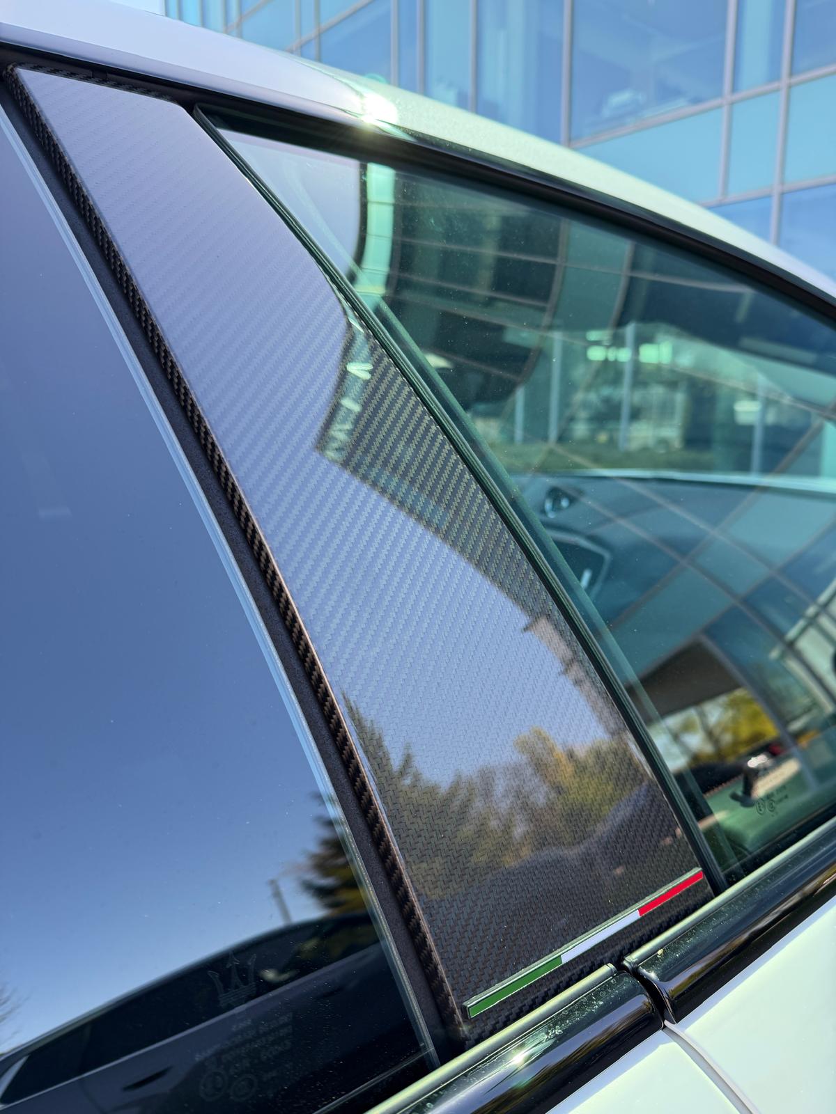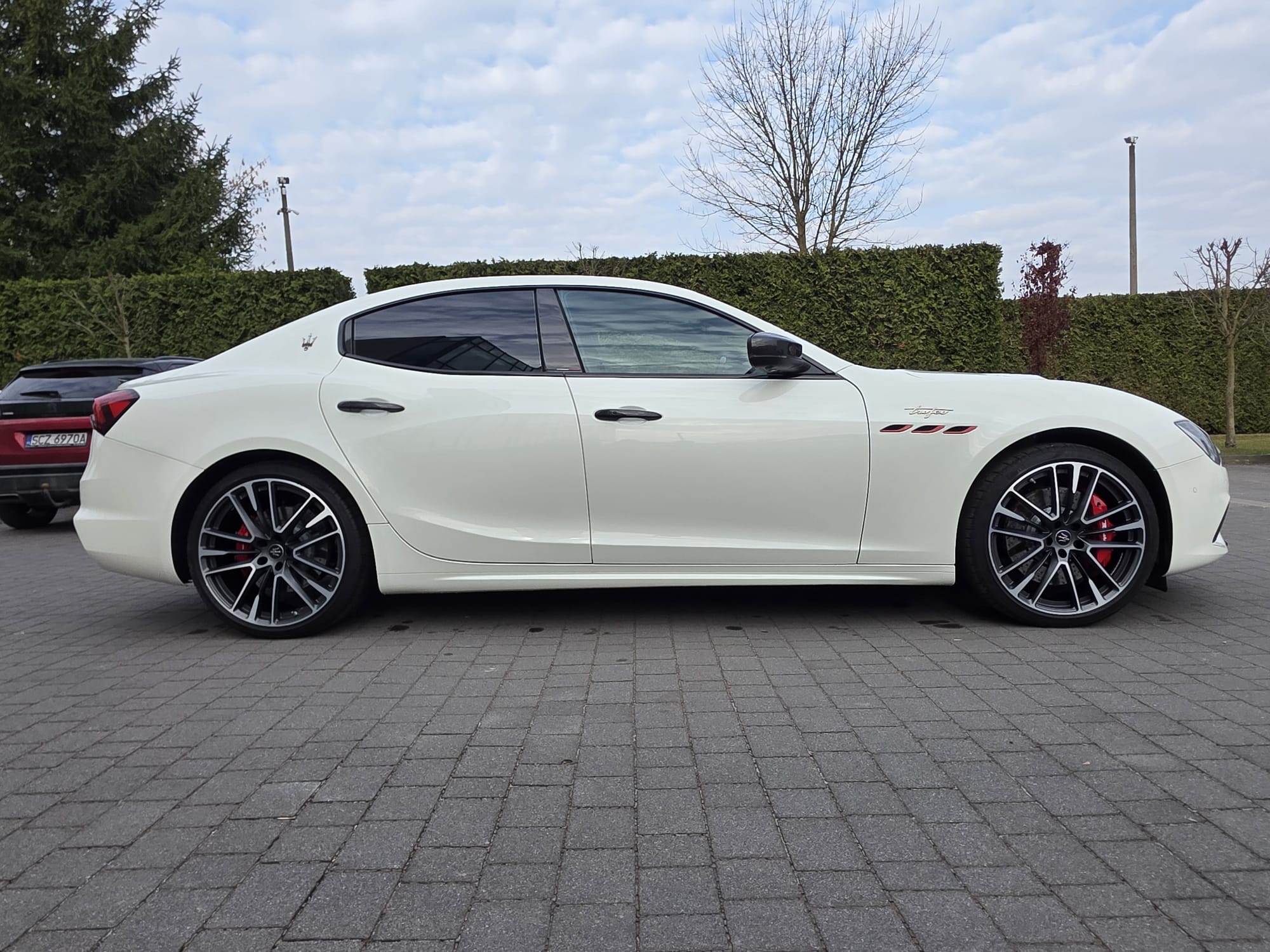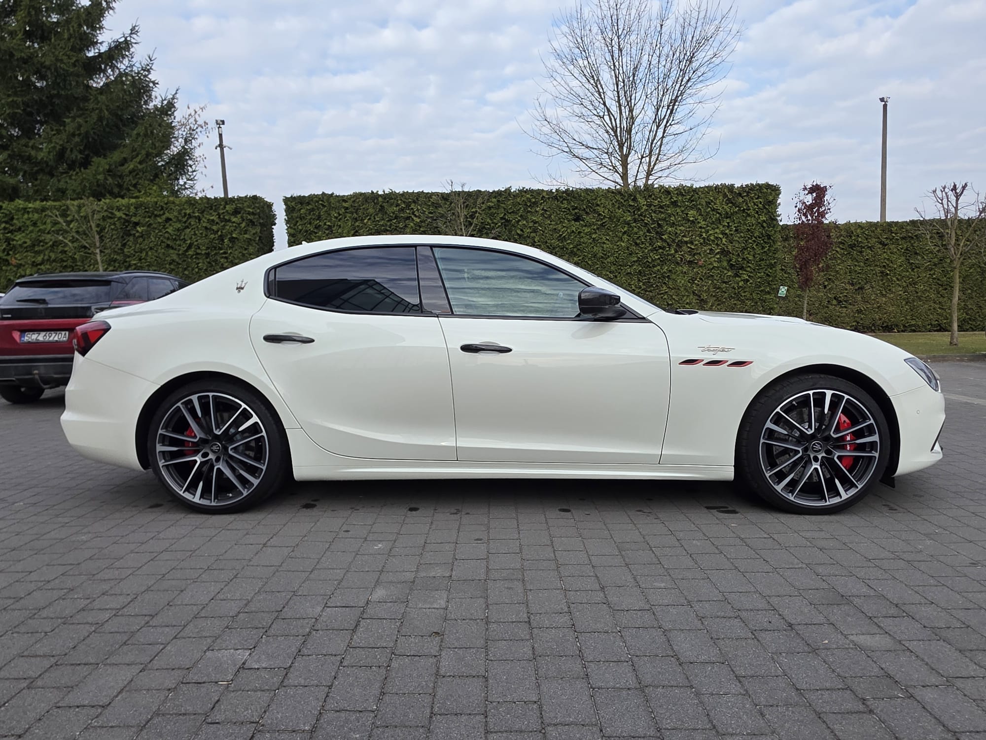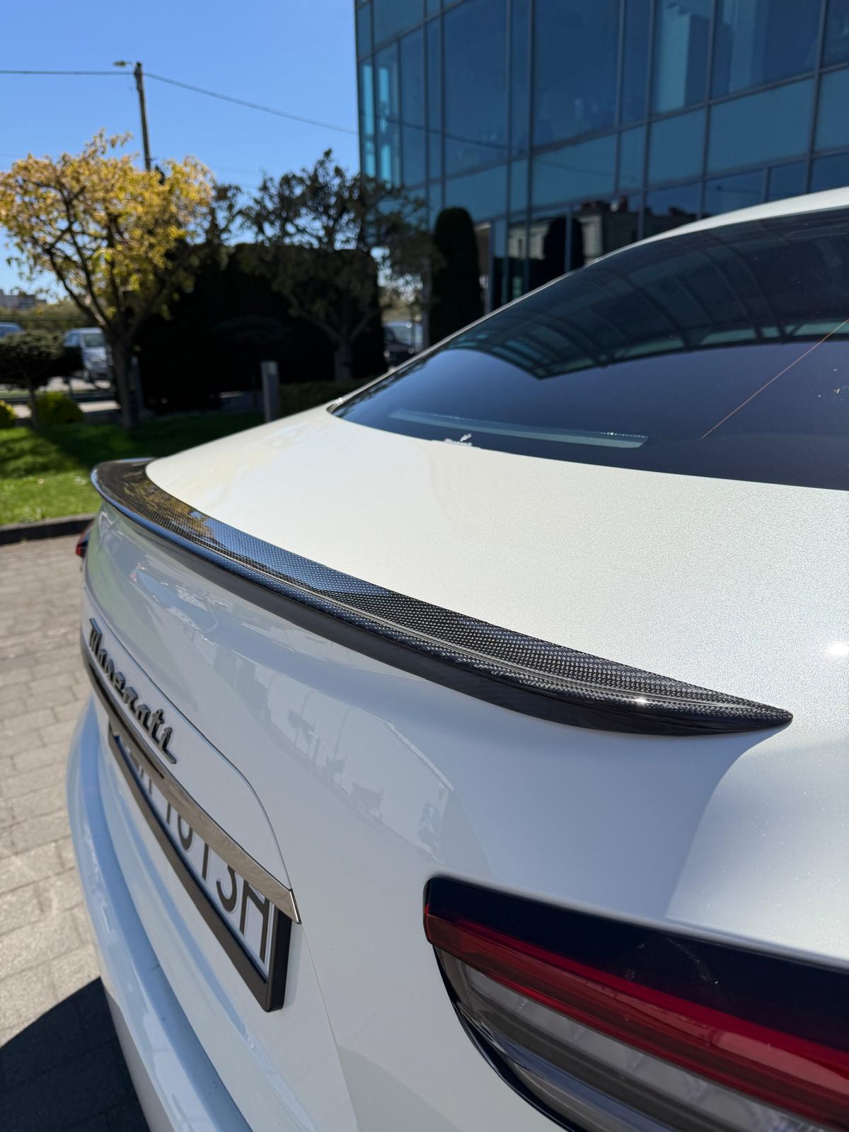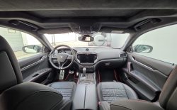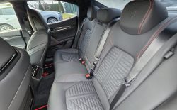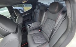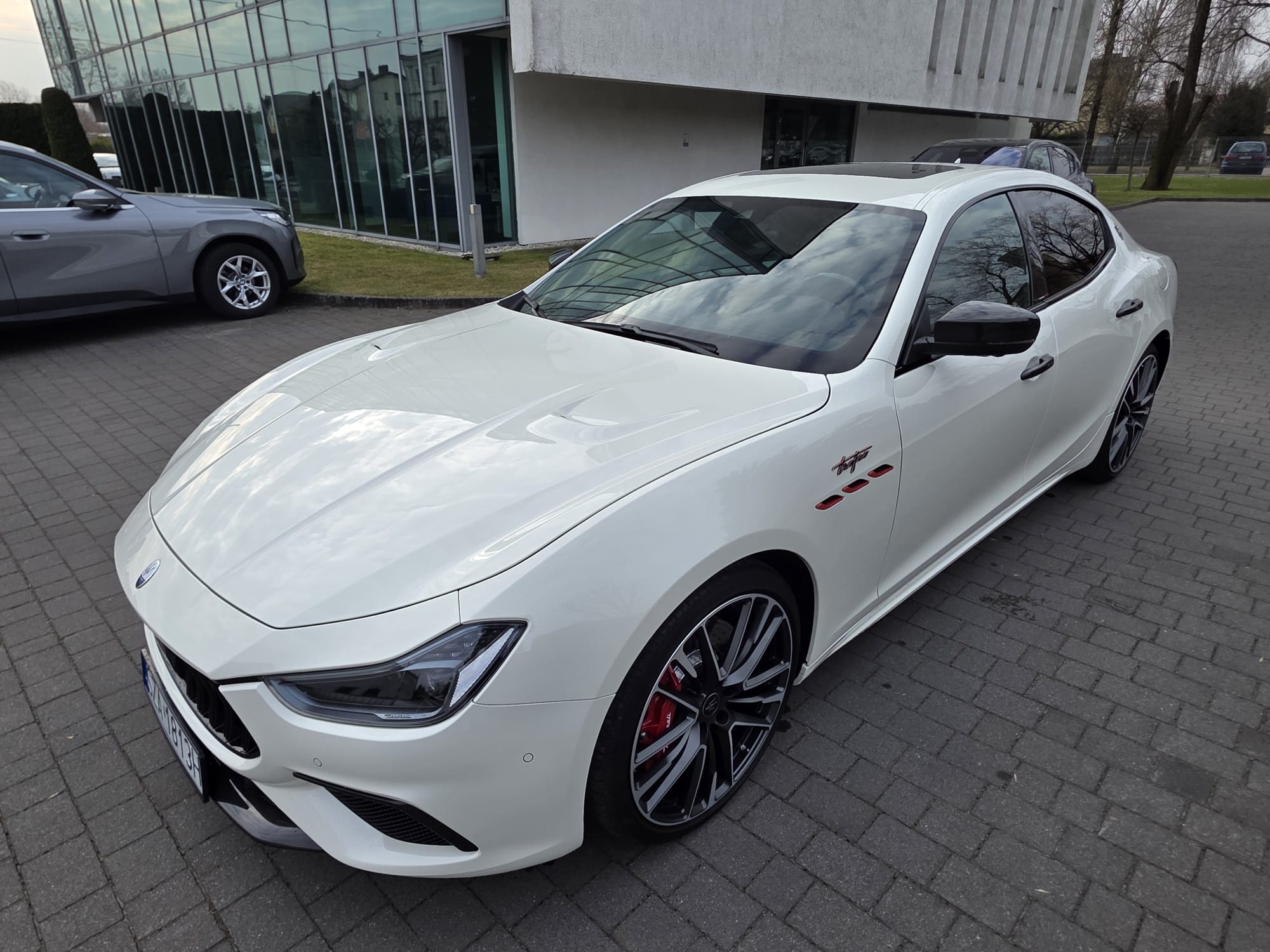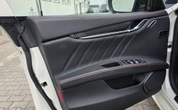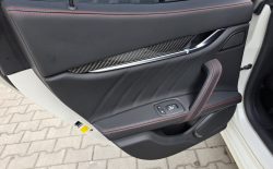Auto prezentuje się bardzo dobrze wizualnie – eleganckie białe nadwozie z czarnymi dodatkami podkreśla jego dynamiczną sylwetkę. Całość uzupełniają sportowe felgi z czerwonymi zaciskami hamulcowymi oraz charakterystyczne dla Maserati wloty powietrza. Panoramiczny dach dodaje prestiżu i przestronności.