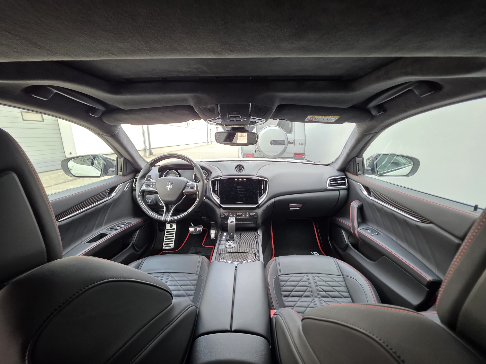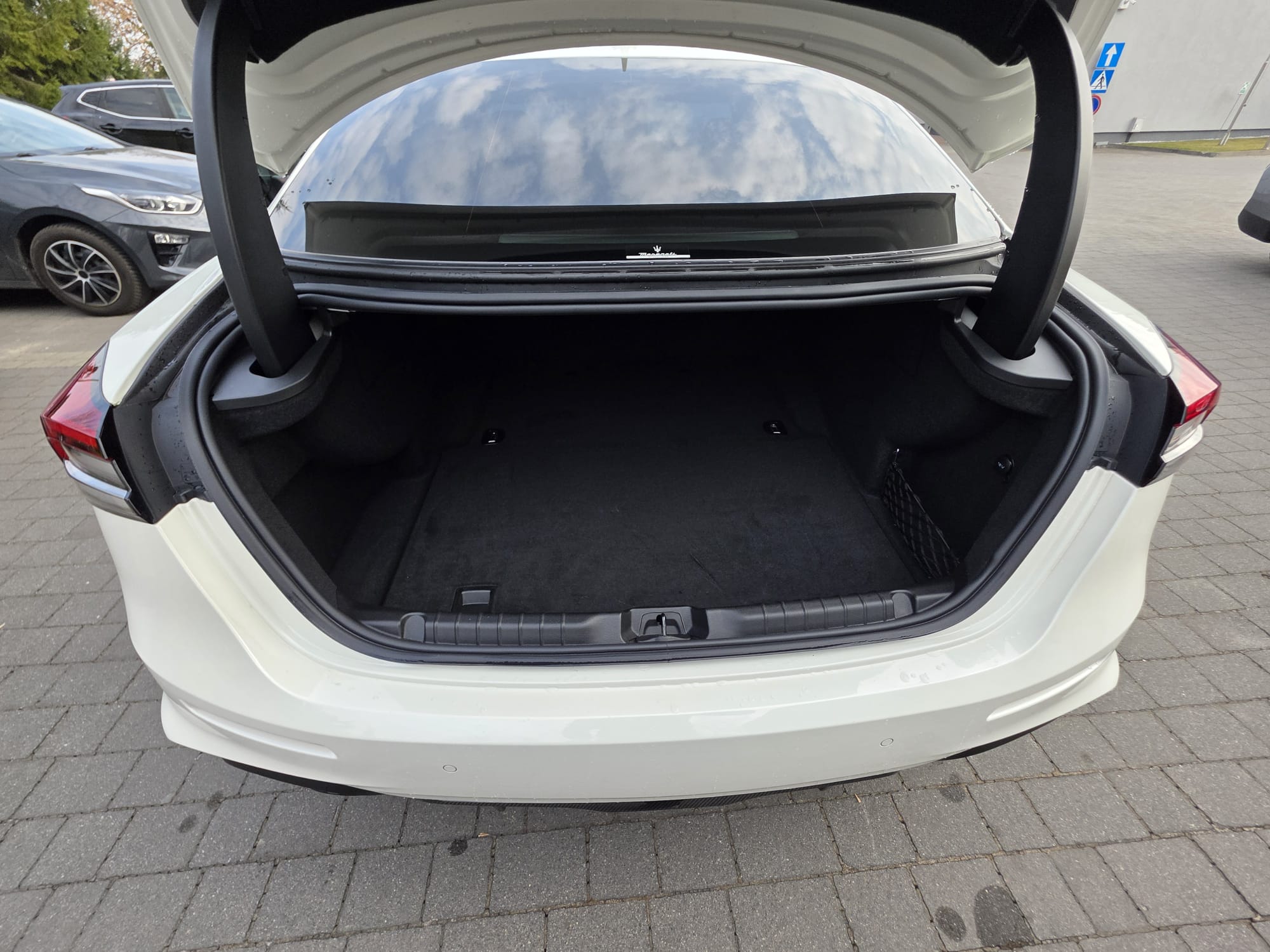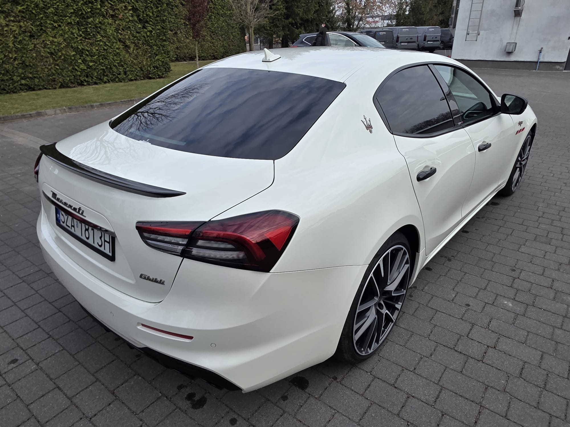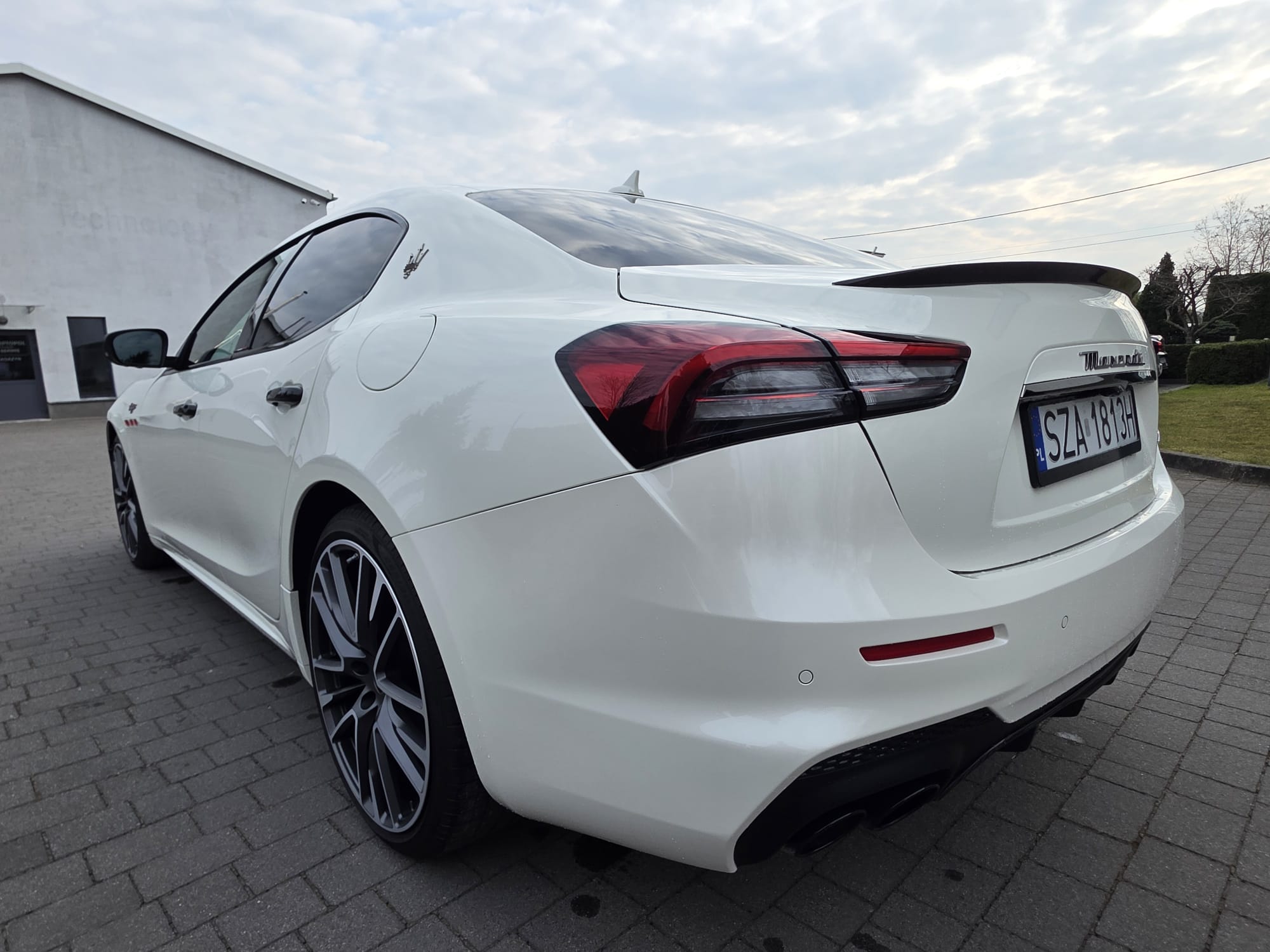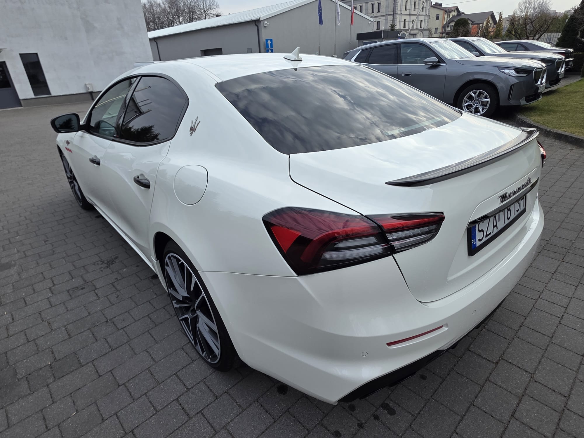 Auto prezentuje się bardzo dobrze wizualnie – eleganckie białe nadwozie z czarnymi dodatkami podkreśla jego dynamiczną sylwetkę. Całość uzupełniają sportowe felgi z czerwonymi zaciskami hamulcowymi oraz charakterystyczne dla Maserati wloty powietrza. Panoramiczny dach dodaje prestiżu i przestronności.