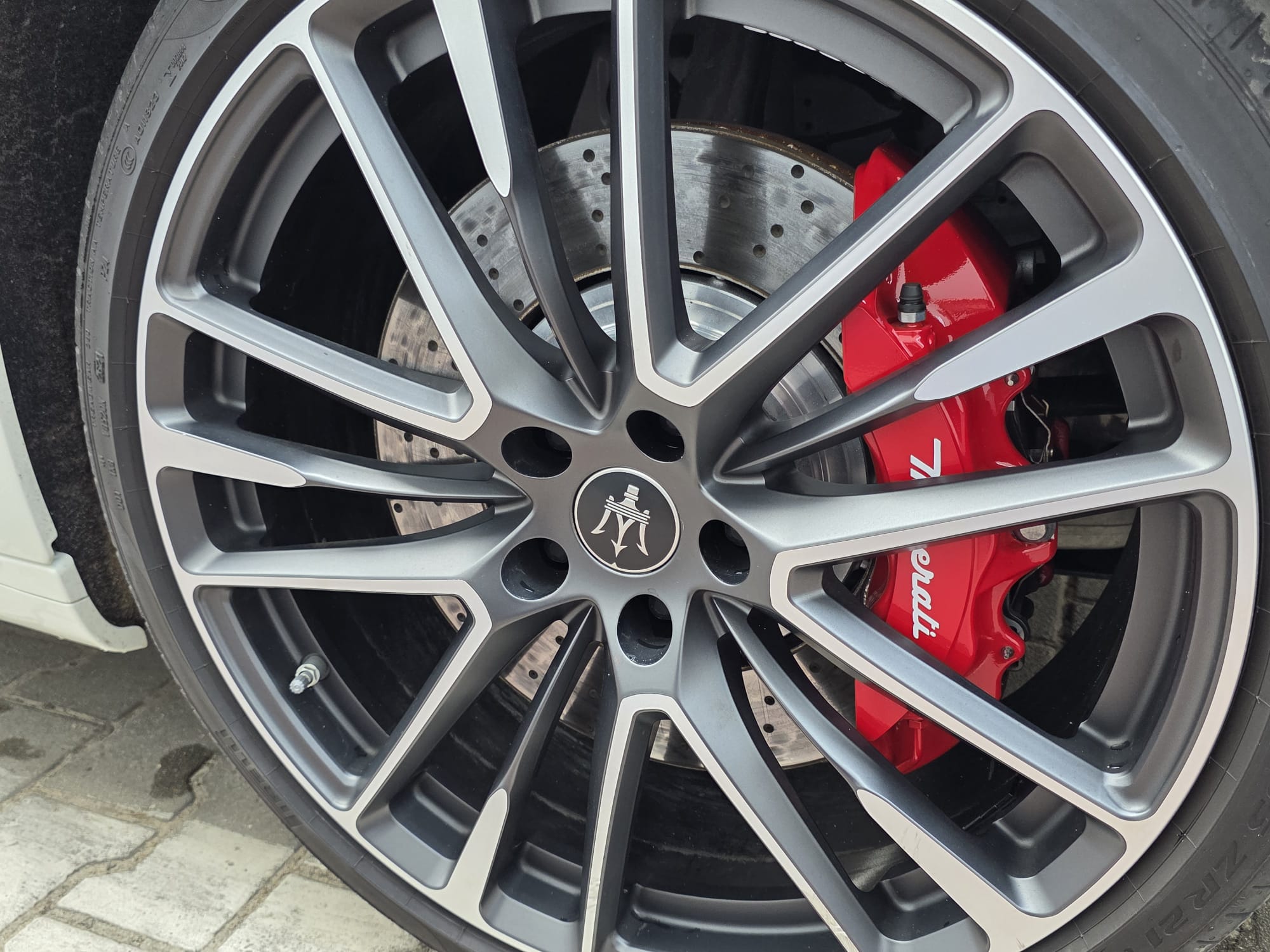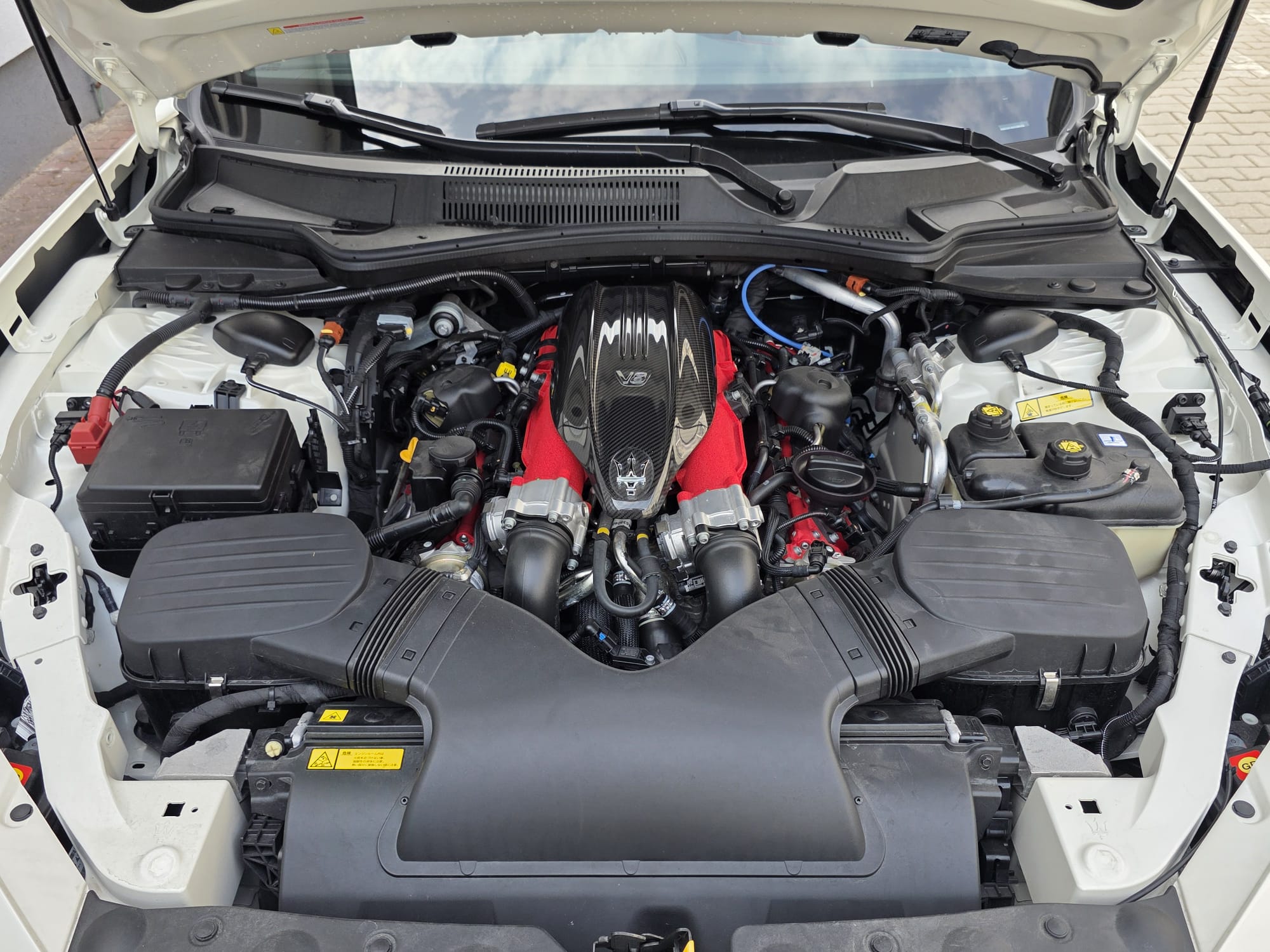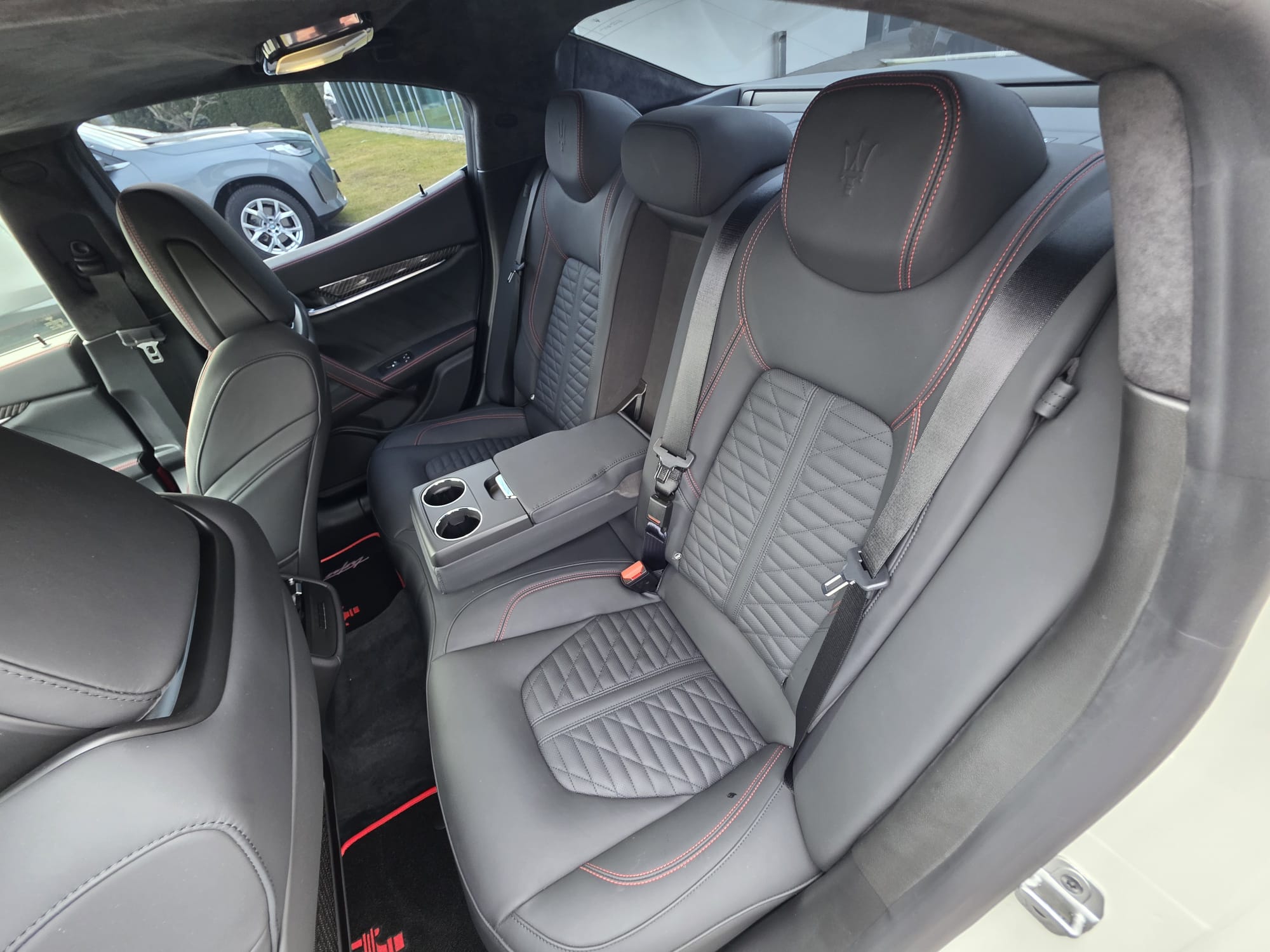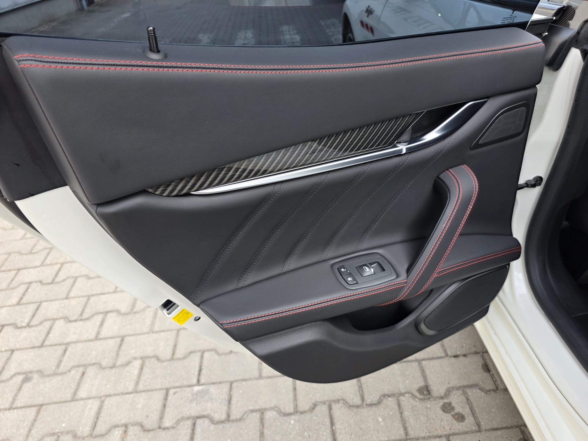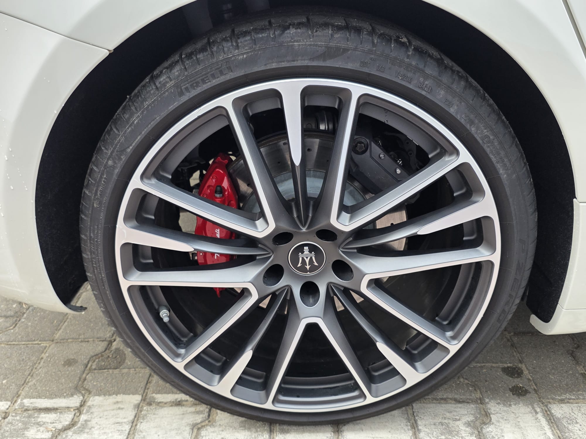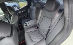 Auto prezentuje się bardzo dobrze wizualnie – eleganckie białe nadwozie z czarnymi dodatkami podkreśla jego dynamiczną sylwetkę. Całość uzupełniają sportowe felgi z czerwonymi zaciskami hamulcowymi oraz charakterystyczne dla Maserati wloty powietrza. Panoramiczny dach dodaje prestiżu i przestronności.