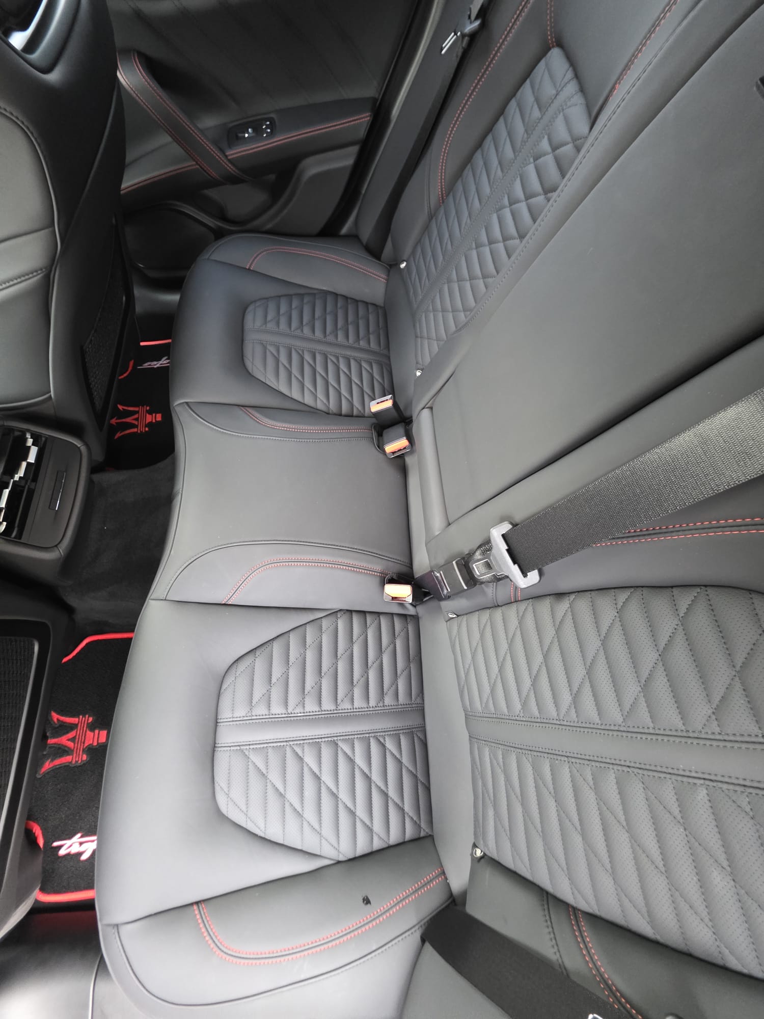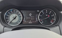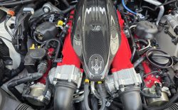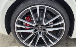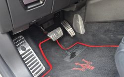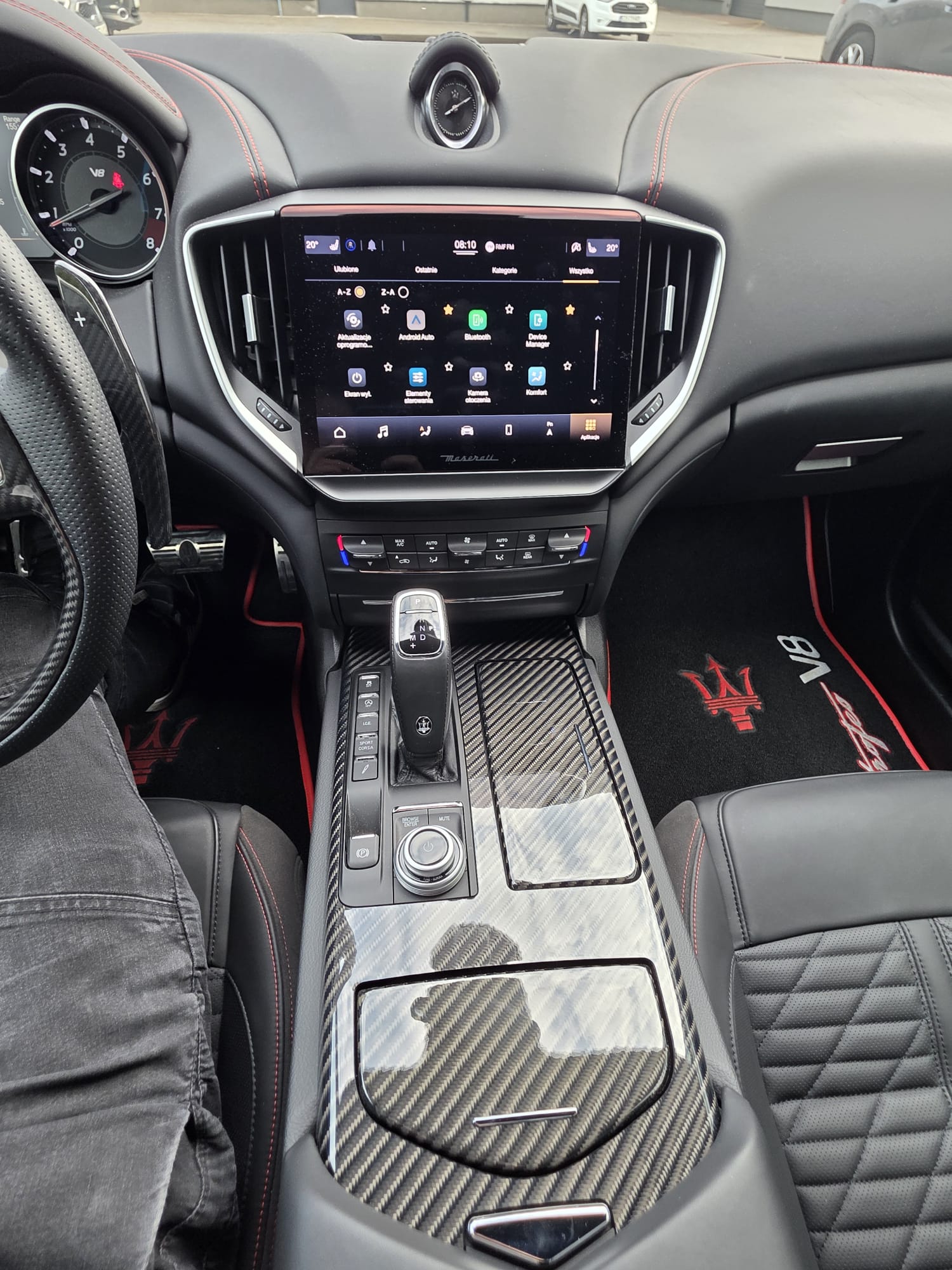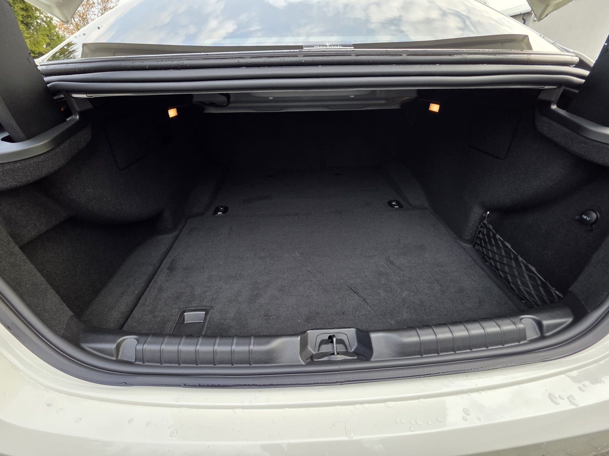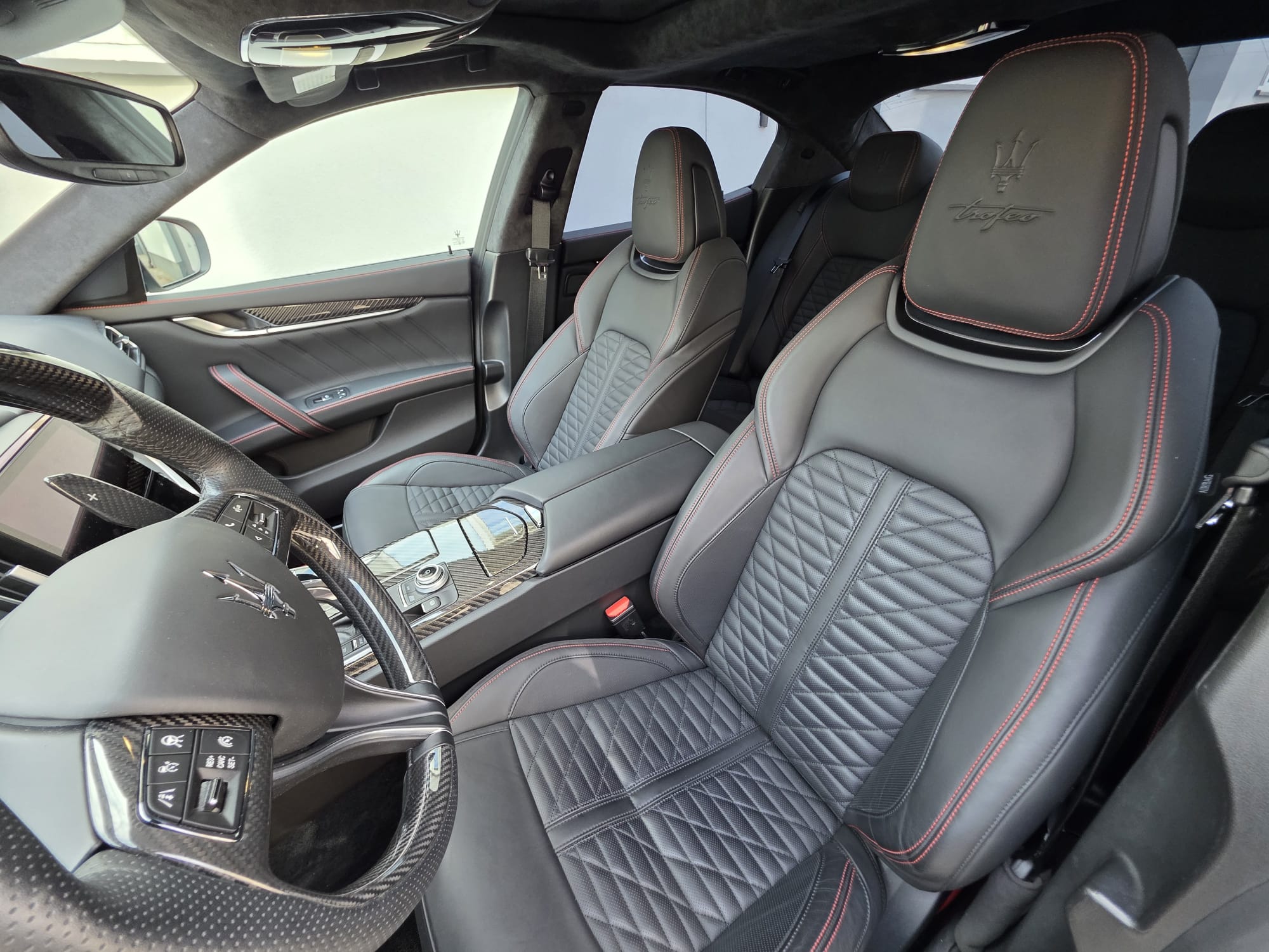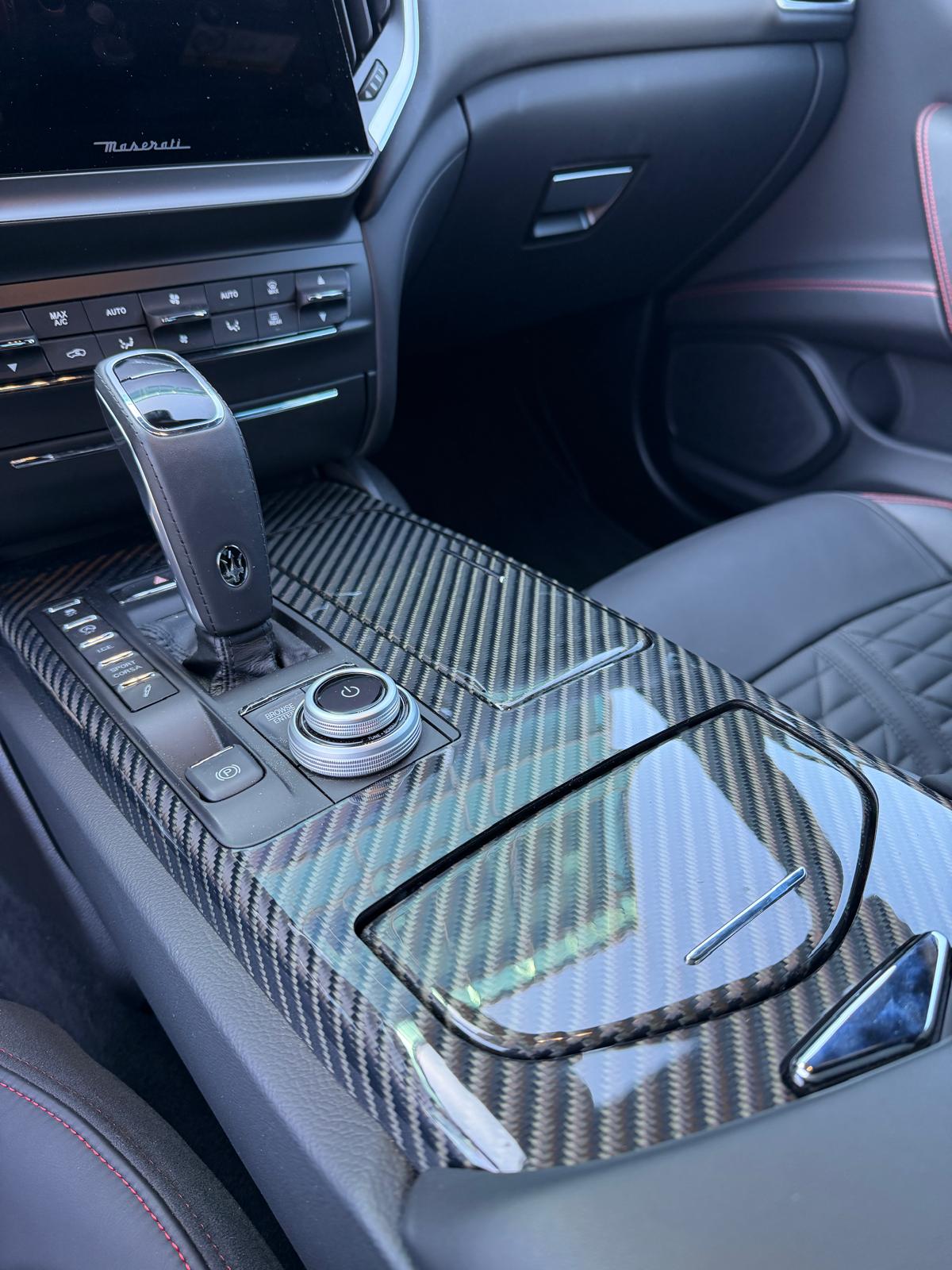 Auto prezentuje się bardzo dobrze wizualnie – eleganckie białe nadwozie z czarnymi dodatkami podkreśla jego dynamiczną sylwetkę. Całość uzupełniają sportowe felgi z czerwonymi zaciskami hamulcowymi oraz charakterystyczne dla Maserati wloty powietrza. Panoramiczny dach dodaje prestiżu i przestronności.