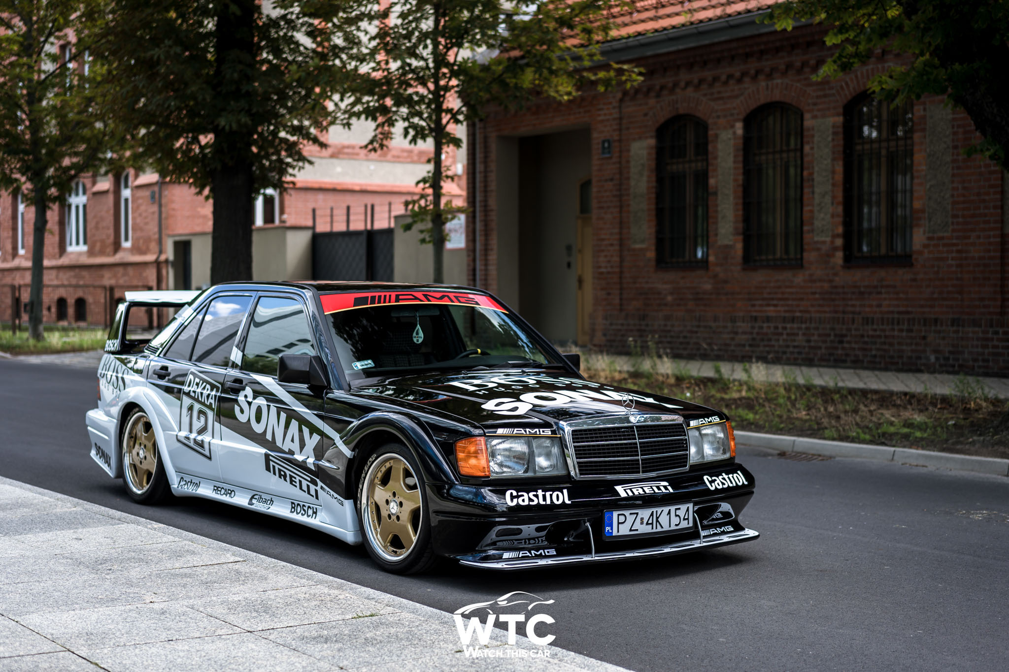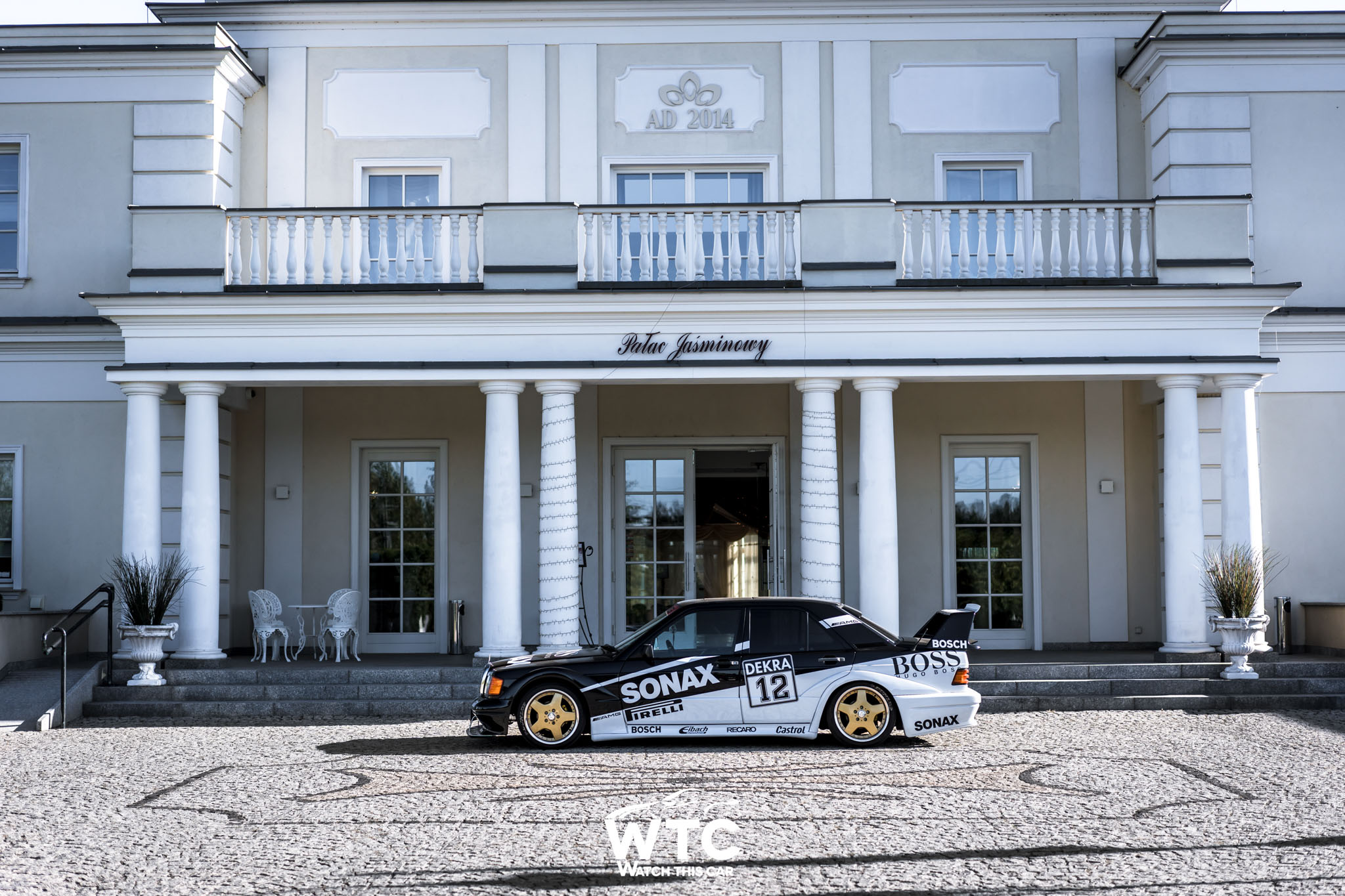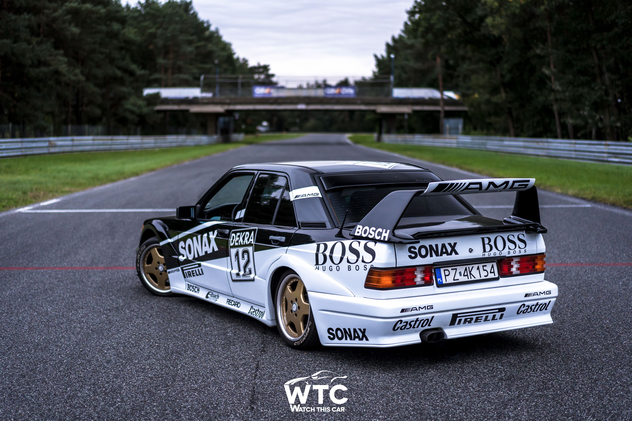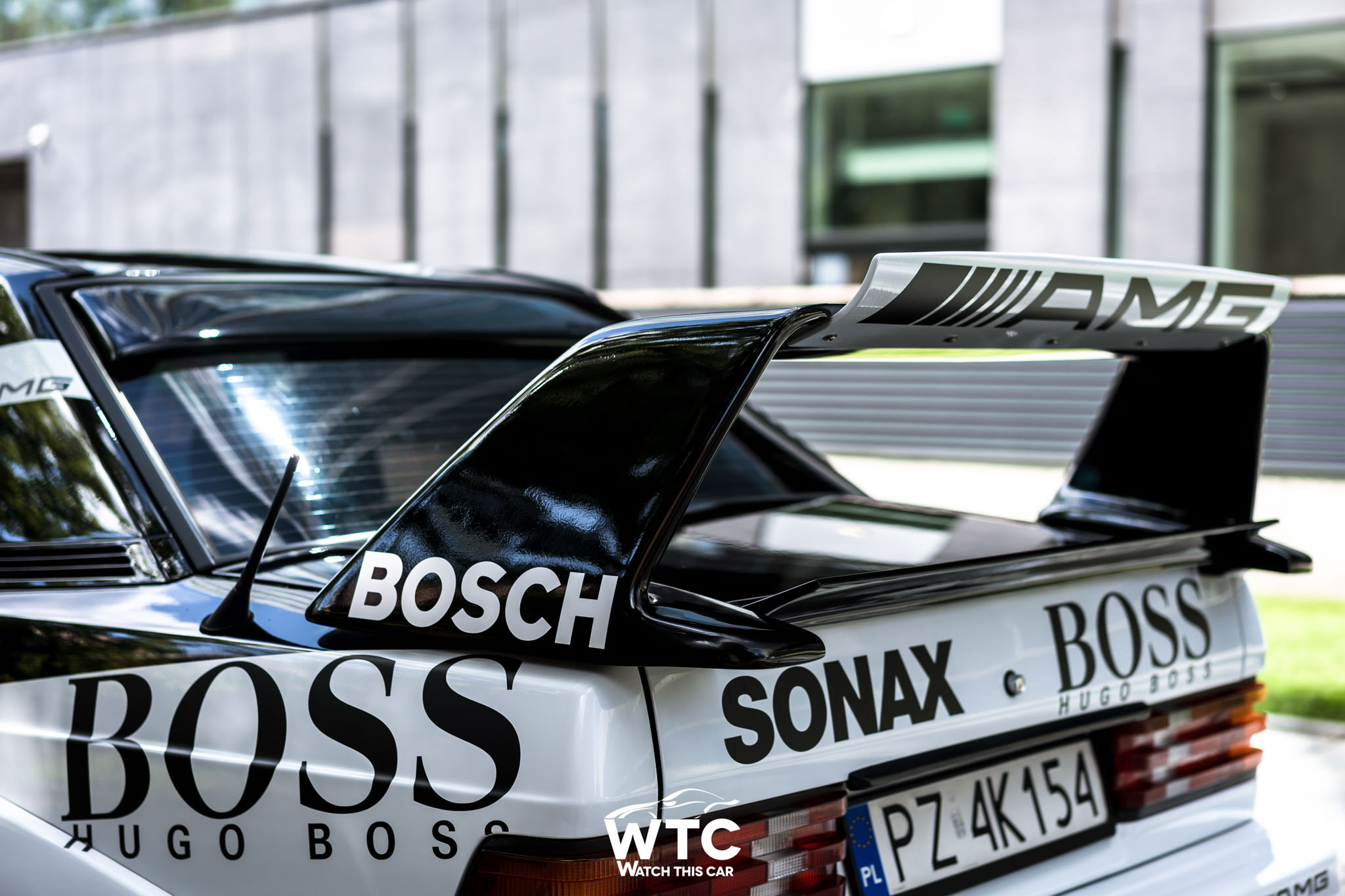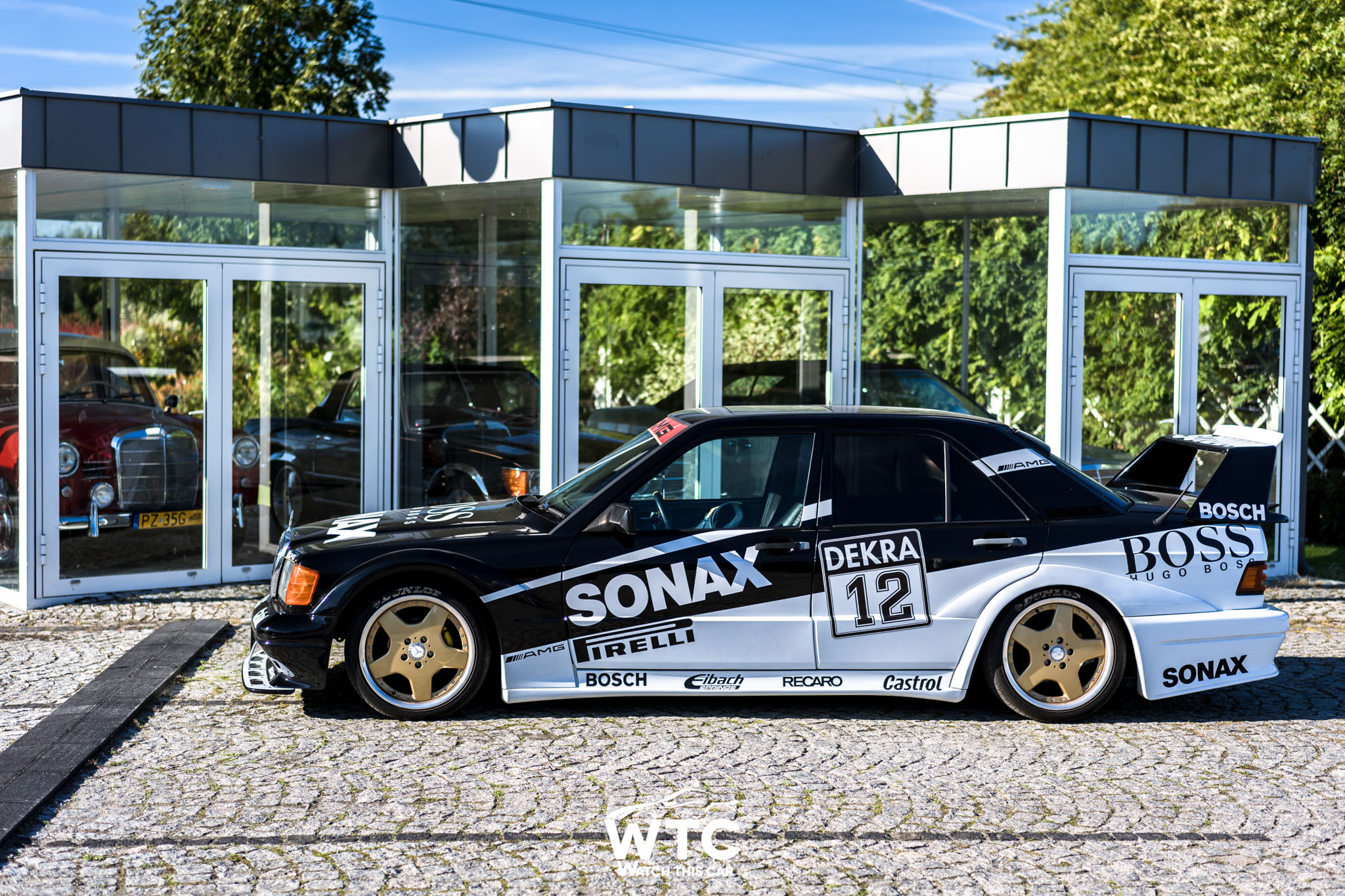 Mercedes 190E EVO II powstał wyłącznie w 500 sztukach, ale już jego bazy, czyli zwykłej 190tki, powstało niemal 2 miliony. To tworzy naturalną pokusę, by samemu zbudować auto odwzorowujące swoją najsłynniejszą w historii odmianę. Monstrualny pakiet aerodynamiczny powstał na potrzeby serii wyścigowej DTM. Był to legendarny powrót fabrycznego zespołu Mercedesa do wyścigów po przerwie trwającej od 1955 roku. 50 zwycięstw w latach 1988–1993 i prawdziwa kulminacja w sezonie 1992, w którym model 190E 2.5-16 Evo II wygrał 16 z 24 wyścigów i zajął trzy pierwsze miejsca w klasyfikacji kierowców. Oklejenie tego egzemplarza (Sonax/Boss) nawiązuje do samochodu ówczesnego zdobywcy tytułu mistrzowskiego – Klausa Ludwiga.