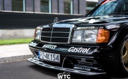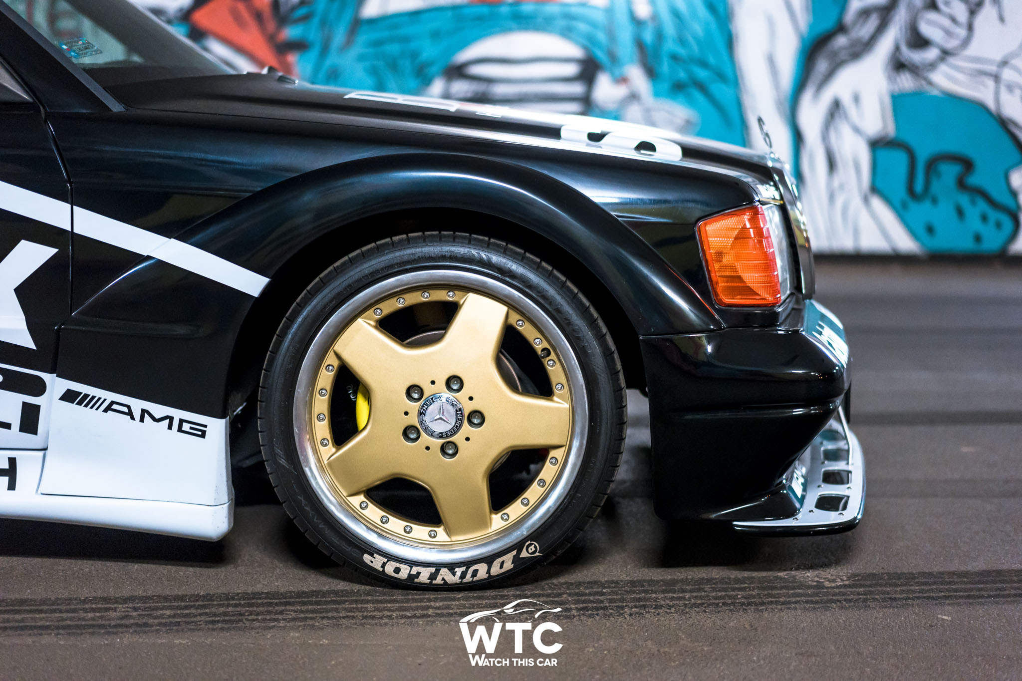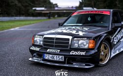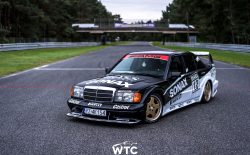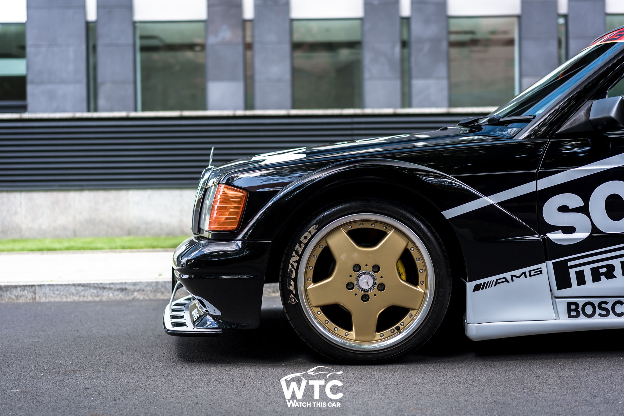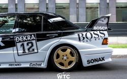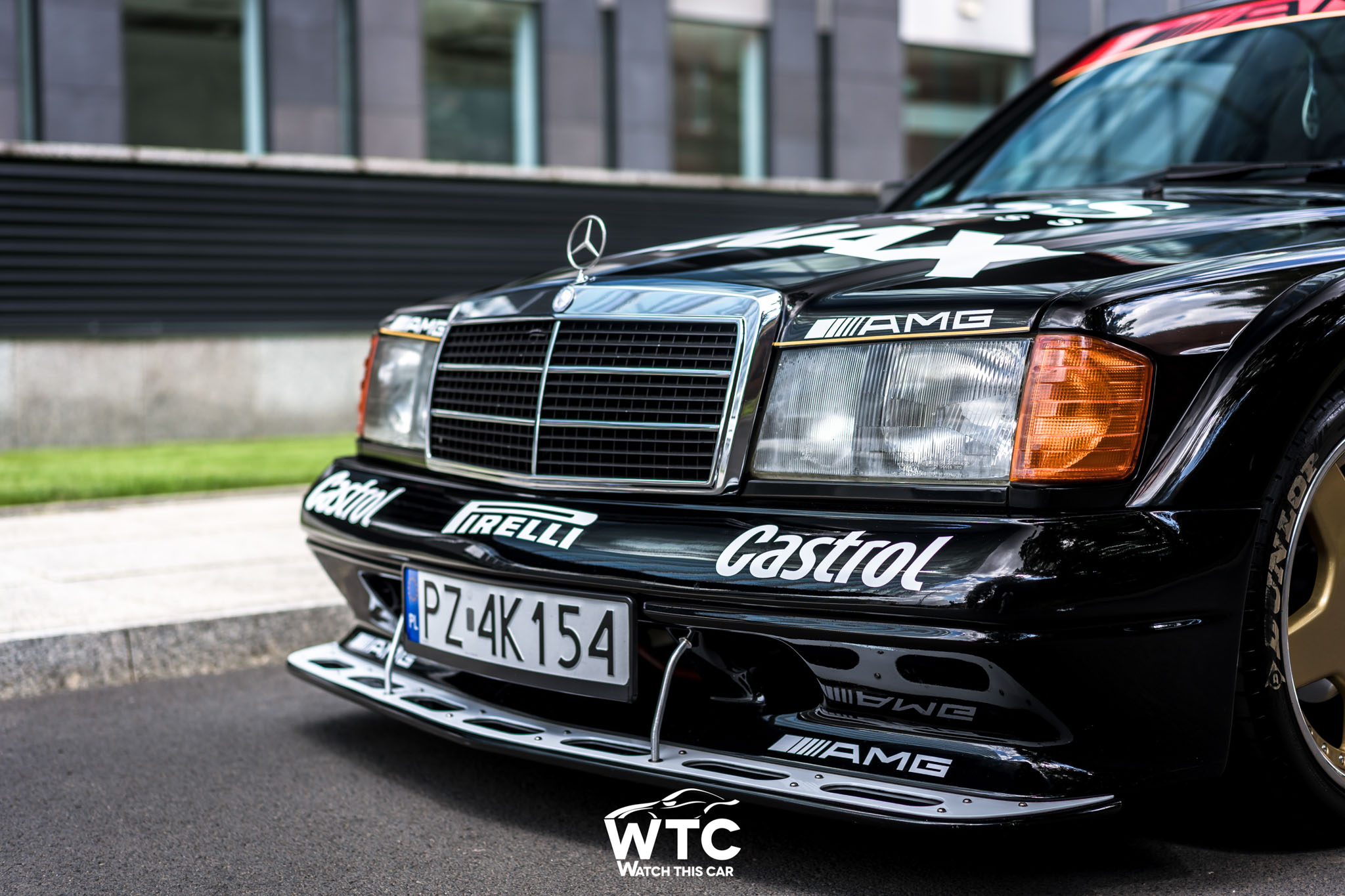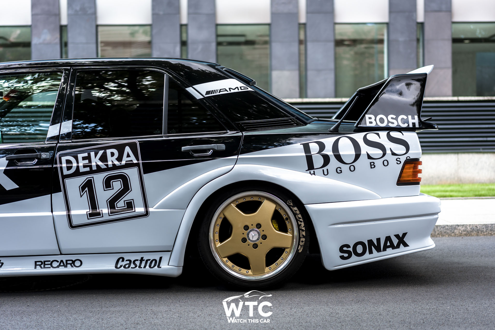 Mercedes 190E EVO II powstał wyłącznie w 500 sztukach, ale już jego bazy, czyli zwykłej 190tki, powstało niemal 2 miliony. To tworzy naturalną pokusę, by samemu zbudować auto odwzorowujące swoją najsłynniejszą w historii odmianę. Monstrualny pakiet aerodynamiczny powstał na potrzeby serii wyścigowej DTM. Był to legendarny powrót fabrycznego zespołu Mercedesa do wyścigów po przerwie trwającej od 1955 roku. 50 zwycięstw w latach 1988–1993 i prawdziwa kulminacja w sezonie 1992, w którym model 190E 2.5-16 Evo II wygrał 16 z 24 wyścigów i zajął trzy pierwsze miejsca w klasyfikacji kierowców. Oklejenie tego egzemplarza (Sonax/Boss) nawiązuje do samochodu ówczesnego zdobywcy tytułu mistrzowskiego – Klausa Ludwiga.