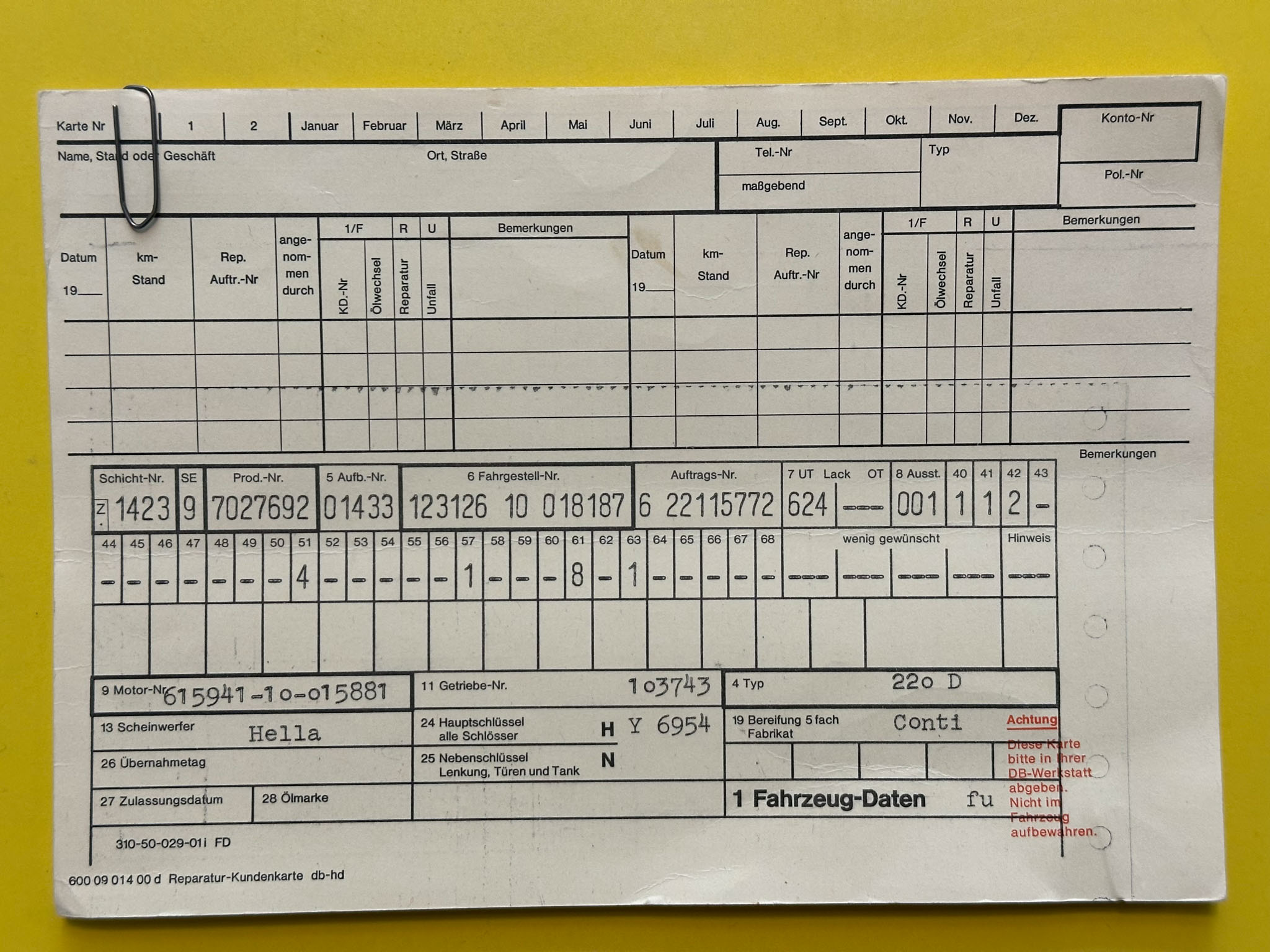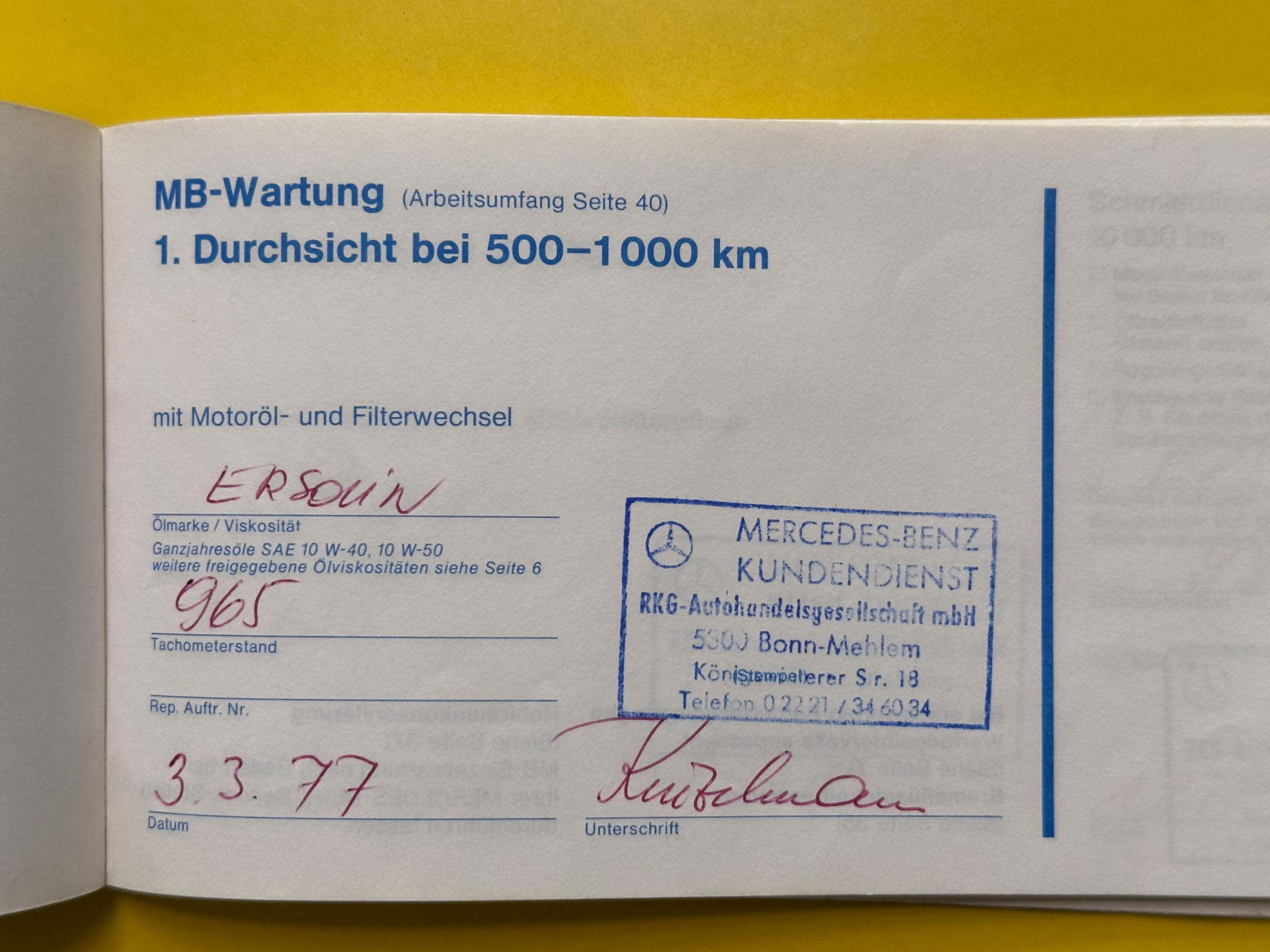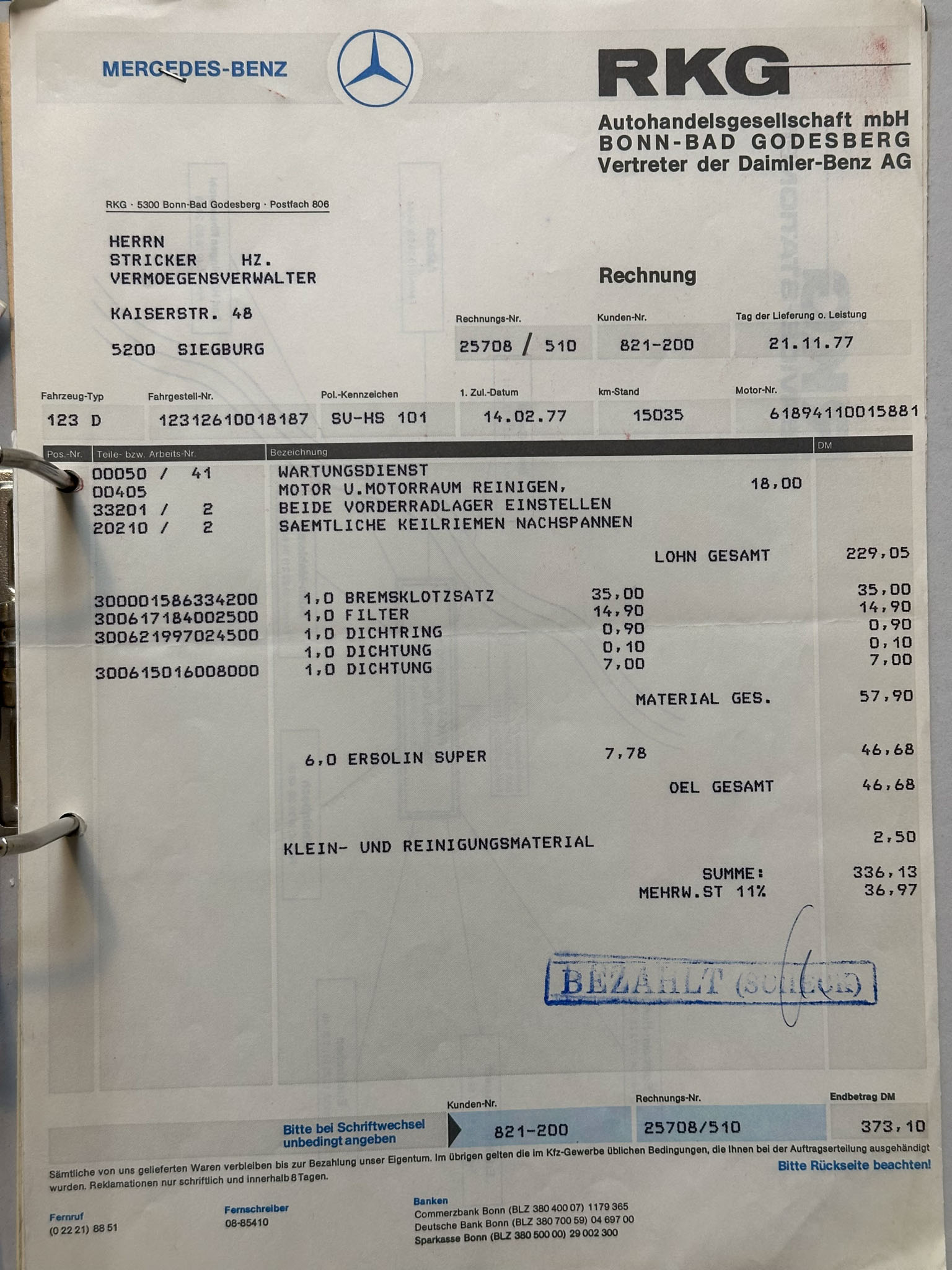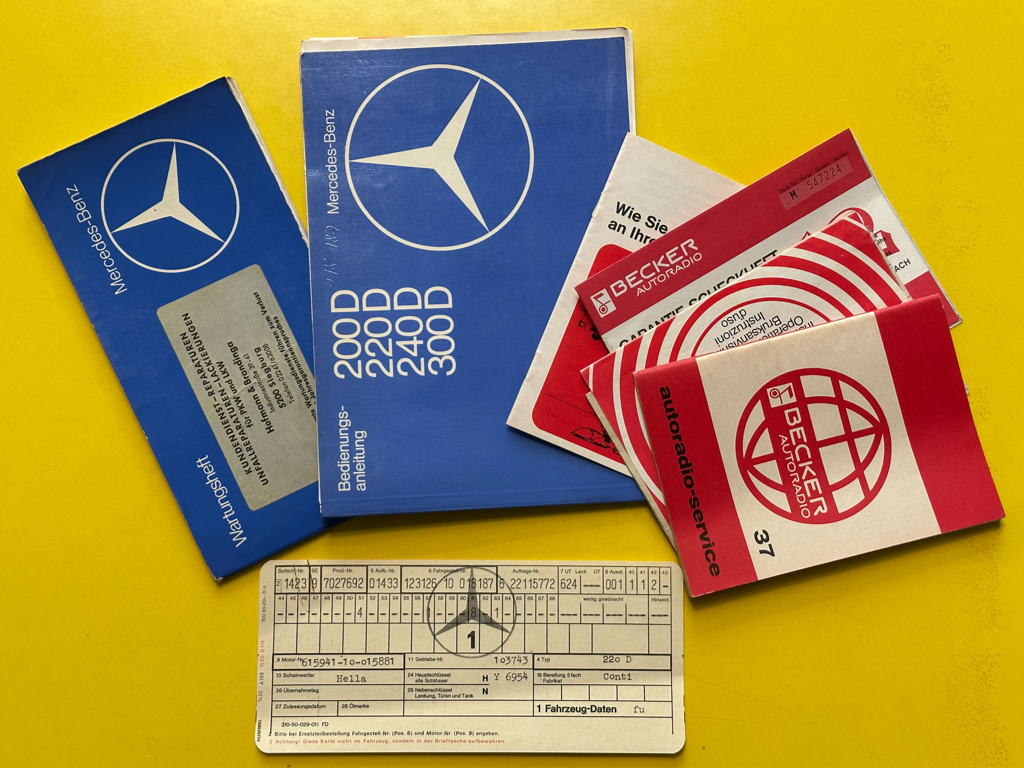 Mercedes-Benz w123 220D, którego oferuję, to wyjątkowo wczesny egzemplarz, bo pochodzący z 1977 roku. Kupiłem go od drugiego właściciela w Niemczech, który przez ostatnie 20 lat zrobił nim 4000 km. Pierwszy właściciel używał go na co dzień do 1989 roku, a do 2004 po prostu wymieniał tylko akumulatory i oleje, robiąc minimalne przebiegi. Wszystko jest perfekcyjnie udokumentowane – beczka była regularnie serwisowana do samego końca, a do 2004 roku wyłącznie w serwisie Mercedesa. Do auta są wszystkie książki i instrukcje, a także oryginalna faktura zakupu z 1977 roku.