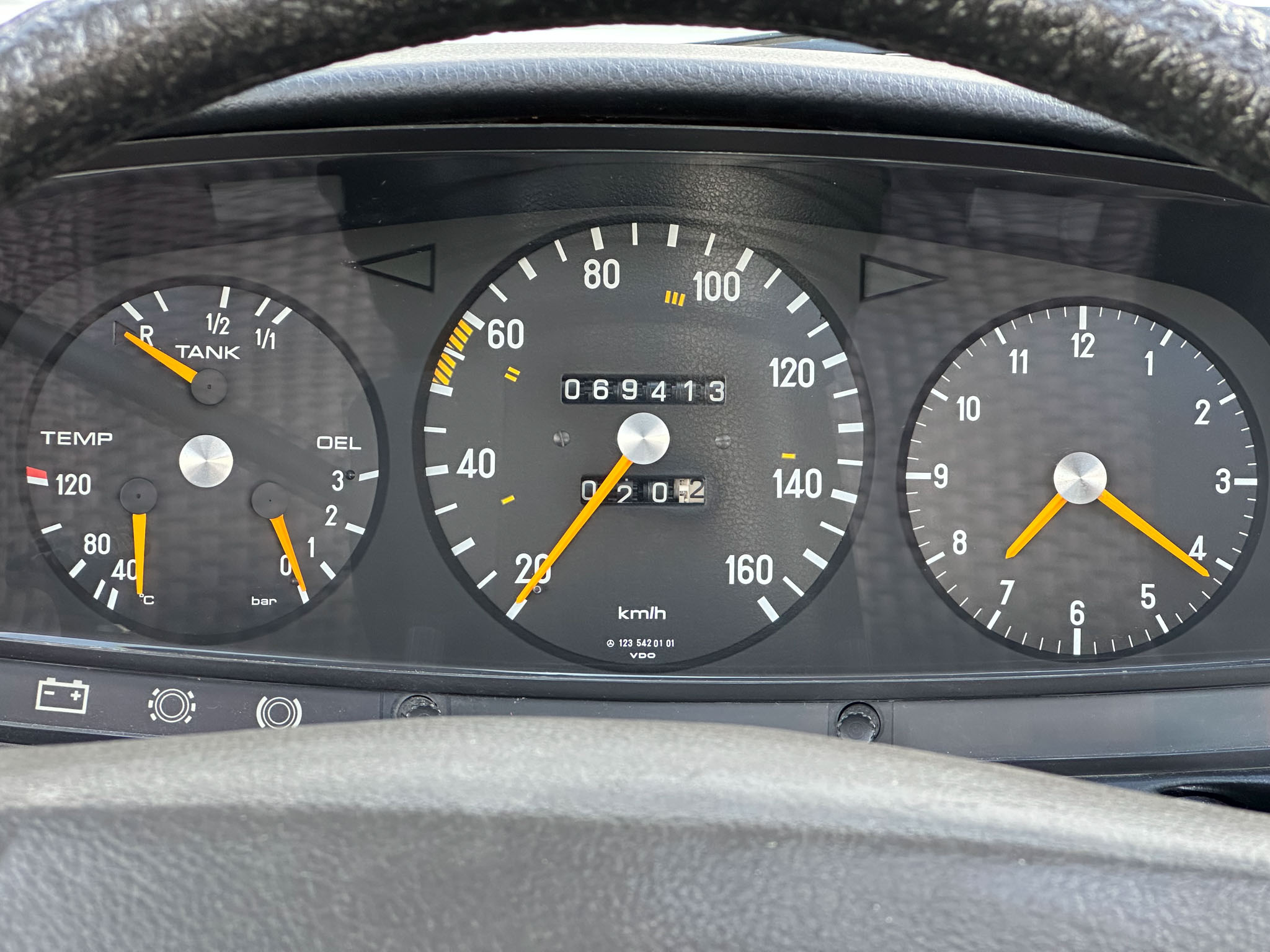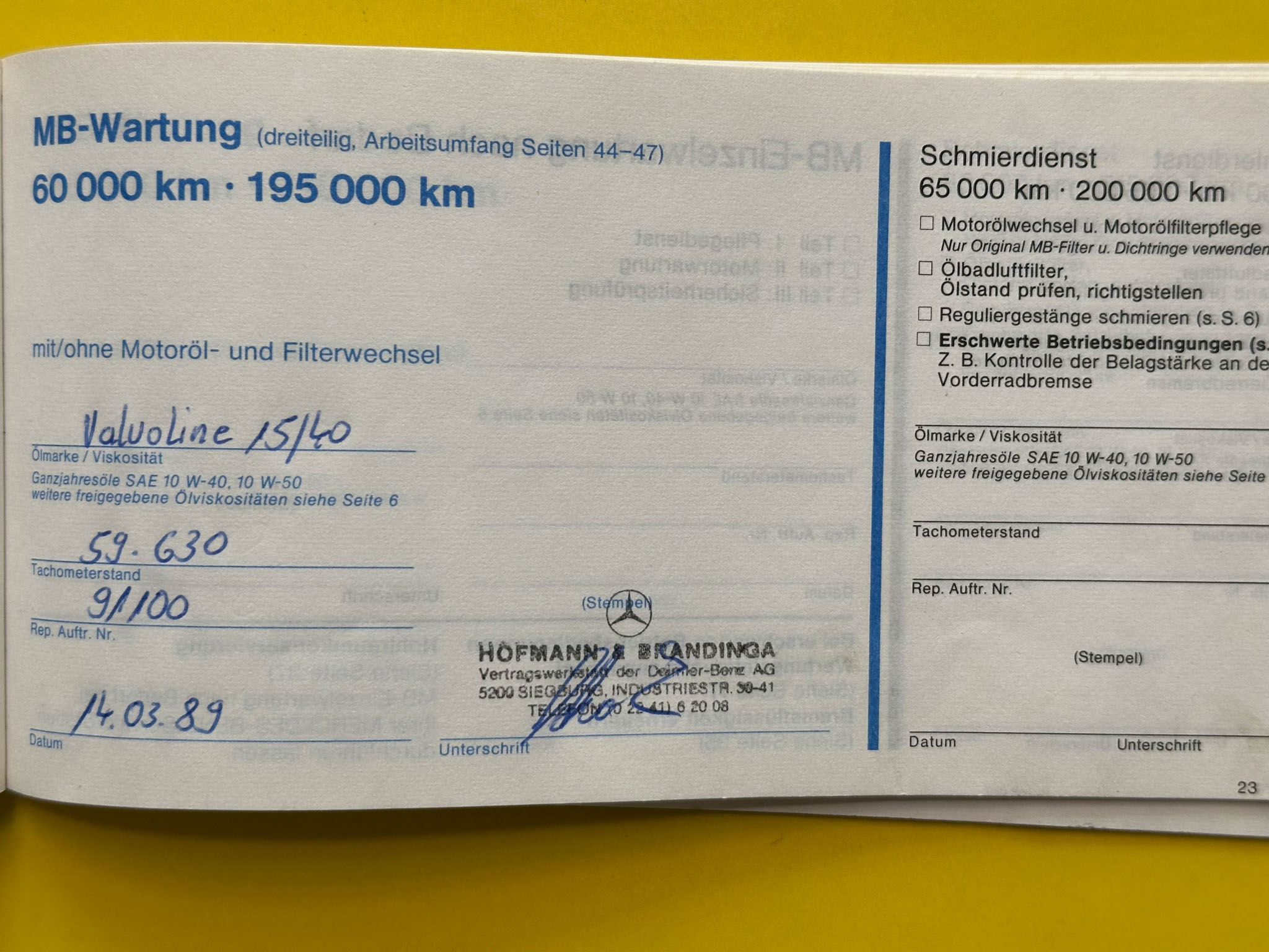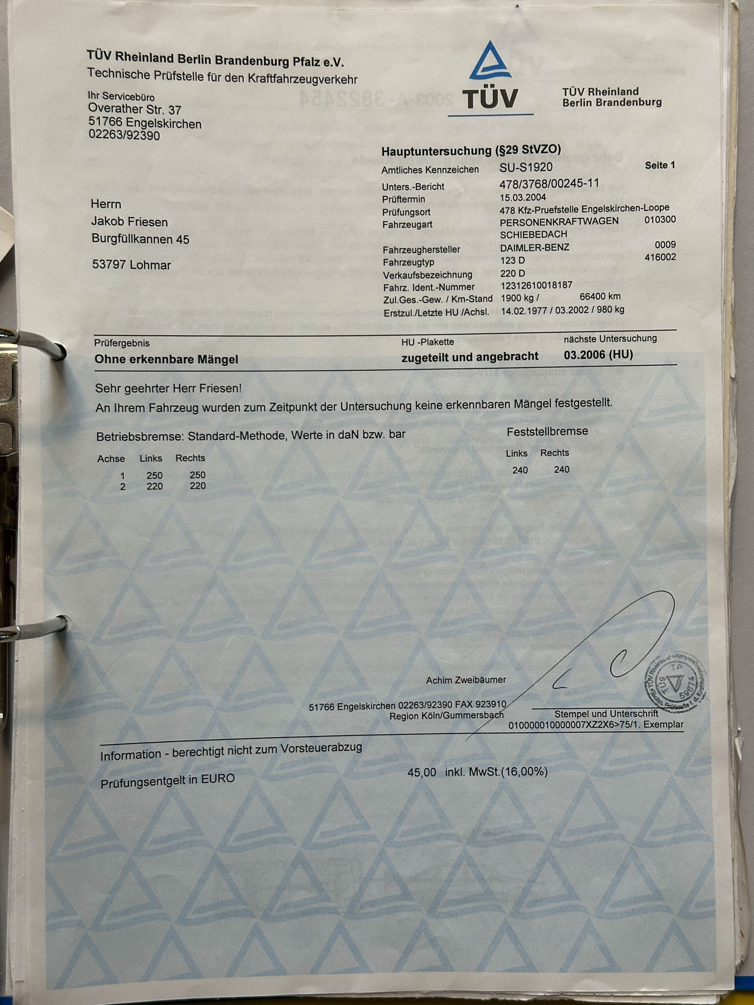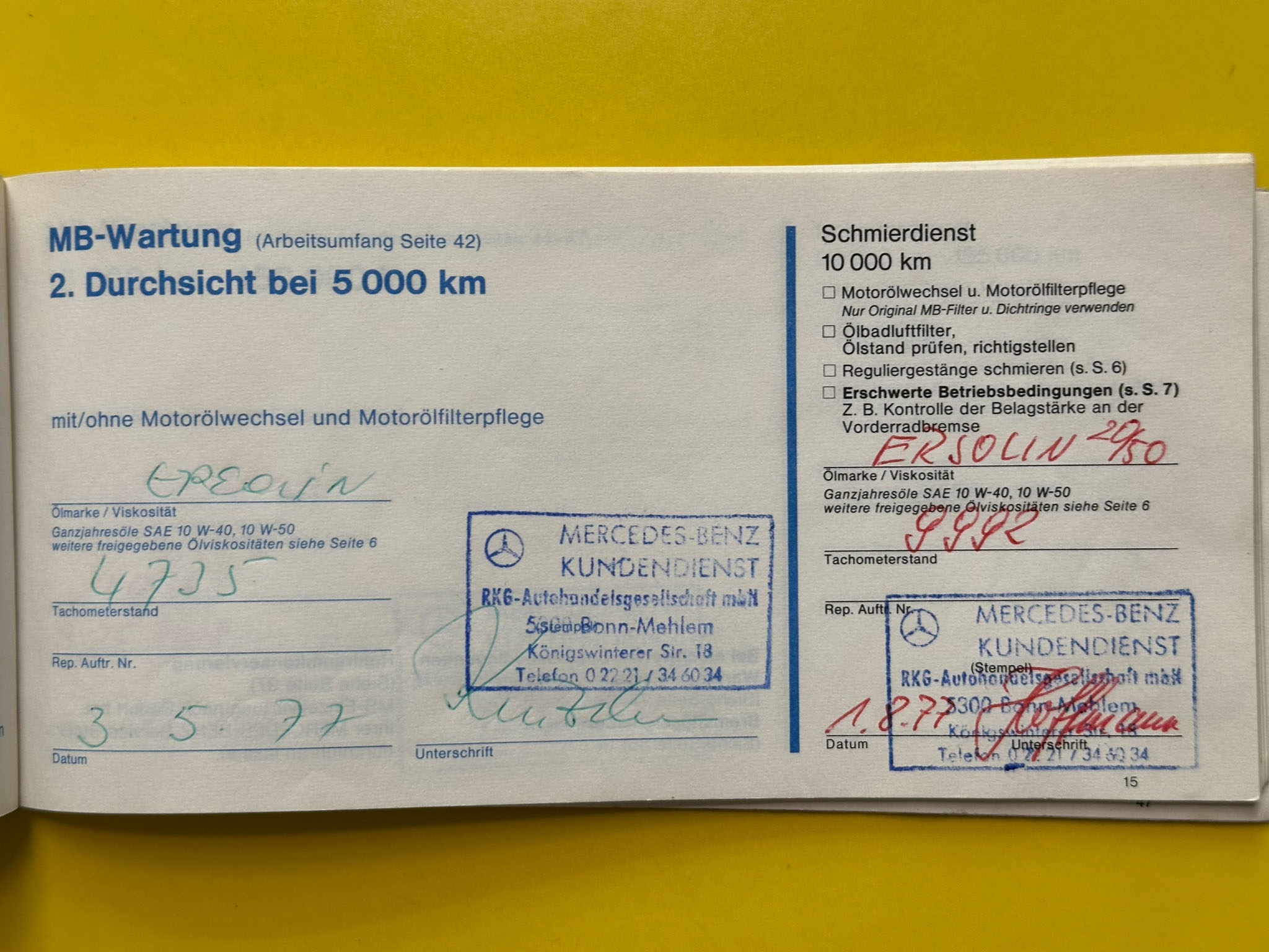 Mercedes-Benz w123 220D, którego oferuję, to wyjątkowo wczesny egzemplarz, bo pochodzący z 1977 roku. Kupiłem go od drugiego właściciela w Niemczech, który przez ostatnie 20 lat zrobił nim 4000 km. Pierwszy właściciel używał go na co dzień do 1989 roku, a do 2004 po prostu wymieniał tylko akumulatory i oleje, robiąc minimalne przebiegi. Wszystko jest perfekcyjnie udokumentowane – beczka była regularnie serwisowana do samego końca, a do 2004 roku wyłącznie w serwisie Mercedesa. Do auta są wszystkie książki i instrukcje, a także oryginalna faktura zakupu z 1977 roku.
