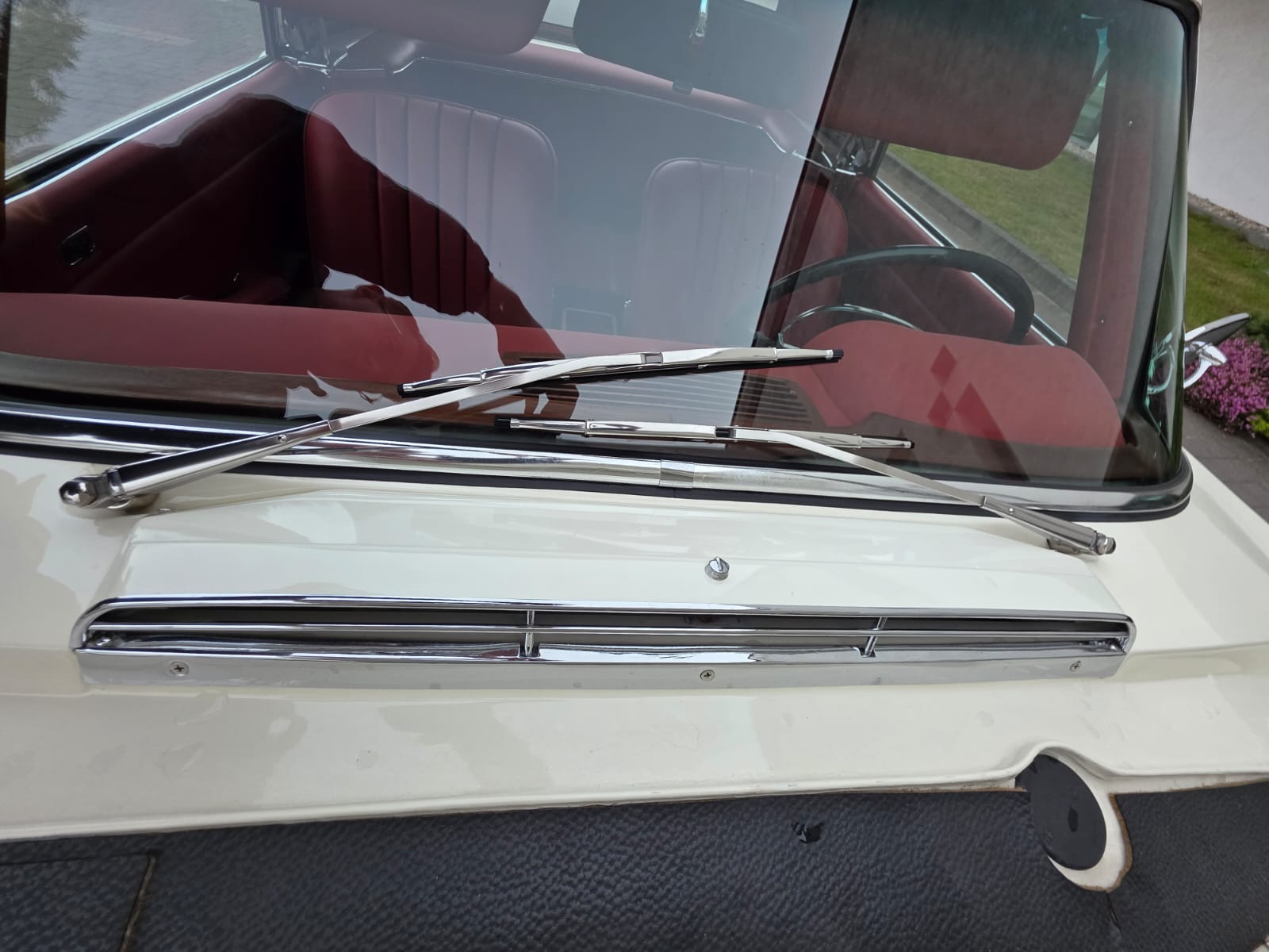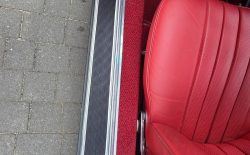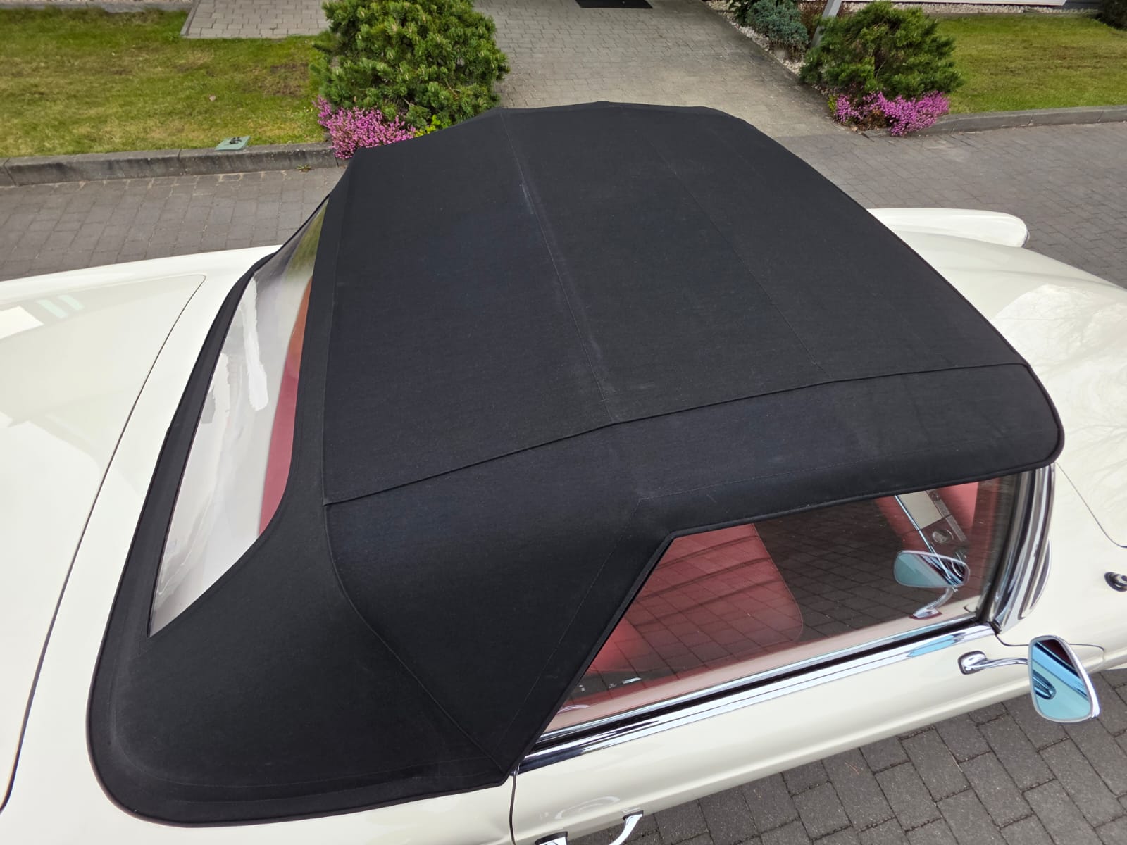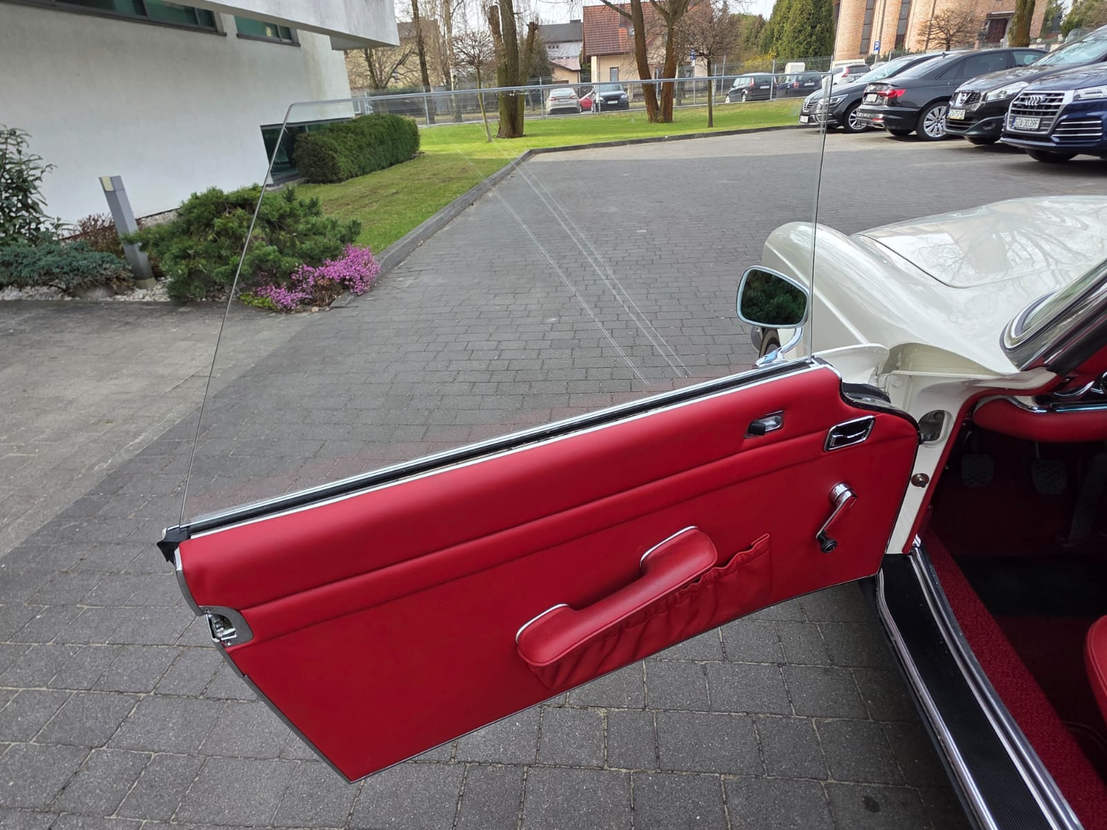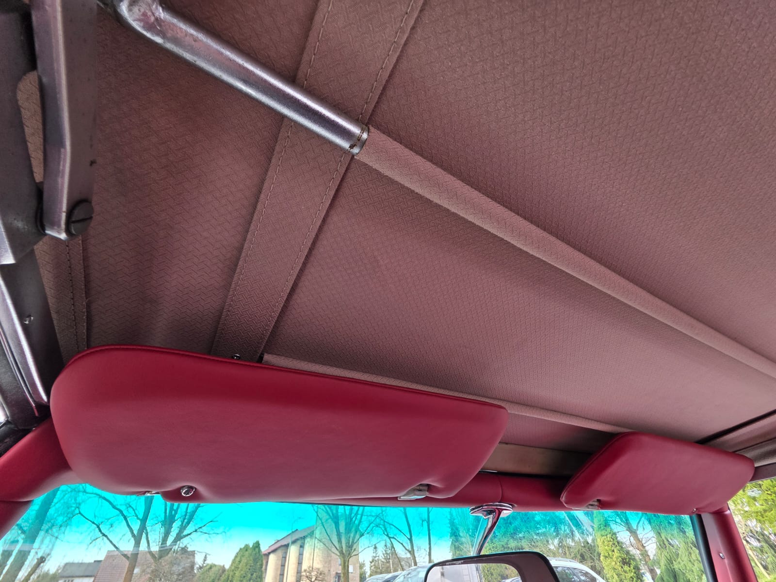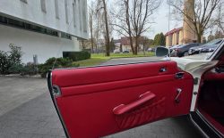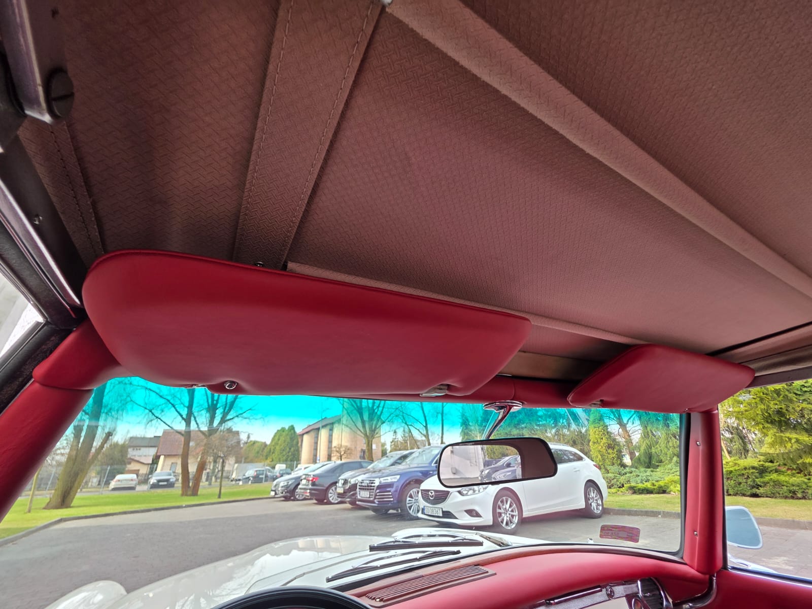 Auto prezentuje się bardzo dobrze wizualnie – klasyczne połączenie białego lakieru z czerwonym wnętrzem i czarnym miękkim dachem. Wnętrze utrzymane w dobrym stanie, tapicerka zadbana. Samochód ma zamontowane całkowicie nowe poszycie dachu.