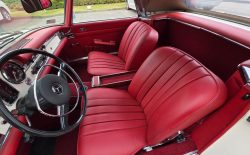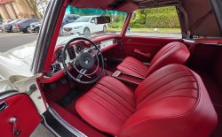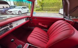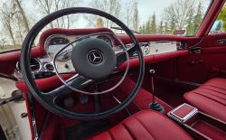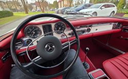 Piękne linie i kształty od lat mają swoich fanów. Mercedes SL Pagoda jest jednym z najbardziej rozpoznawalnych klasyków na świecie. Mercedes 250 SL W113 to druga seria modelu, produkowana od grudnia 1966 do stycznia 1968 roku, czyli tylko nieco ponad rok. W rezultacie wyprodukowano tylko 5196 sztuk, co czyni z 250-tki zdecydowanie najrzadszą wersję z trzech serii produkcyjnych modelu Pagoda. Zmiany w stosunku do 230 SL obejmowały zwiększenie skoku tłoka o 6 mm, zmianę z czterech na siedem łożysk głównych, sztywniejsze zawieszenie oraz zastosowanie tylnych hamulców tarczowych i ulepszonych pasów bezpieczeństwa. Moc pozostała taka sama, ale moment obrotowy wzrósł, dzięki czemu auto chętniej nabierało obrotów. Ten egzemplarz ma manualną skrzynię biegów, co nadaje mu nieco sportowego sznytu. Wóz został gruntownie odrestaurowany, ma piękną konfigurację kolorów i prezentuje się świetnie.
