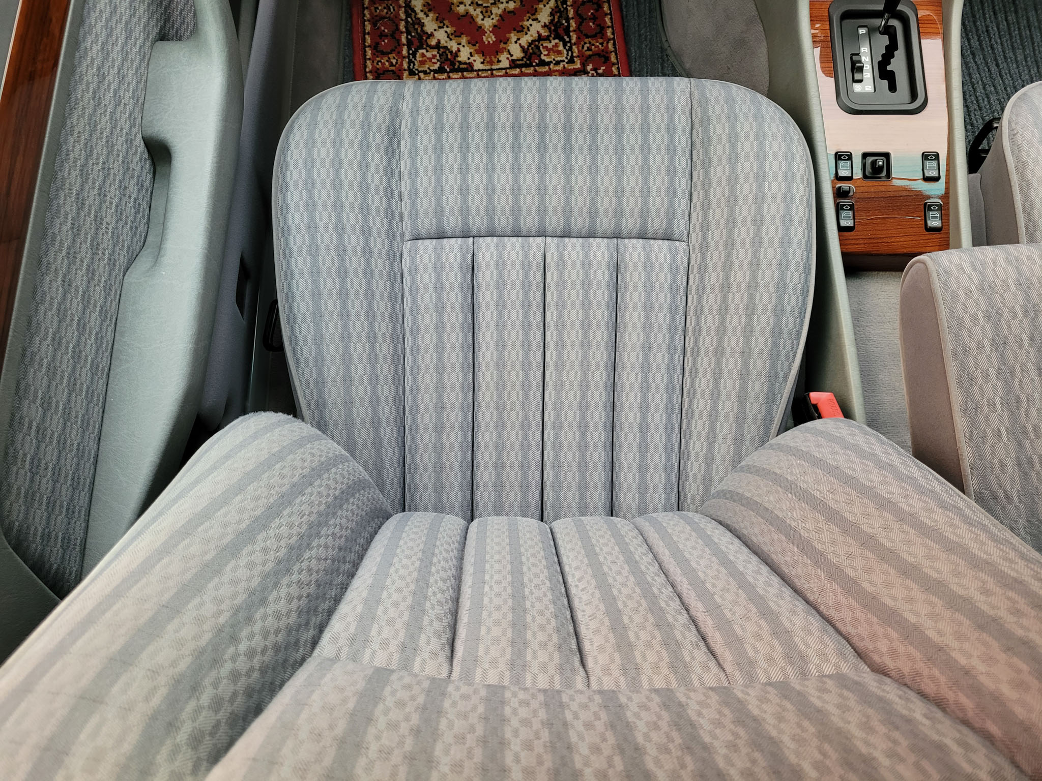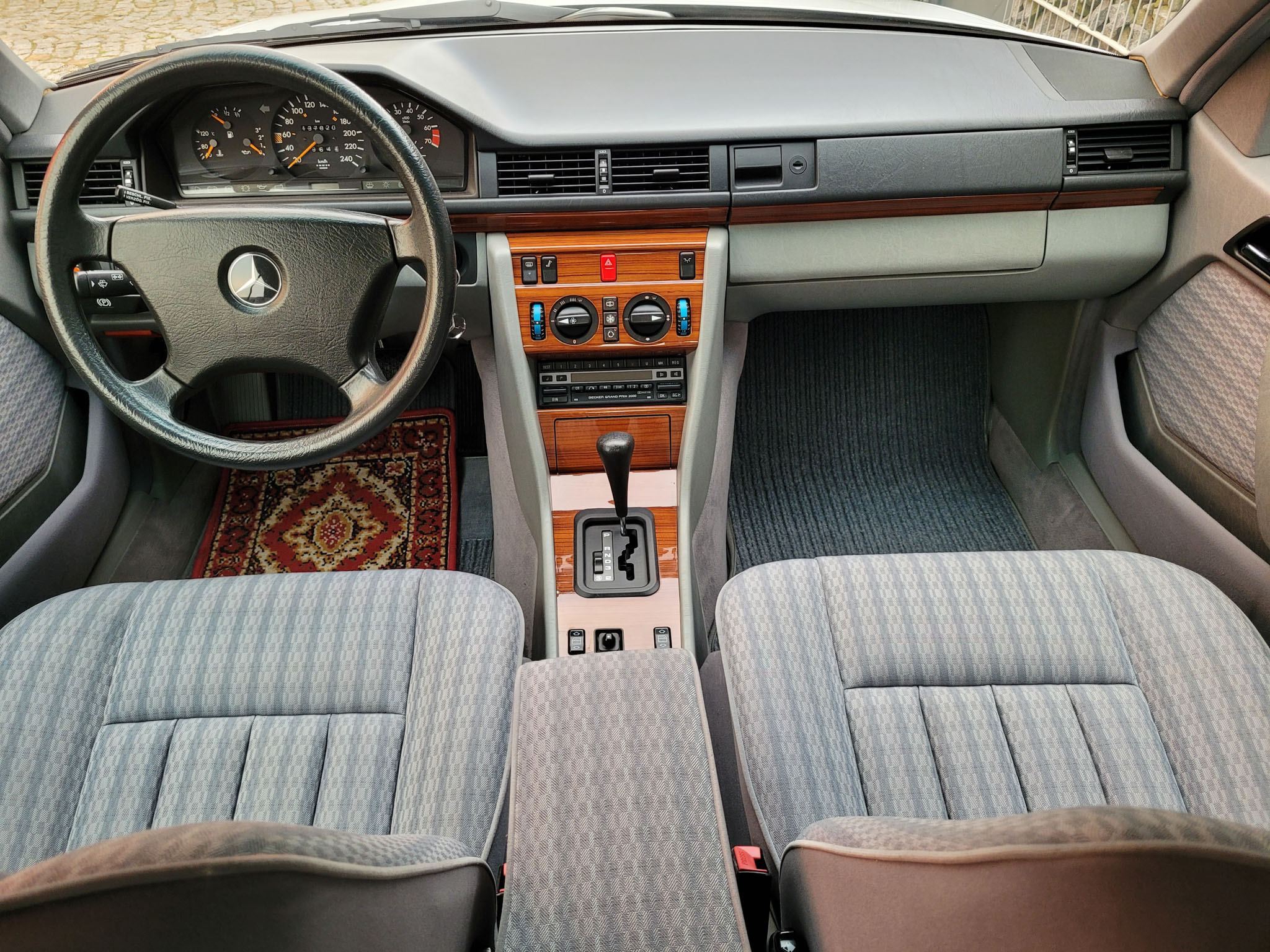 Wnętrze zachowane w bardzo dobrym stanie, widoczne jedynie minimalne ślady użytkowania. Materiałowa tapicerka nie posiada przetarć czy uszkodzeń. Żadne elementy nie były obszywane czy poddawane regeneracji. Oryginalne radio Becker Grand Prix 2000. Na wyposażeniu oryginalne dywaniki rypsowe w idealnym stanie. Elementy drewniane w niesamowitym stanie, jak nowe, mają bardzo żywy kolor, jedno niewielkie pęknięcie w standardowym miejscu dla w124 – przy przyciskach otwierania szyb. Podsufitka jak nowa. Plastiki matowe bez rys czy pęknięć. Kierownica i wybierak idealnie utrzymane, nie regenerowane. Podłokietnik jak nowy.