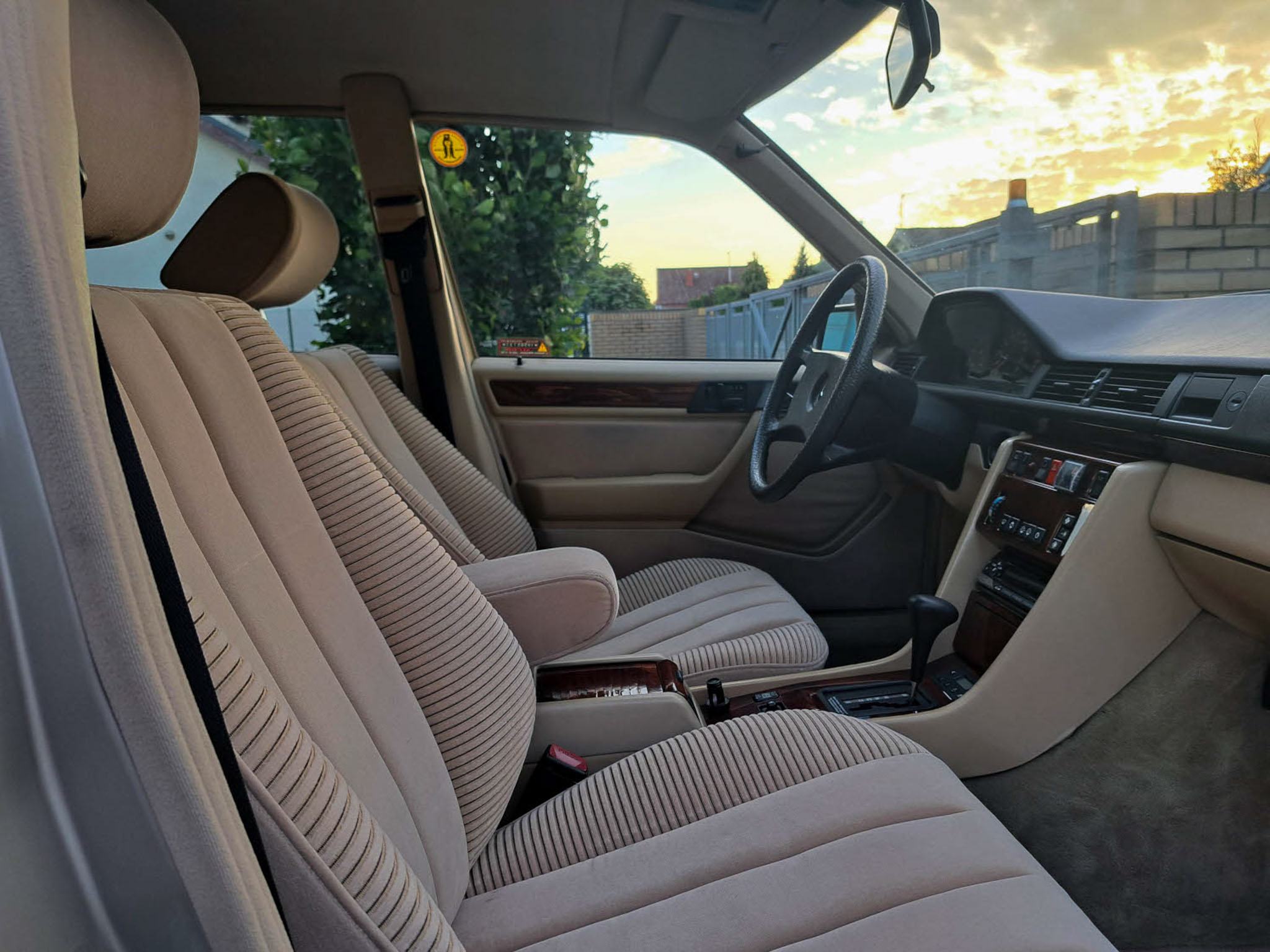 Na sprzedaż Mercedes 300 D Turbo limuzyna W124 w kolorze 702 „Rauchsilber Metallic” z jasnobeżową welurową tapicerką.