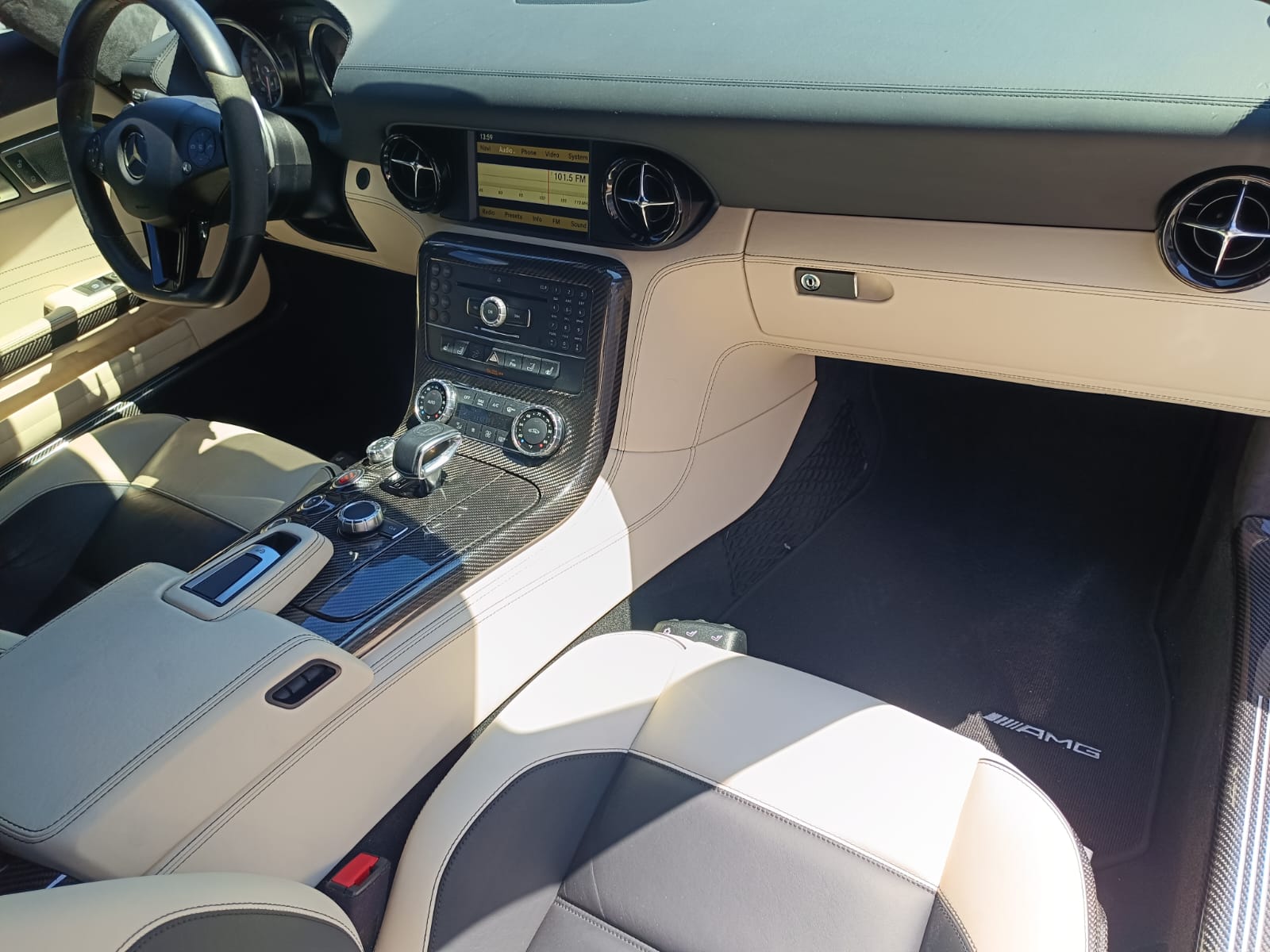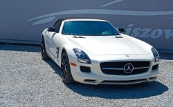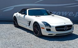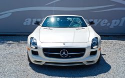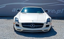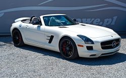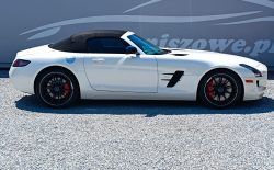 Posiadamy w ofercie rzadko spotykanego na naszym rynku Mercedesa SLS AMG GT w wersji Roadster w kolorze Designo Mystic White. Biały lakier zestawiono tutaj z beżową, skórzaną tapicerką. Z ogółu 11700 sztuk wszystkich wyprodukowanych SLS-ów nadwozie Roadster stanowiło mniejszość, gdyż wyprodukowano ich około 4000 sztuk. Natomiast w wersji GT wyszła ich zaledwie garstka. Ciekawą cechą konstrukcyjną Mercedesa SLS AMG jest fakt, że jest on niemal w całości wykonany z aluminium. Jedynym odstępstwem jest tutaj rama szyby czołowej. Samochód pochodzi z rynku amerykańskiego, gdzie został kupiony bezpośrednio od jego pierwszego właściciela z Las Vegas jako bezwypadkowy. Samochód w świetnym stanie zarówno od strony mechanicznej, jak i estetycznej. Całe nadwozie zostało oklejone folią PPF. SLS pochodzi z rąk fana marki i kolekcjonera ciekawej motoryzacji. Istnieje możliwość sprzedaży na eksport – wówczas cena będzie wynosić 145 tys. euro (netto).